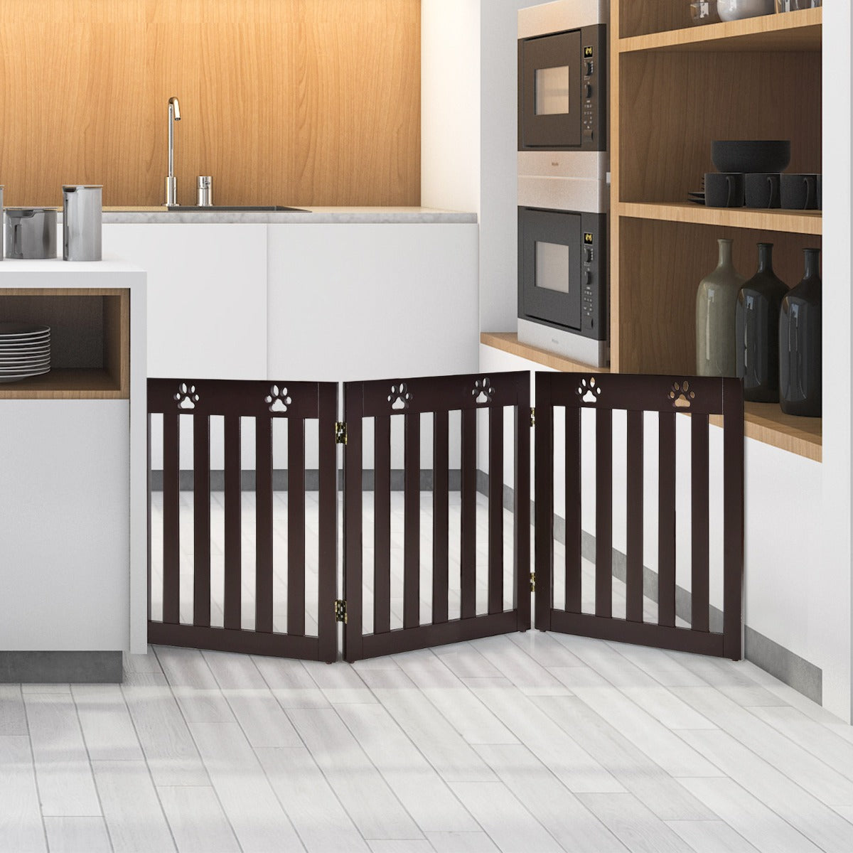 Sturdy Structure & Stylish Addition: Made of quality MDF with NC paint, this wooden pet gate is durable for long time use and waterproof for easy maintenance. And the foot pads on the bottom ensures strong stability while protecting your floor from scratches. Besides, the stylish design can suit any decoration style of your home.