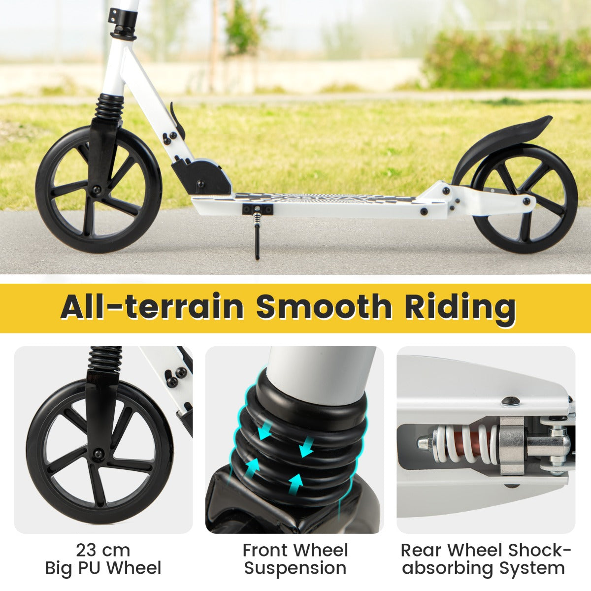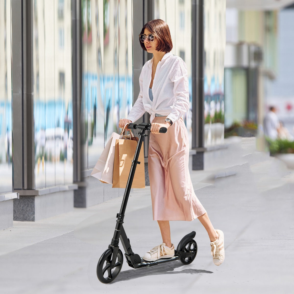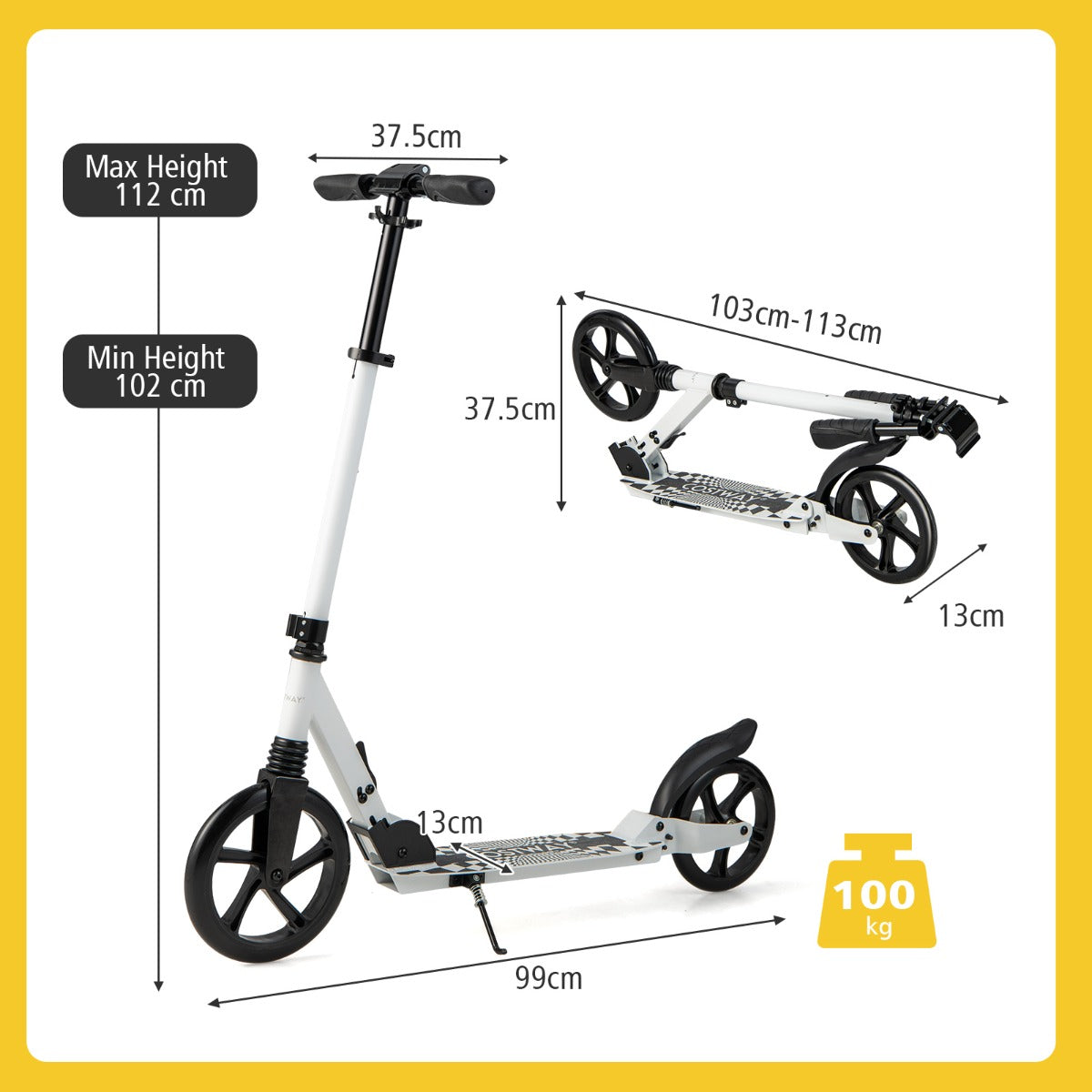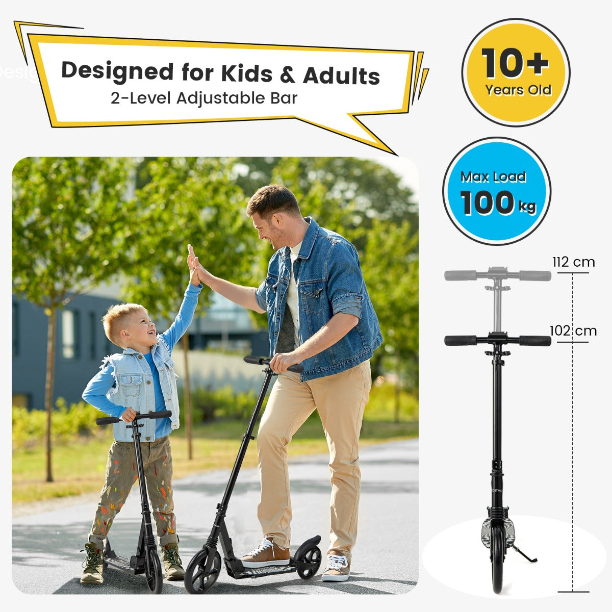 Go outside, use our kick scooter and start exploring the new world. The kick scooter features 2-level adjustable handlebar, ideal for kids, teens and adults. Sturdy aluminium structure makes the scooter hold up to 100 kg. Extra-large PU wheels with suspension system effectively absorb shock and move smoothly on various roads. More, the comfortable grips, non-slip deck and responsive brakes greatly improve safety. If you want to carry the scooter outside, one-second folding design and super lightweight will bring you much convenience.