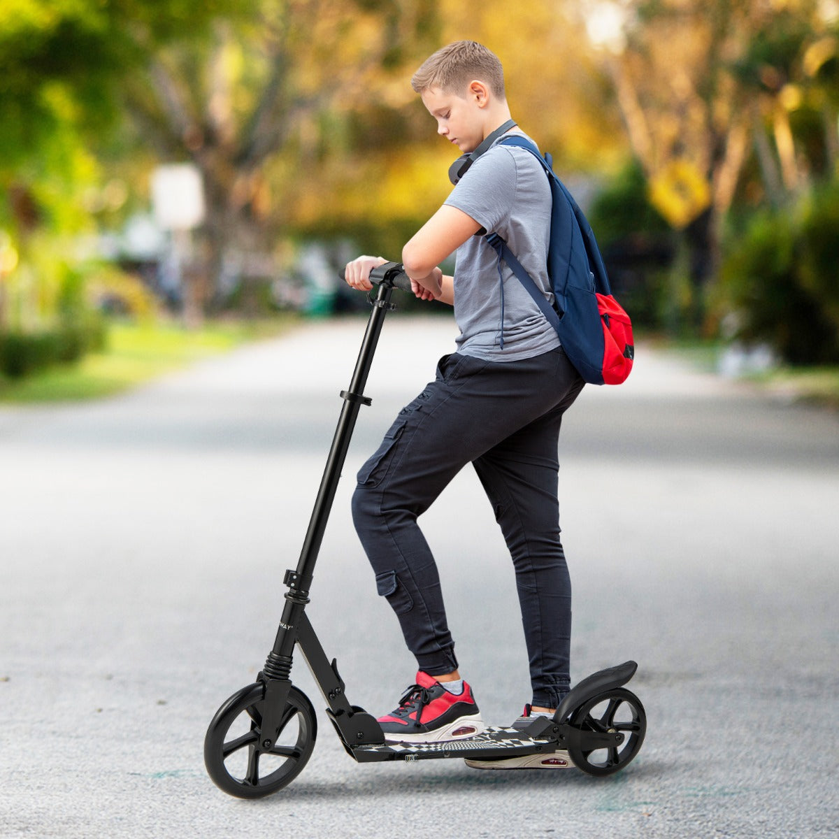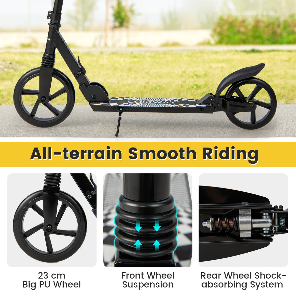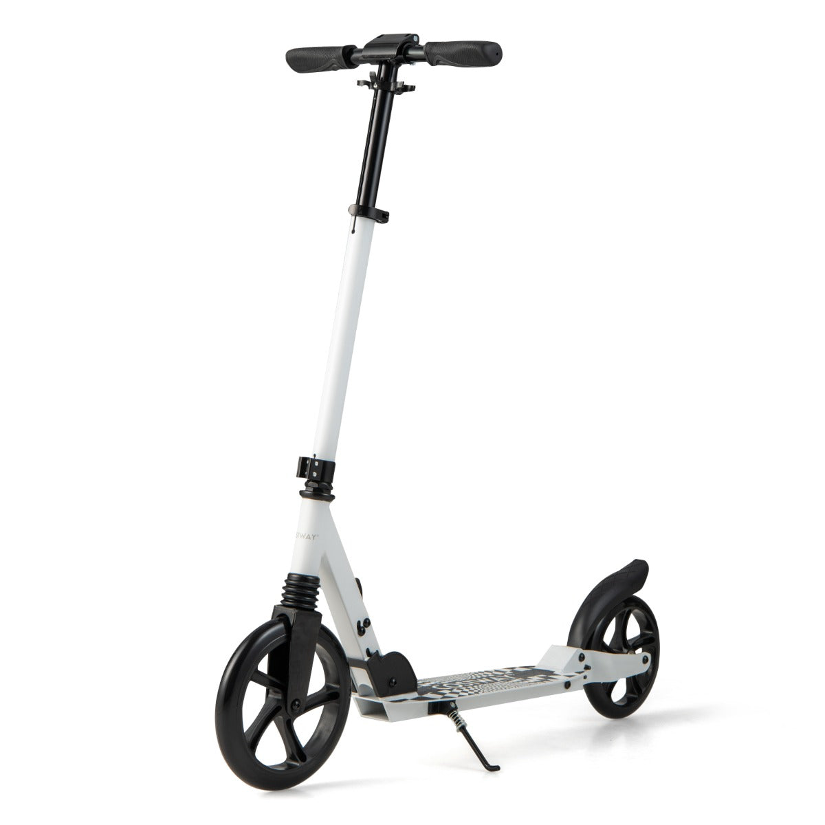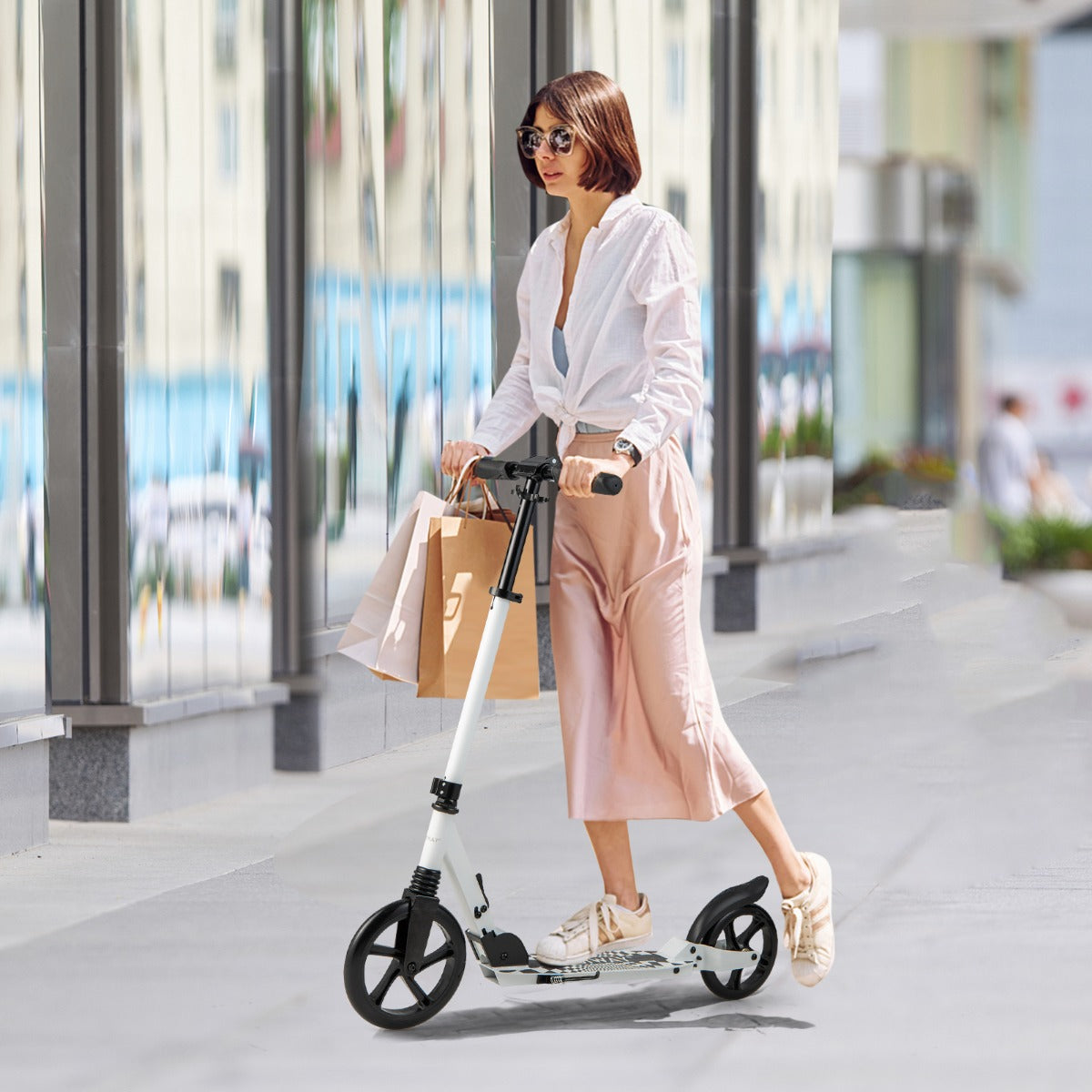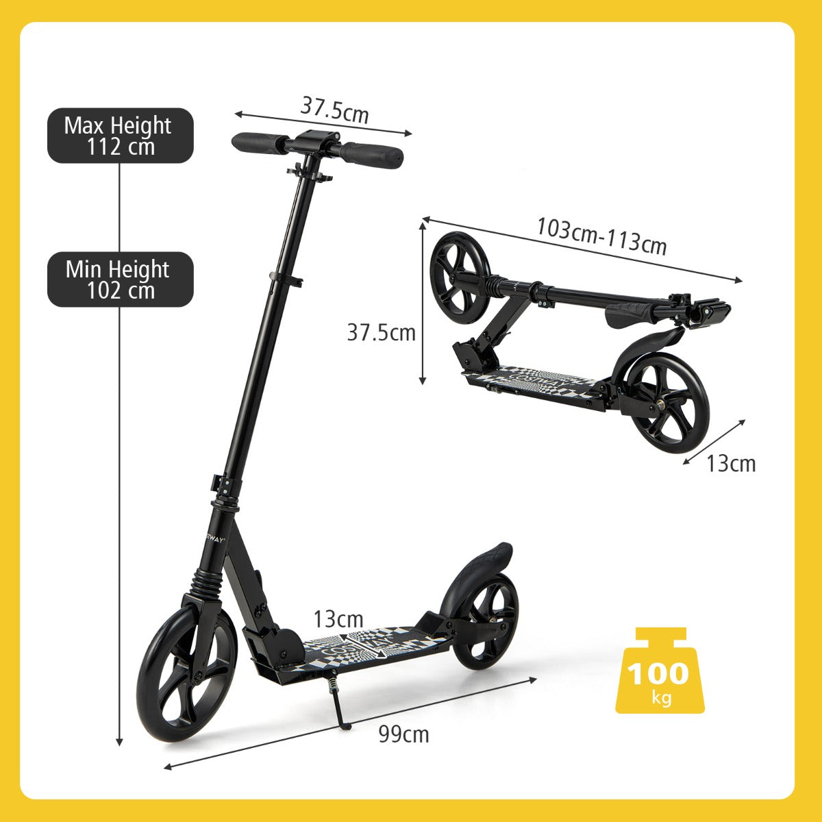 Go outside, use our kick scooter and start exploring the new world. The kick scooter features 2-level adjustable handlebar, ideal for kids, teens and adults. Sturdy aluminium structure makes the scooter hold up to 100 kg. Extra-large PU wheels with suspension system effectively absorb shock and move smoothly on various roads. More, the comfortable grips, non-slip deck and responsive brakes greatly improve safety. If you want to carry the scooter outside, one-second folding design and super lightweight will bring you much convenience.
