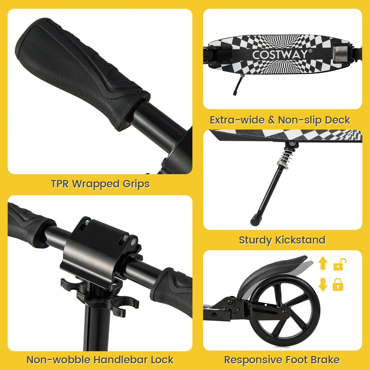 Sturdy & Safe Structure: Crafted from an aluminium frame, the kick scooter is sturdy enough to offer a high load-bearing up to 100 kg. Extra-wide and non-slip deck, non-wobble grip clamp and TPE-wrapped handlebars provide you with high level of safety and comfort. With sturdy kickstand, the sport kick is easy to park.