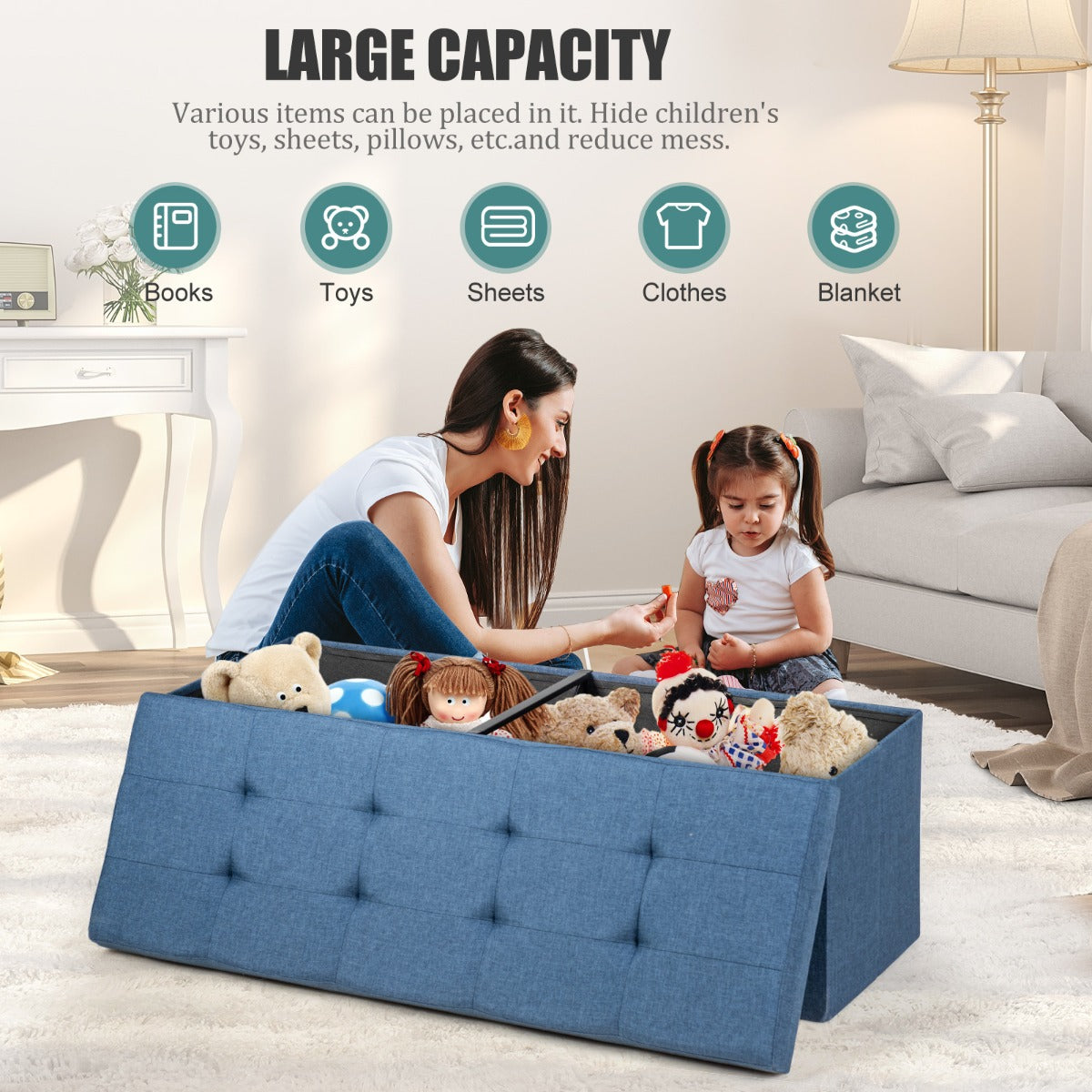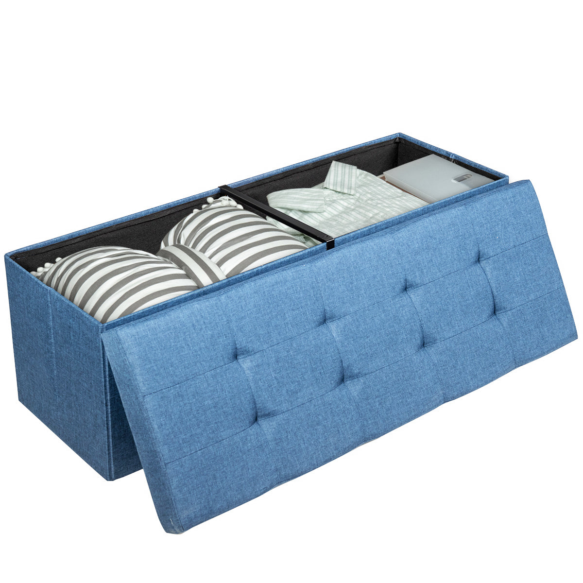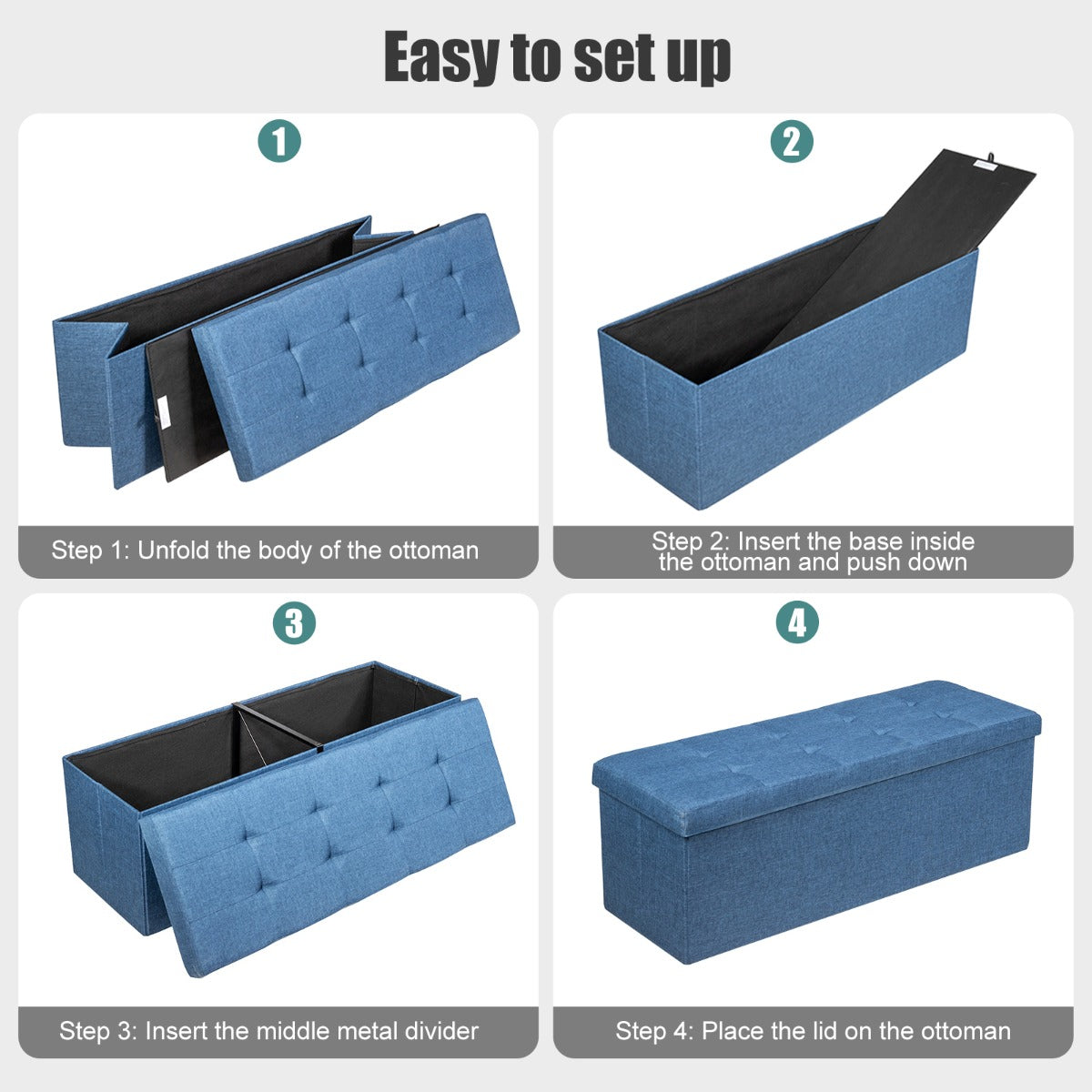 The overall frame is constructed of high-quality MDF, which ensures a high load bearing capacity without easy deformation. Soft fabric covering and thick padding provide a great sitting experience. Roomy interior storage space can meet the needs of storing clothes, blankets, shoes and other daily necessities. It's also worth mentioning that the metal divider provides added stability and can realize classified storage. Besides, equipped with detailed instructions, this storage ottoman can be assembled quickly.