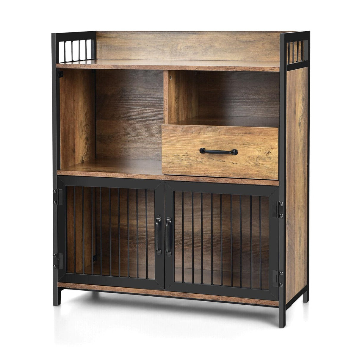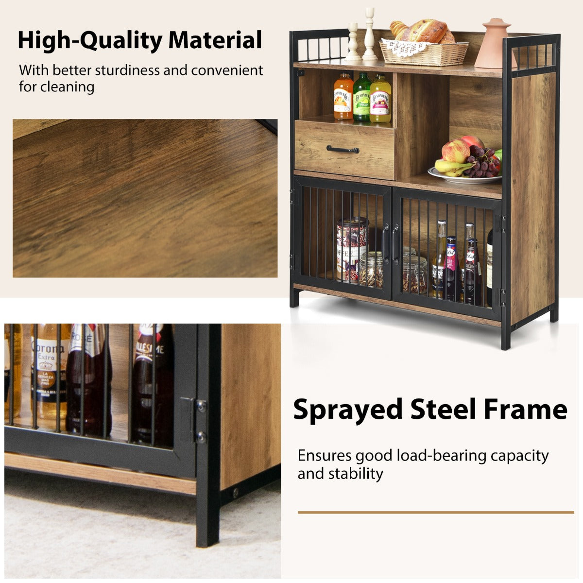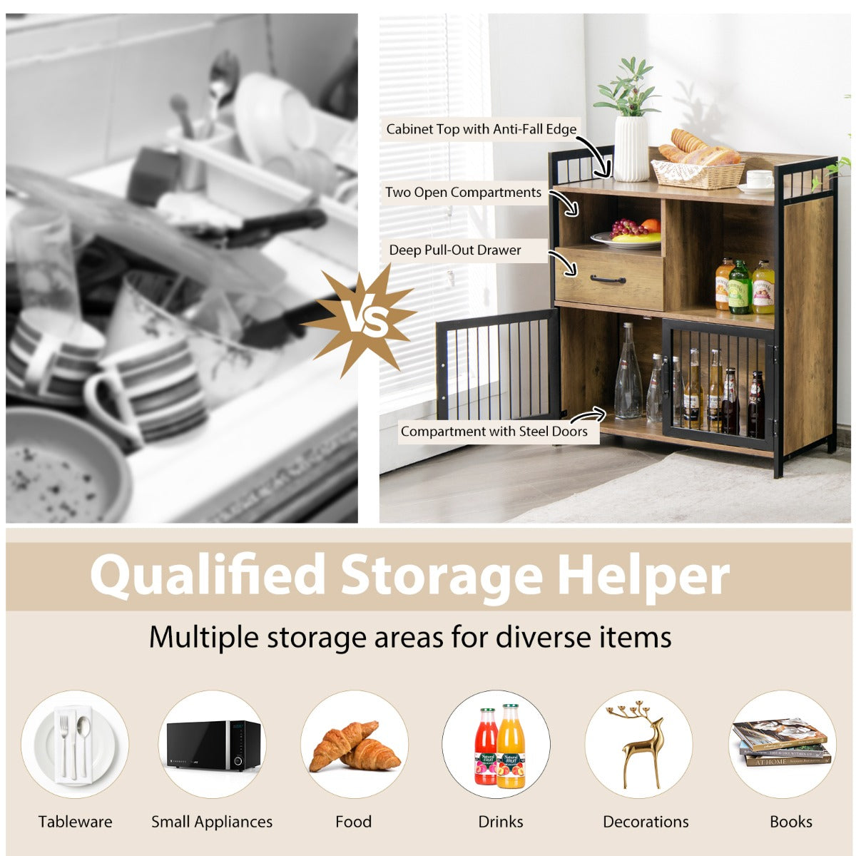 Decorative Industrial Addition: Expect for improving your storage ability, the buffet table cabinet can also bring a fashionable industrial feeling to your home. Characterized by the harmonious combination of black metal and vintage wood panels, the storage sideboard is sure to attract a lot of attention.