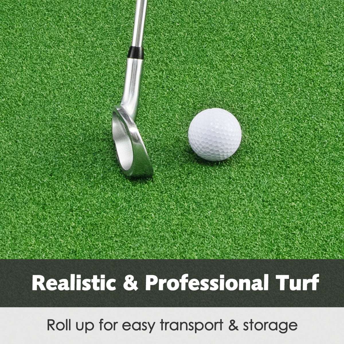 Equipped with premium artificial turf, this golf hitting mat can simulate the real feeling of playing at the fairway, offering a realistic practice experience at both indoor and outdoor places like the patio, backyard and living room. Also, the thick and non-slip base is made of highly resilient TPR material which can absorb the impact when the mat is hit. So your club' service life is ensured and your wrists are also protected. In addition, this golf putting mat not only features 2 tee positions but also comes with 3 rubber tees for common practice. For convenient storage and transport, you can roll it up.