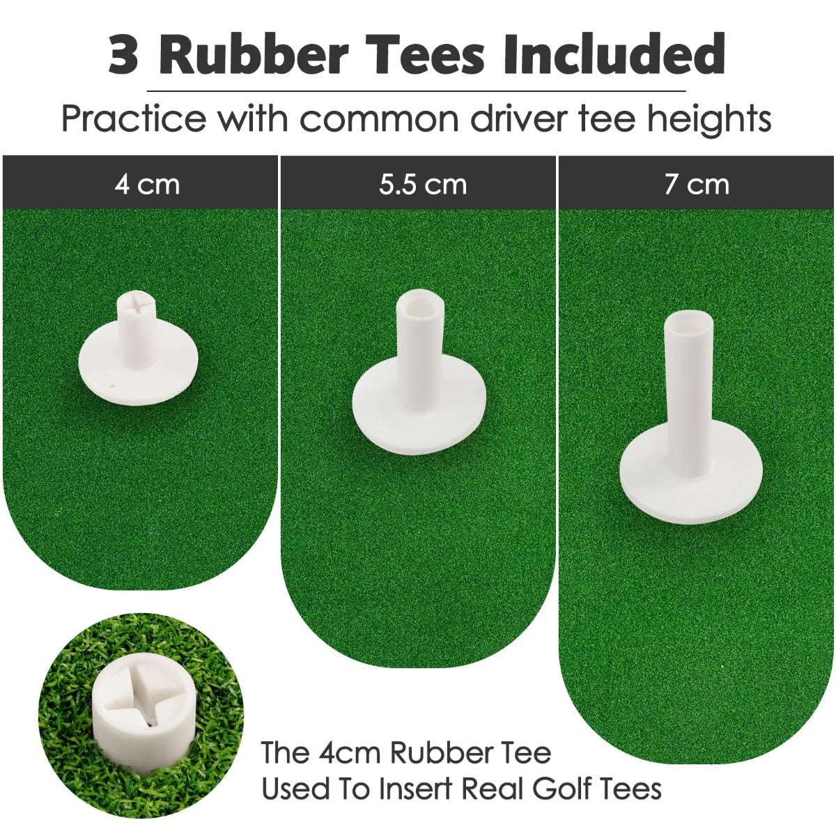 Designed for Both Right & Left Handers: Featuring 2 tee positions on both sides, this golf practice grass mat is suitable for all players including right-handers and left-handers. Also, the golf mat comes with 3 rubber tees with common driver tee heights of 4cm, 5.5 cm and 7 cm, and the 4cm rubber tee can be used to insert real golf tees.