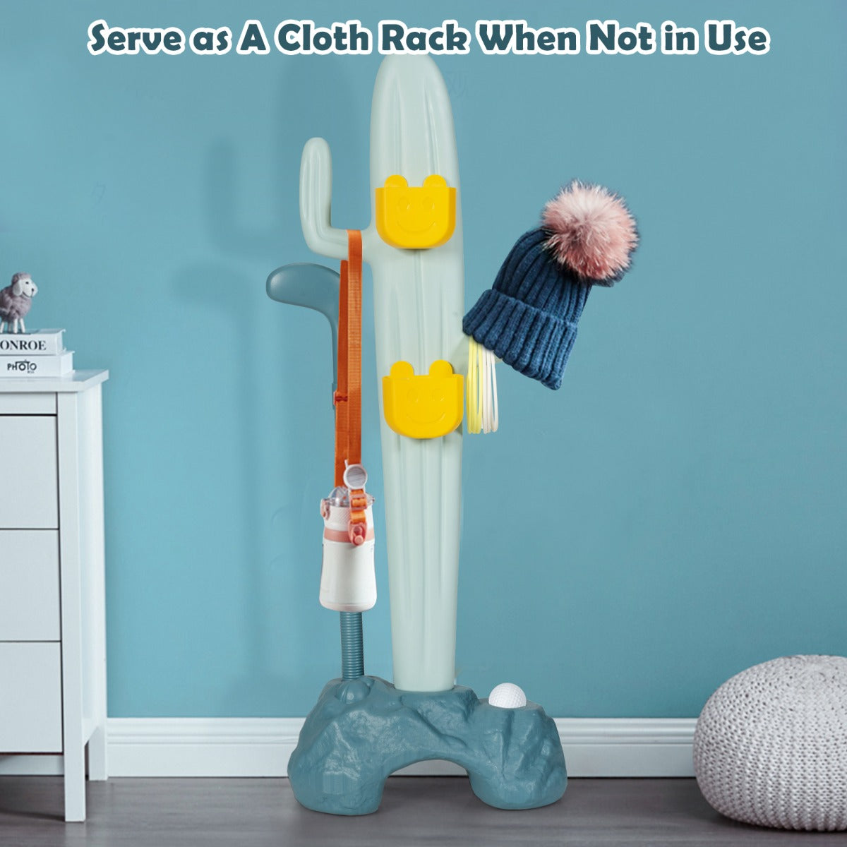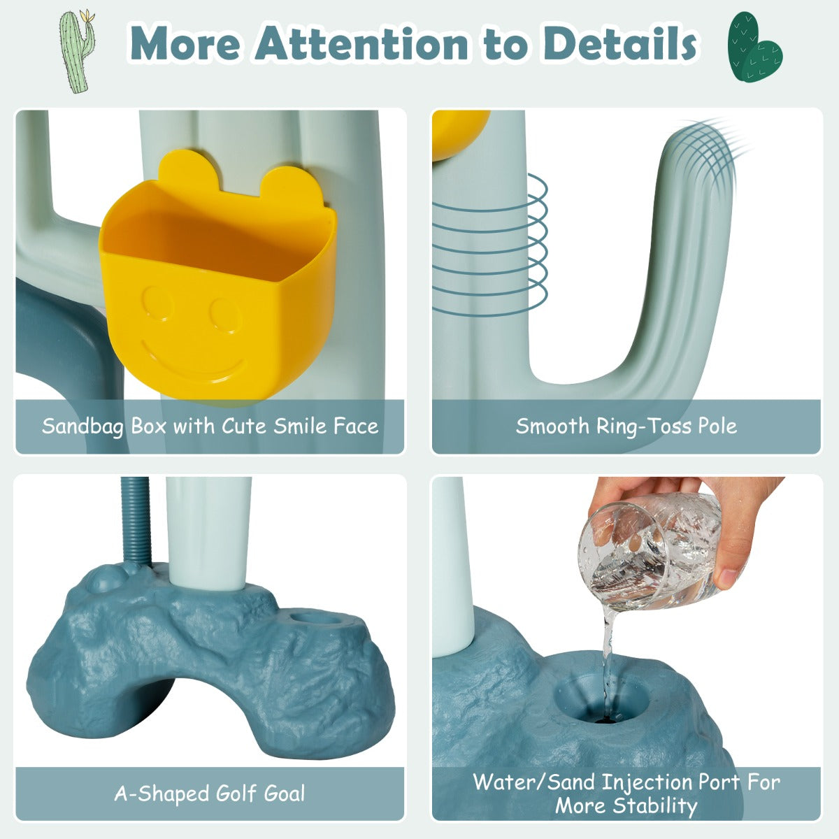3-in-1 Toy Stand: This multi-functional toy stand is equipped with a golf club, golf ball, 2 sandbags, and 6 rings. It has presented a diverse fun play, allowing kids to enjoy the golf game, ring-toss game, and the sandbag-toss game. With functional integration, this toy stand is definitely with a high performance-price rate.