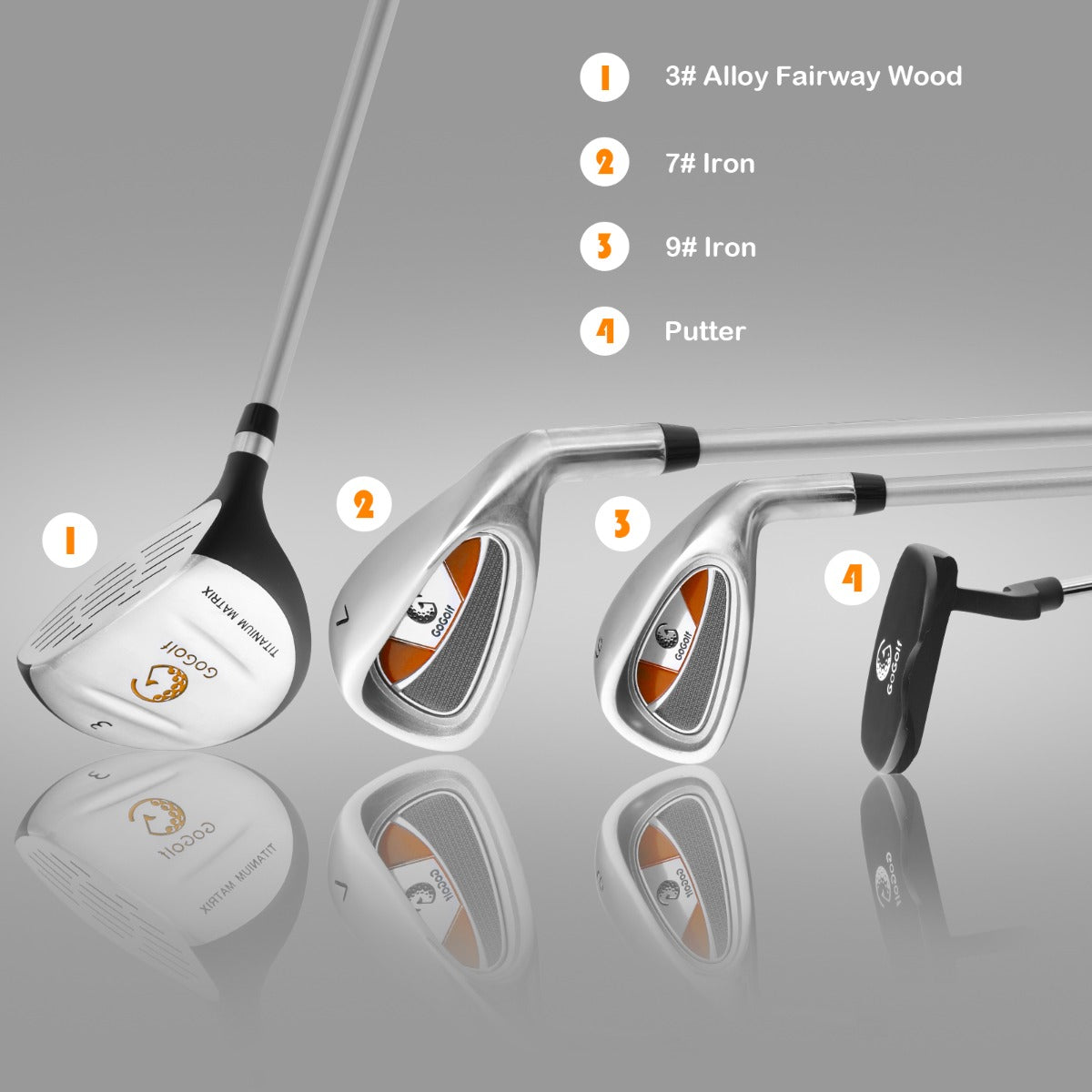 Perfect Golf Club Set For Kids: The appropriate tool is crucial to the first golf experience of kids. This professional golf club set includes 3# fairway Wood, 7# & 9# irons, putter, head cover and stand bag. With four different clubs, kids can hit golfs of various heights and distances for different needs.