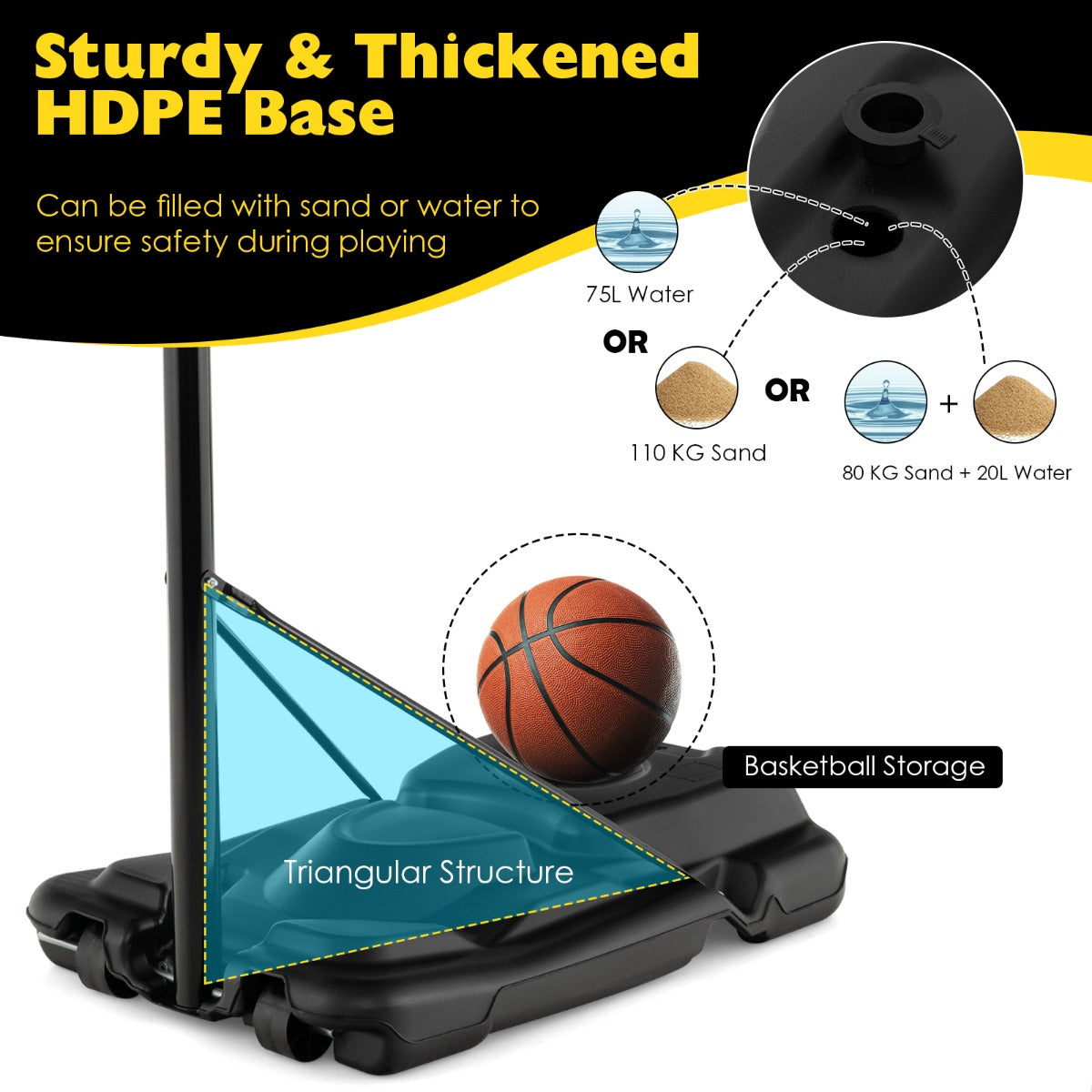 Fillable Base with Basketball Storage: This enlarged base measuring 108 cm x 70 cm can contain 75L water, 110 kg sand or 80 kg sand with 20L water, which effectively increased stability and safety during playing. The groove on the base is designed for placing the basketball when resting.