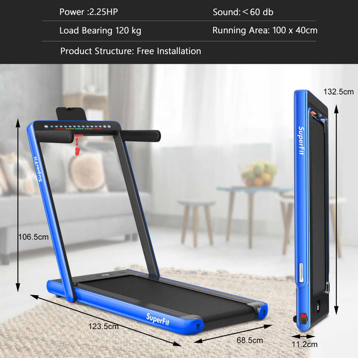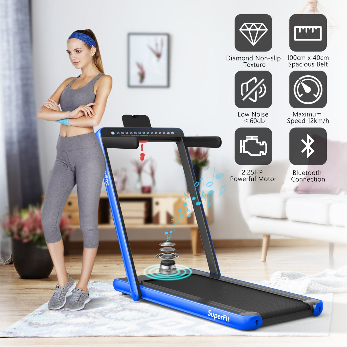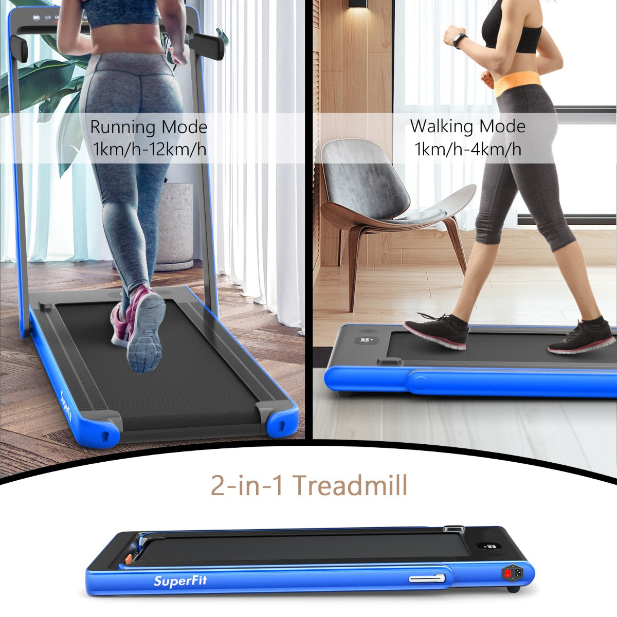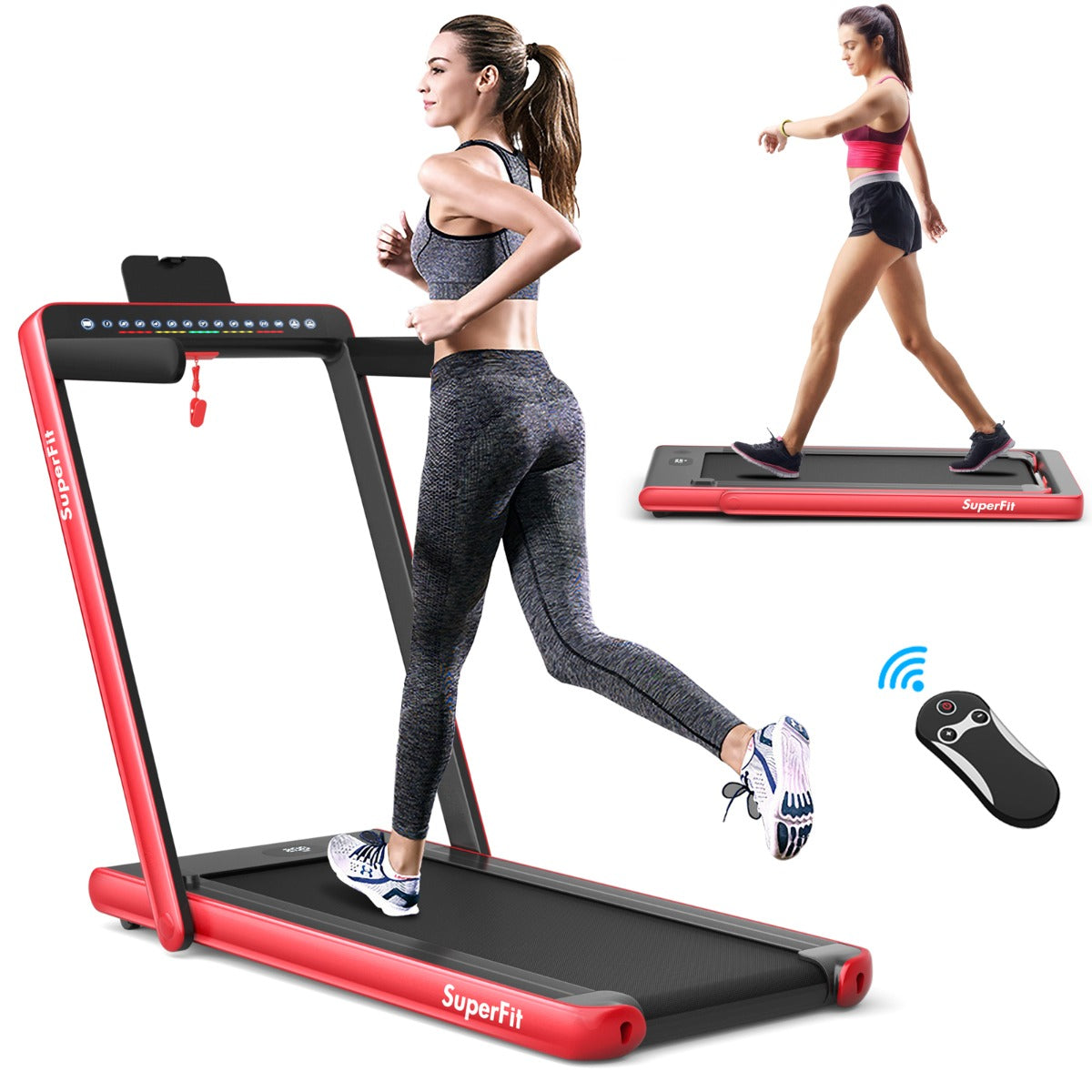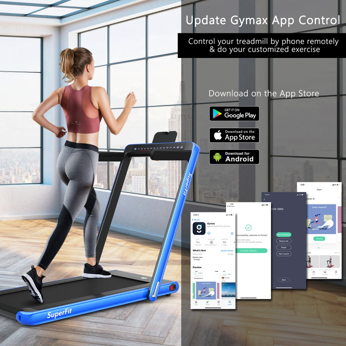 Designed with 2 in 1 mode, this multifunctional treadmill can be used as an running machine or a under desk walking machine according to your various exercise demands. With the powerful 2.25HP motor, this electric treadmill allows you to exercise indoors in a noiseless scene. The 5-layer anti-slip and shock-absorbing running belt makes your exercise safer. Likewise, dual LED displays, Bluetooth speaker, phone holder, Gymax APP and remote control, these smart functions bring more convenience and interest for workout. What's more, the foldable design is perfect for limited spaces.