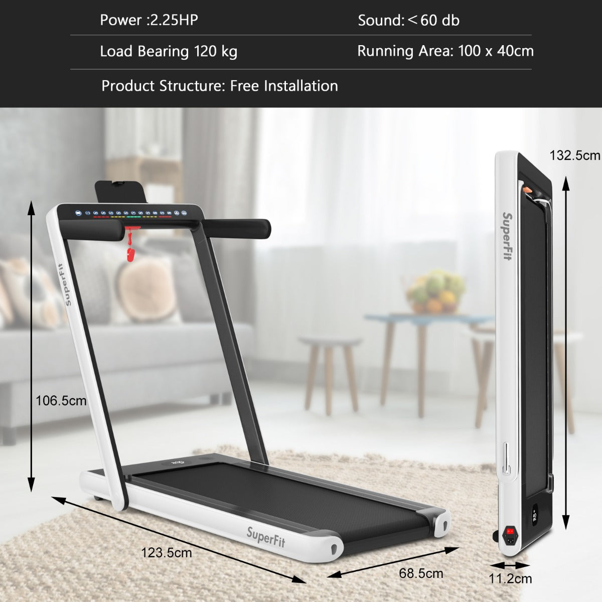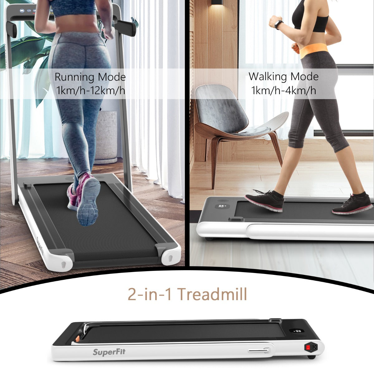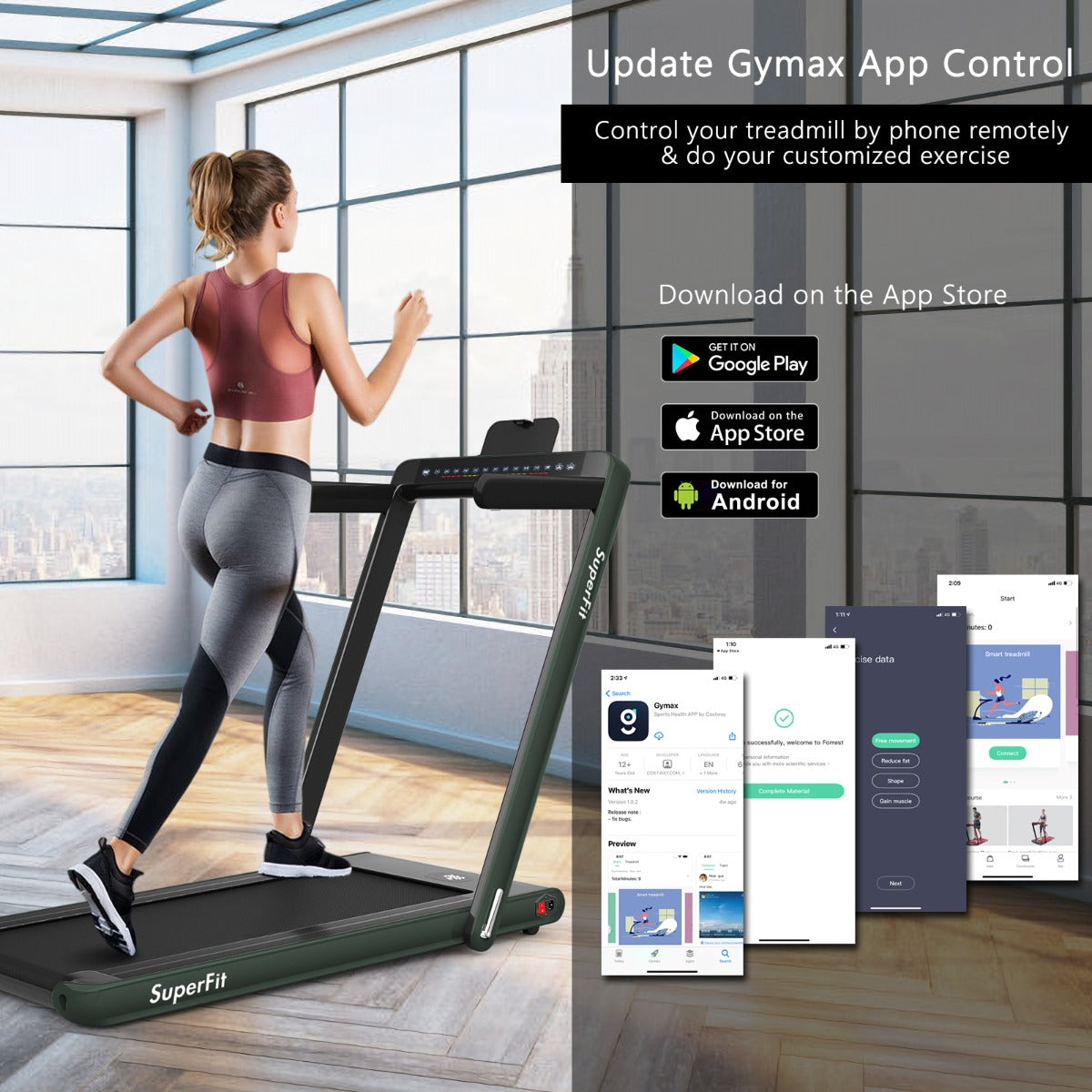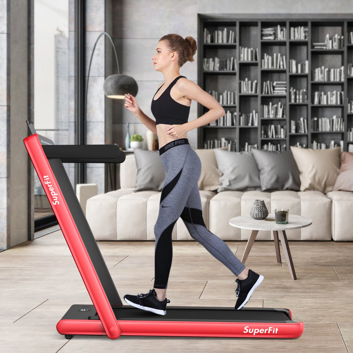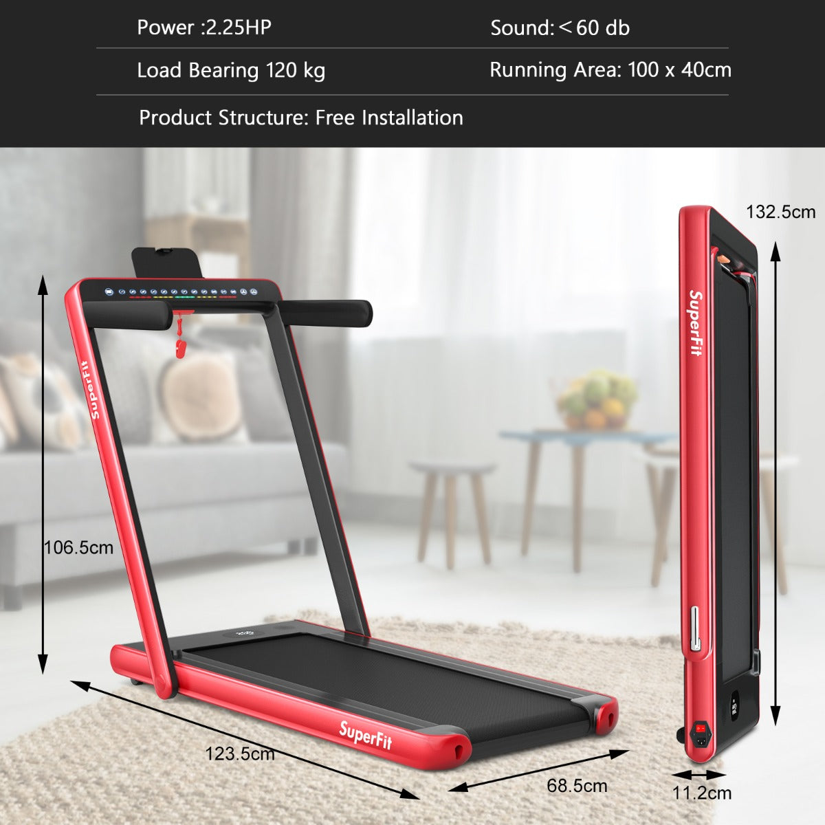 Designed with 2 in 1 mode, this multifunctional treadmill can be used as an running machine or a under desk walking machine according to your various exercise demands. With the powerful 2.25HP motor, this electric treadmill allows you to exercise indoors in a noiseless scene. The 5-layer anti-slip and shock-absorbing running belt makes your exercise safer. Likewise, dual LED displays, Bluetooth speaker, phone holder, Gymax APP and remote control, these smart functions bring more convenience and interest for workout. What's more, the foldable design is perfect for limited spaces.
