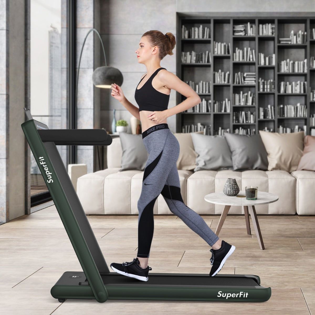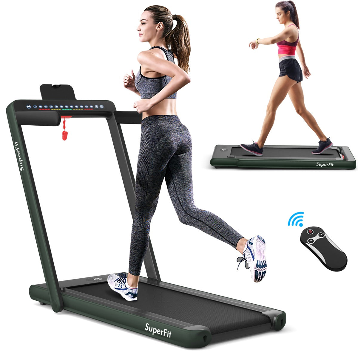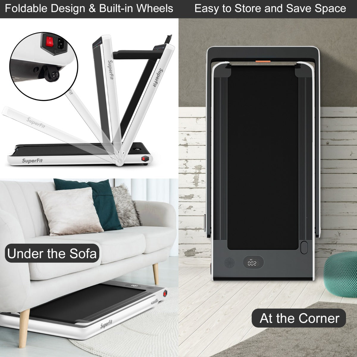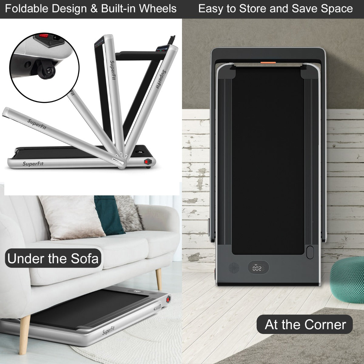 Designed with 2 in 1 mode, this multifunctional treadmill can be used as an running machine or a under desk walking machine according to your various exercise demands. With the powerful 2.25HP motor, this electric treadmill allows you to exercise indoors in a noiseless scene. The 5-layer anti-slip and shock-absorbing running belt makes your exercise safer. Likewise, dual LED displays, Bluetooth speaker, phone holder, Gymax APP and remote control, these smart functions bring more convenience and interest for workout. What's more, the foldable design is perfect for limited spaces.