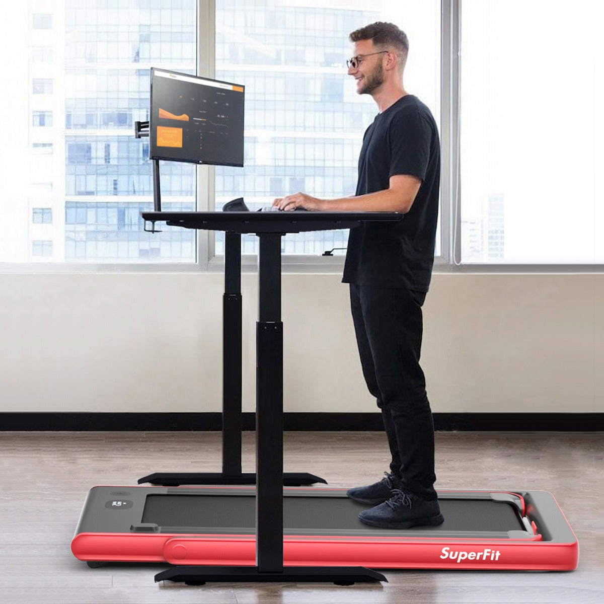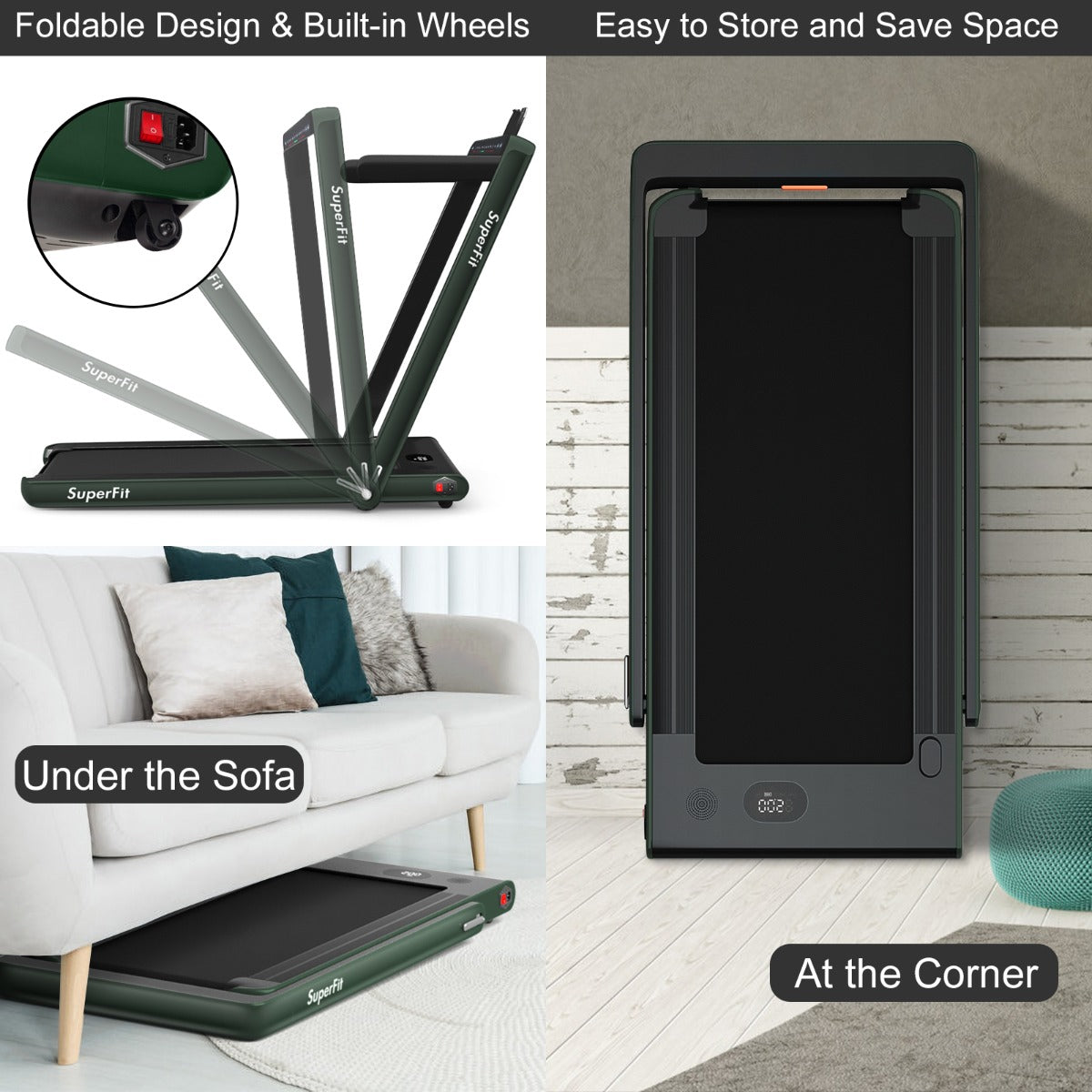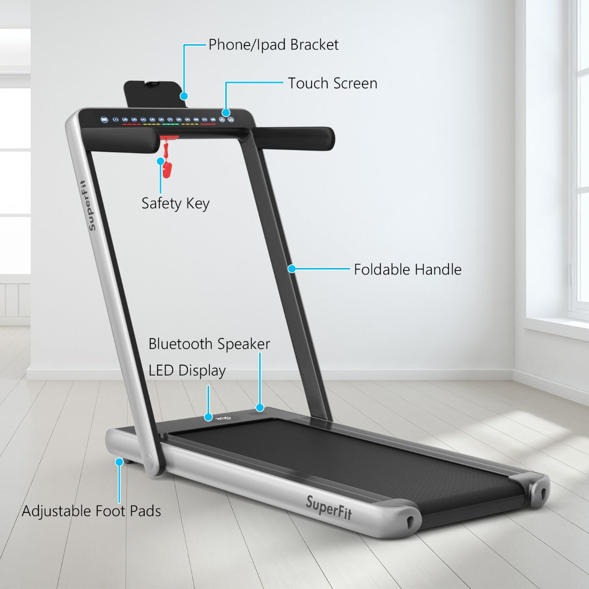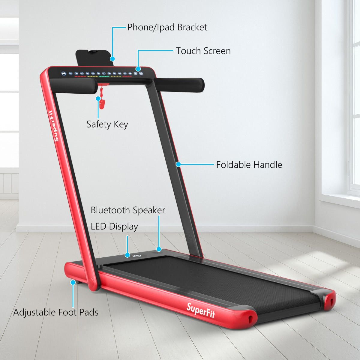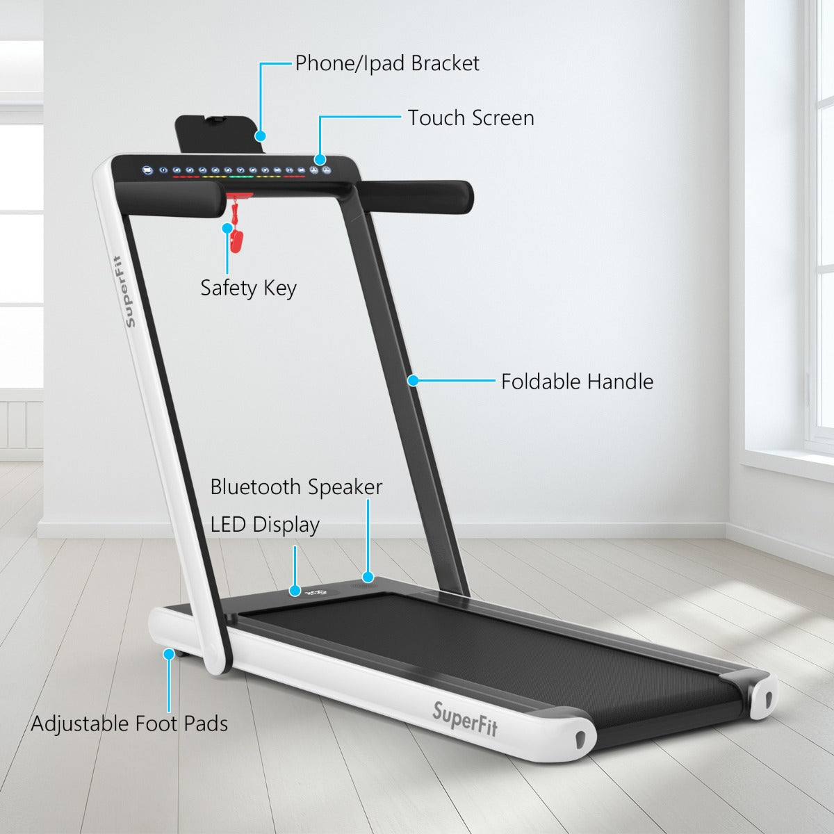 Designed with 2 in 1 mode, this multifunctional treadmill can be used as an running machine or a under desk walking machine according to your various exercise demands. With the powerful 2.25HP motor, this electric treadmill allows you to exercise indoors in a noiseless scene. The 5-layer anti-slip and shock-absorbing running belt makes your exercise safer. Likewise, dual LED displays, Bluetooth speaker, phone holder, Gymax APP and remote control, these smart functions bring more convenience and interest for workout. What's more, the foldable design is perfect for limited spaces.