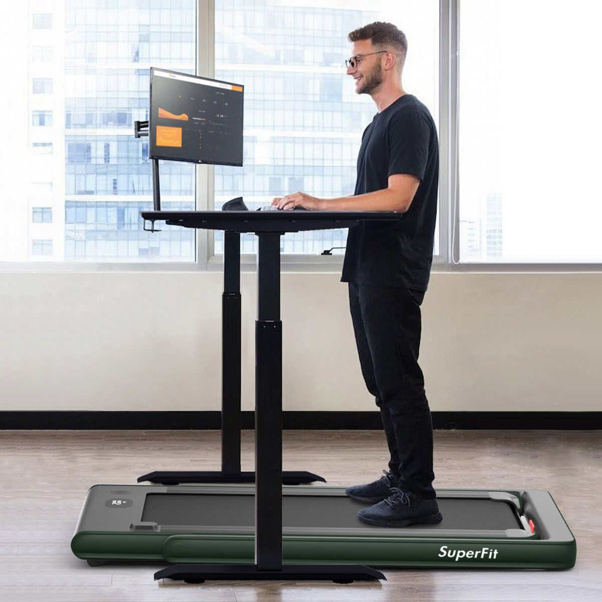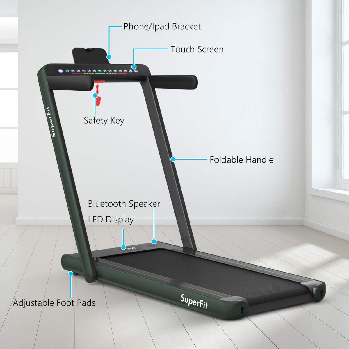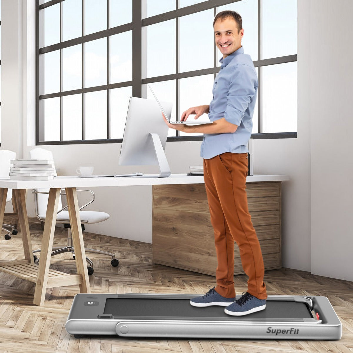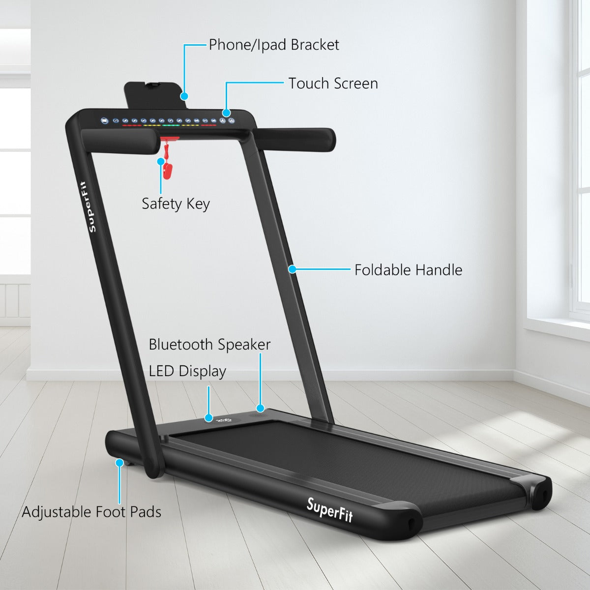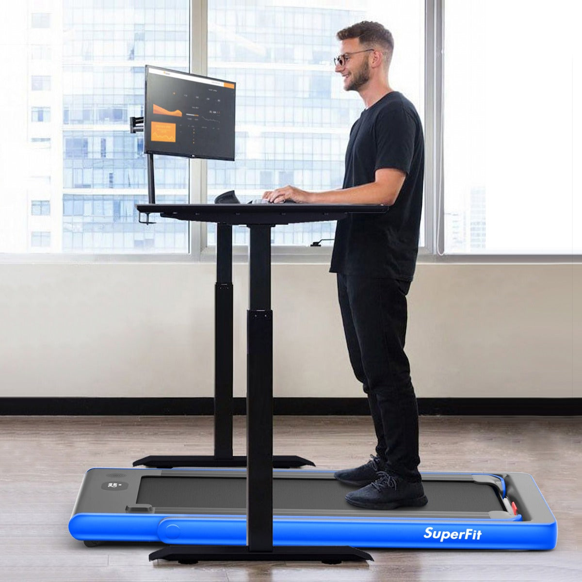 Designed with 2 in 1 mode, this multifunctional treadmill can be used as an running machine or a under desk walking machine according to your various exercise demands. With the powerful 2.25HP motor, this electric treadmill allows you to exercise indoors in a noiseless scene. The 5-layer anti-slip and shock-absorbing running belt makes your exercise safer. Likewise, dual LED displays, Bluetooth speaker, phone holder, Gymax APP and remote control, these smart functions bring more convenience and interest for workout. What's more, the foldable design is perfect for limited spaces.