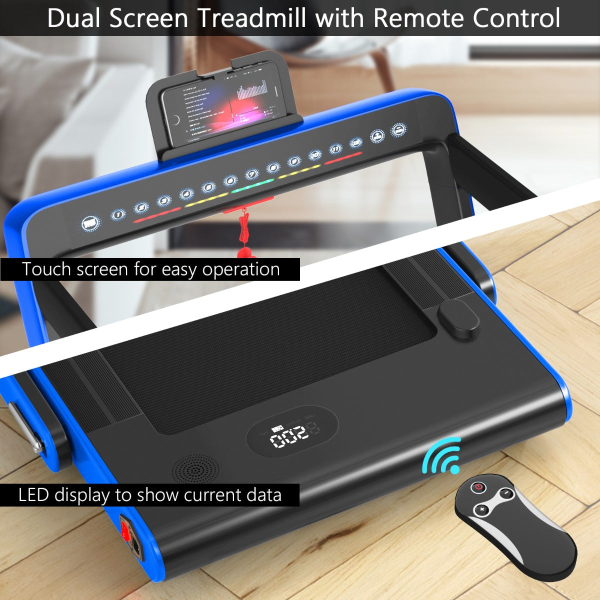 Dual LED Display: Designed with 2 LED display screens, you can immerse in the exercise with convenient operation and data display. The upper touchable screen allows you to adjust speed freely and the bottom LED display can show your sports data (time/speed/distance/calorie), which makes your exercise visual and motivated.