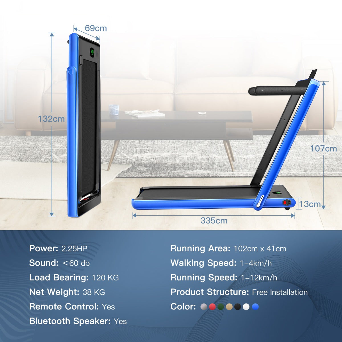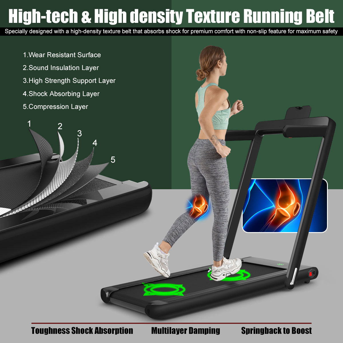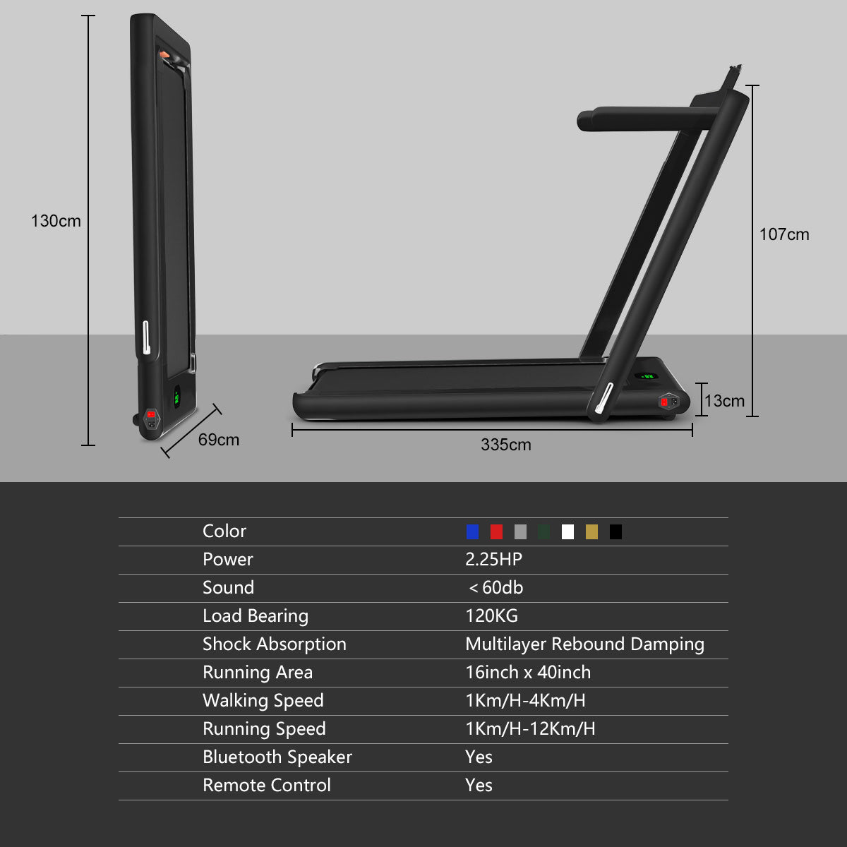 Our innovative 2-in-1 folding treadmill has 2 sport modes that can be used as a running treadmill and an under desk walking treadmill. You can use it for walking, jogging and running, which is very suitable for home, office and gym. With a powerful 2.25 HP ultra-quiet motor, it provides you with a quiet and comfortable sports environment without disturbing others. 5-layer non-slip and shock-absorbing running belt provides effective cushioning for your back, joints, muscles, knees and ankles. A versatile LED display monitors your movement data in real time. You can connect the treadmill to your phone through Bluetooth and play music while you are exercising. In addition, it is equipped with a remote control and APP control for better training. The compact design and transport wheels make this treadmill easy to fold, move and store. Start exercising now and burn your calories!