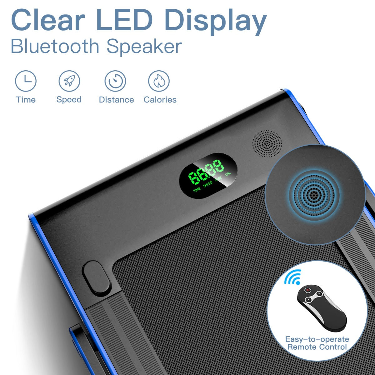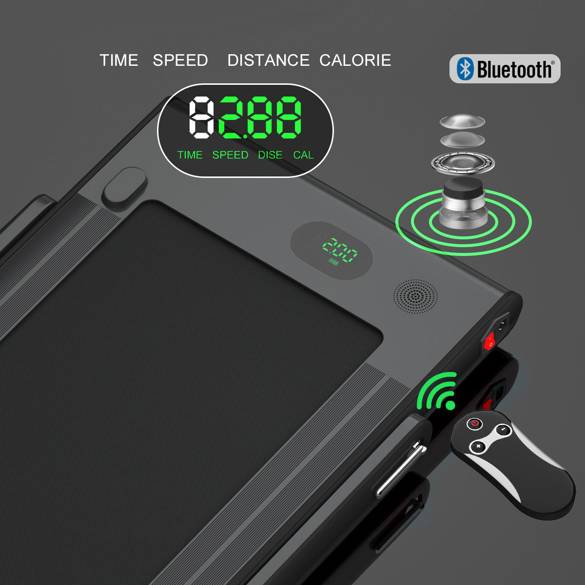 Bluetooth Speaker & Remote Control & Safety Key: The treadmill can be connected to your electronic equipment through the Bluetooth audio speaker, which means you can listen to music while running. The remote controller can change the running speed to avoid accidents. The safety key ensures that you stop immediately in an emergency to protect you during exercise.