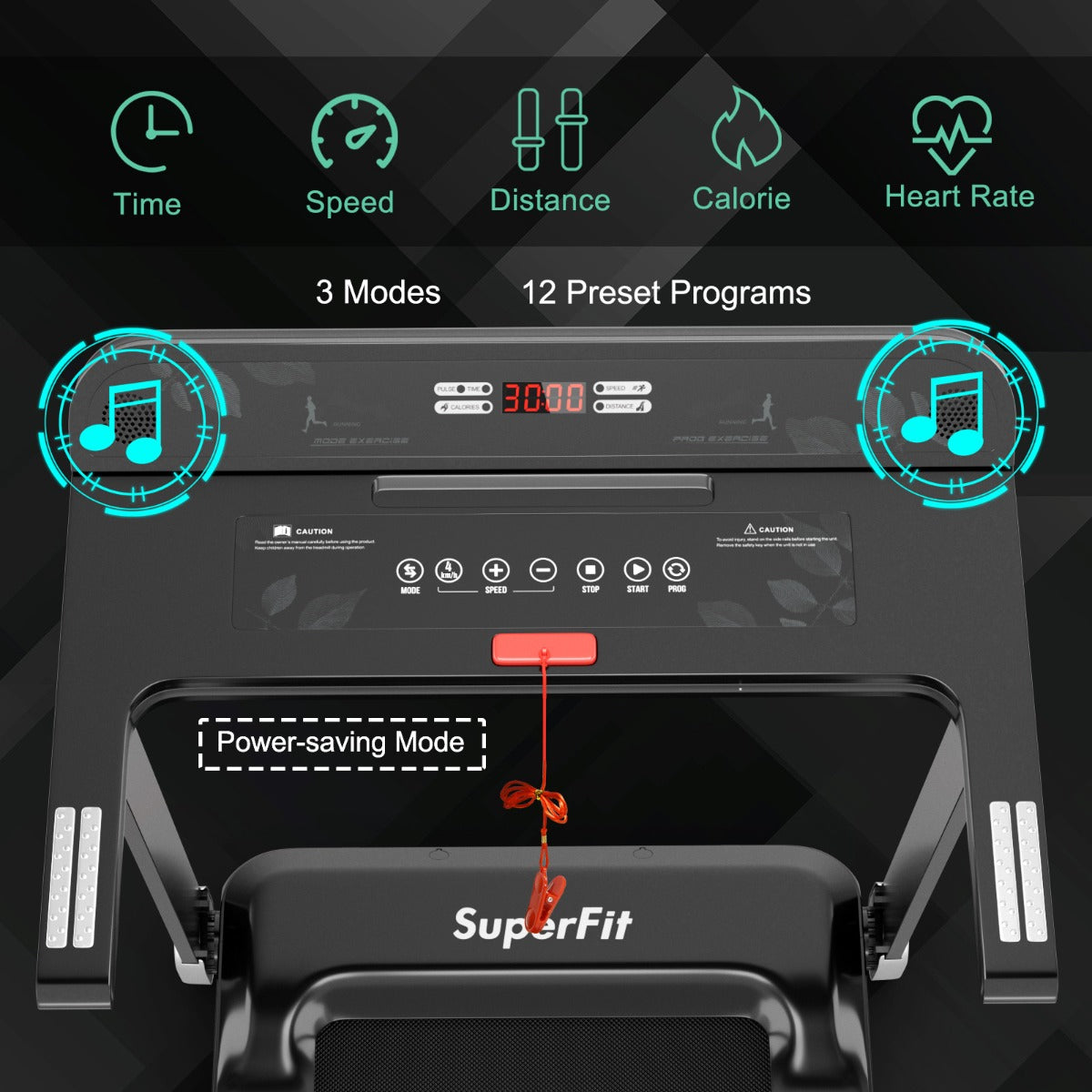 Powerful Yet Quiet Motor: With adjustable speed from 1.0 - 12.0 km/h, 12 preset programs and 3 different modes, this electric running machine with powerful motor allows you to customize your fitness plan according to your sports goals, burning calories effectively. And it creates a quiet environment when you exercise at home.