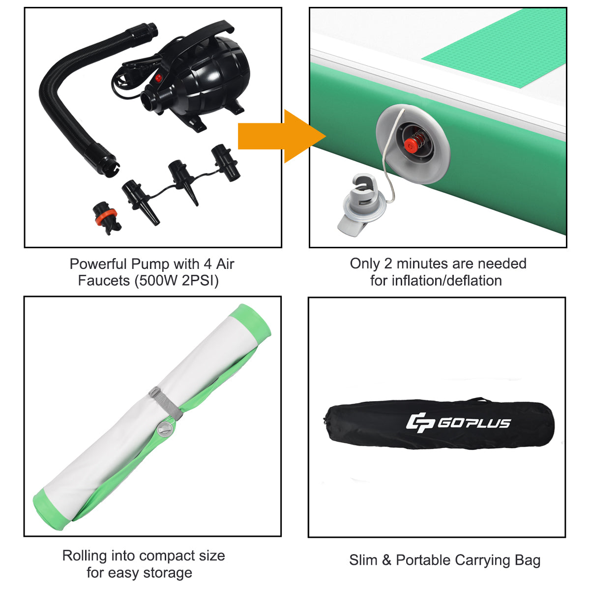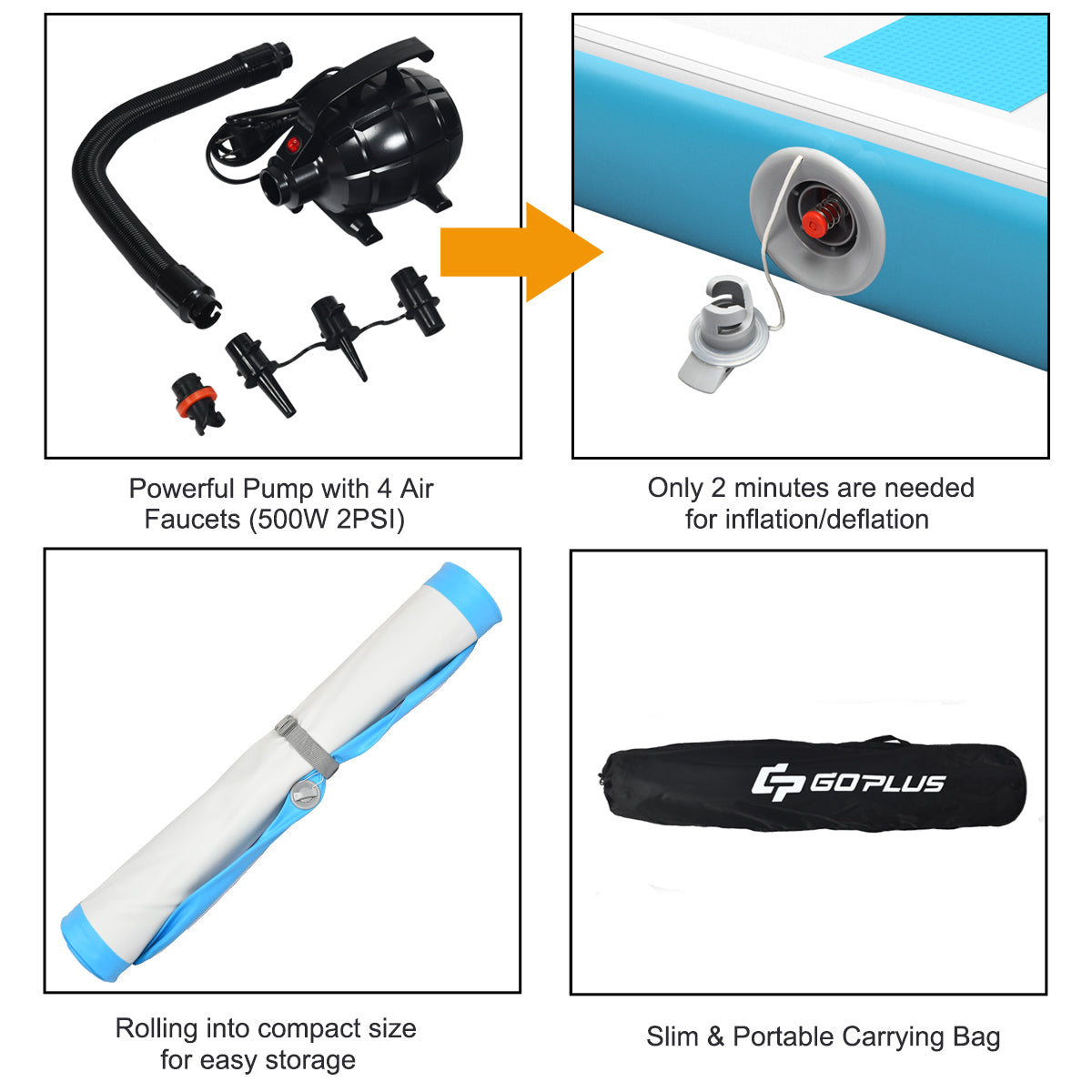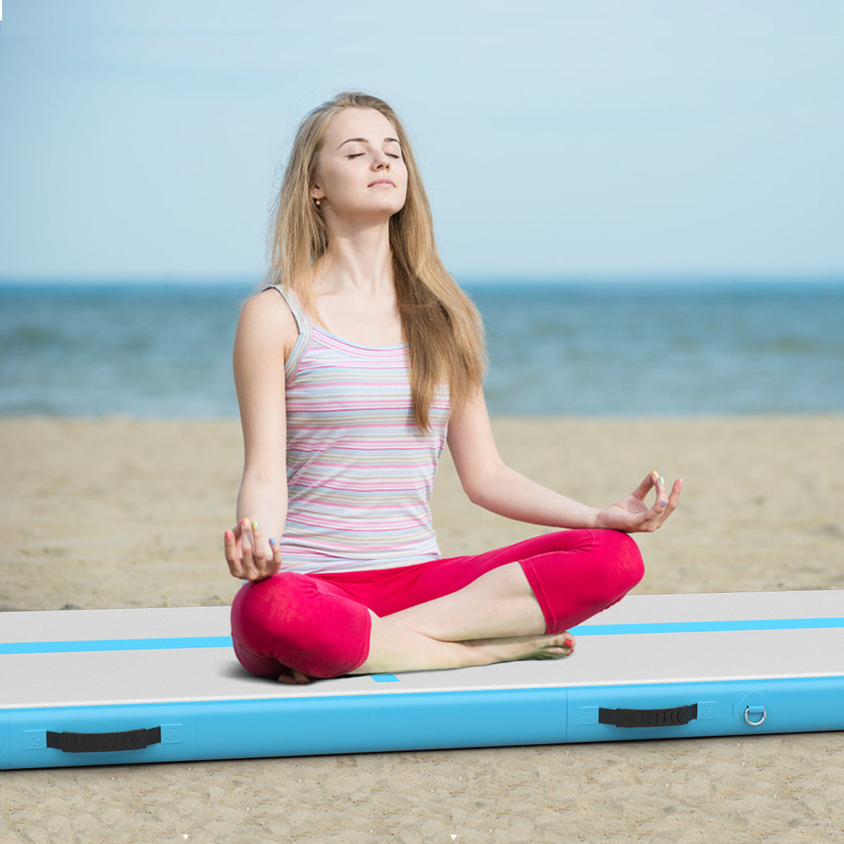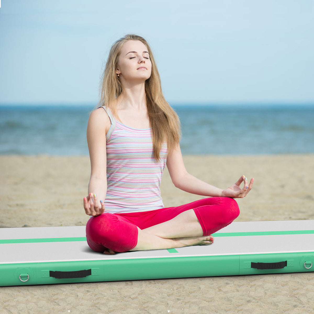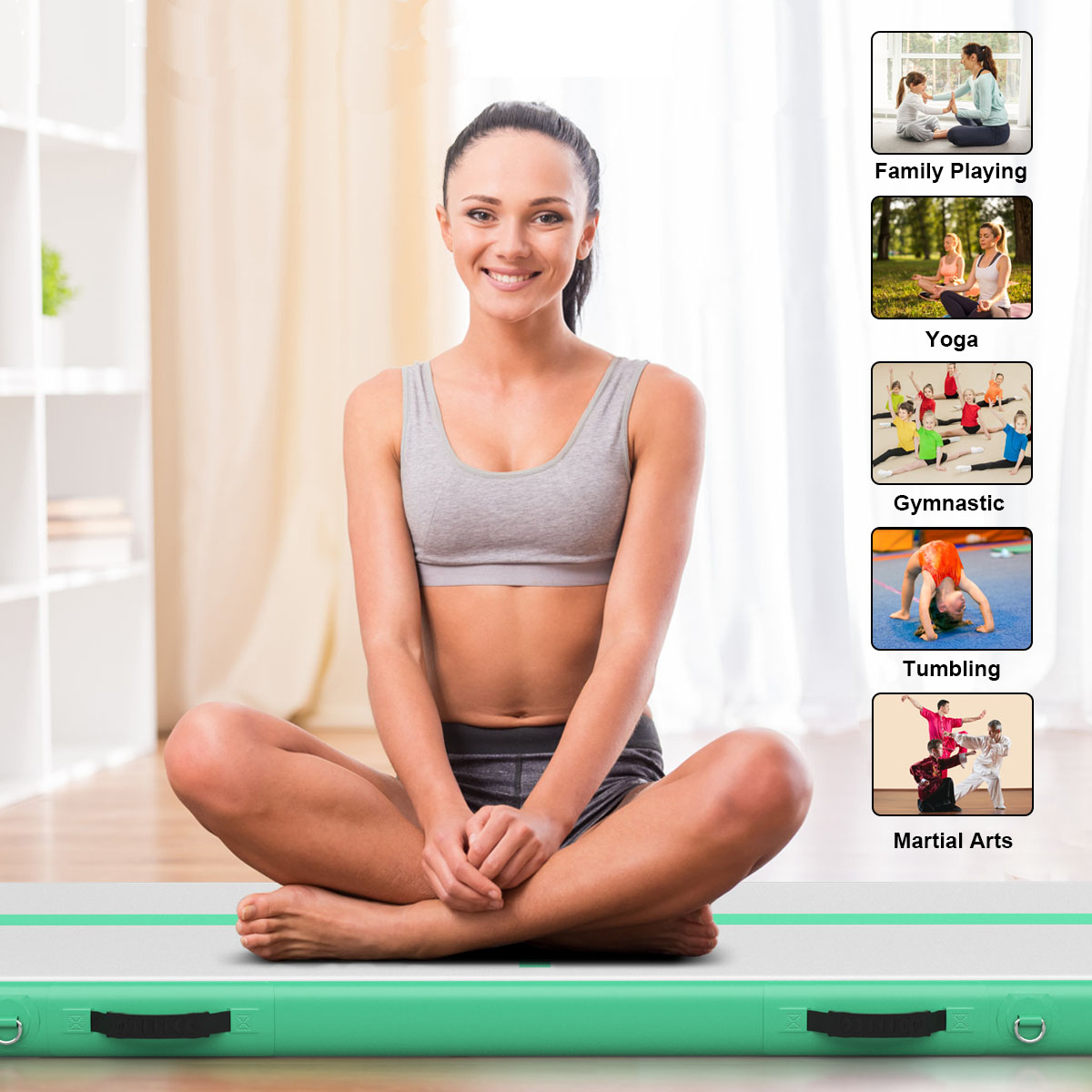 Wide Application: This inflatable gymnastic mat can be placed on the floor of your home or gym in high performance training, such as tumbling practice, martial arts, gymnastics and yoga. Moreover, you can enjoy exercise on the beach, background, grassland or even on the water.