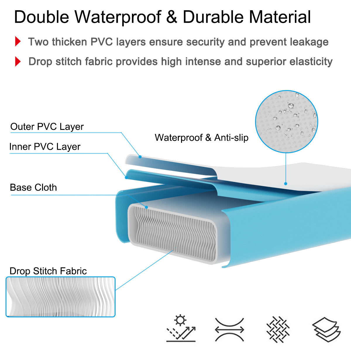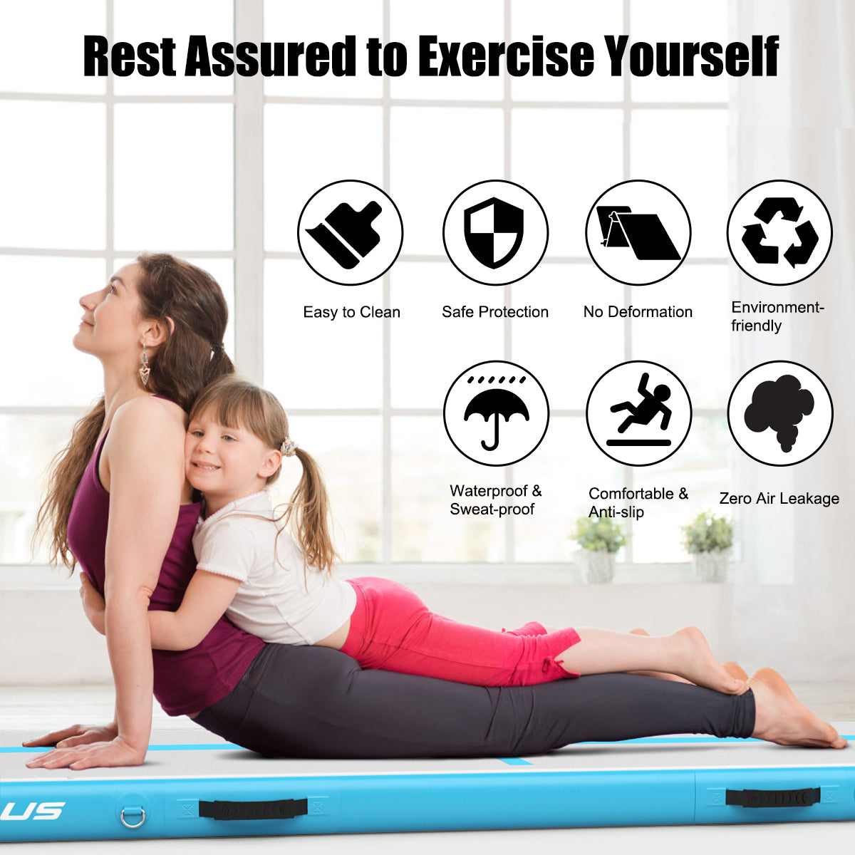 Premium & Selective PVC Material: This gymnastic mat is made of PVC material, featuring two thicken PVC layers of 0.7mm. The outer PVC layer has an anti-slip and waterproof surface to guarantee great safety during training. Drop stitch fabric between two PVC layers is durable enough without being torn easily.