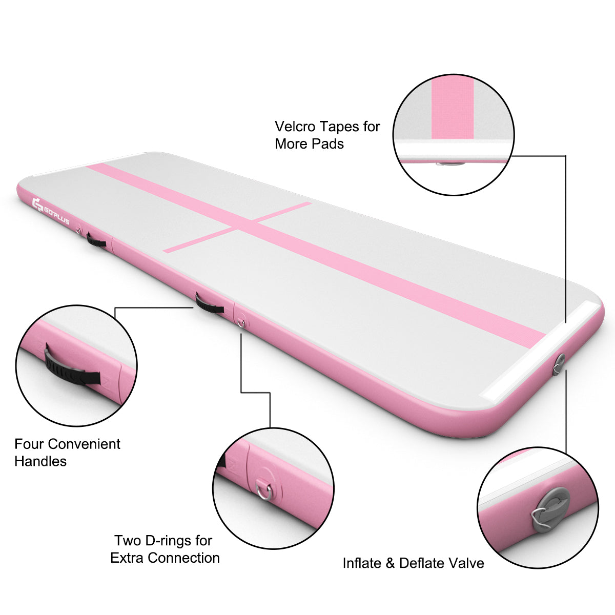 Hook and Loop Fasteners & D-rings for More Mats: Hook and loop fasteners on the head of the mat can allow you to connect several mats together to create a larger activity space. Different from other common mats, our air track mat features D-rings, making it possible to connect other mats to both sides.
