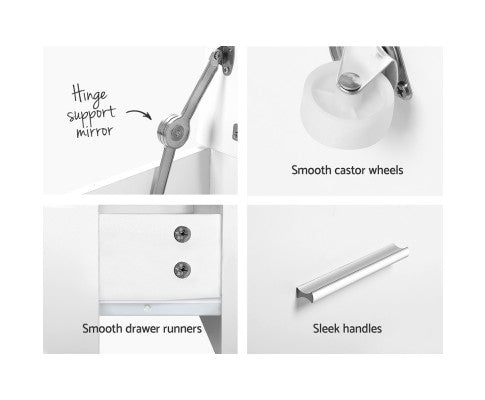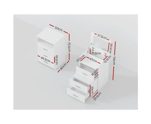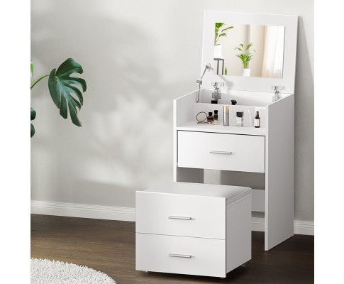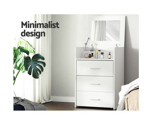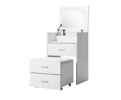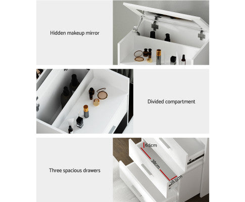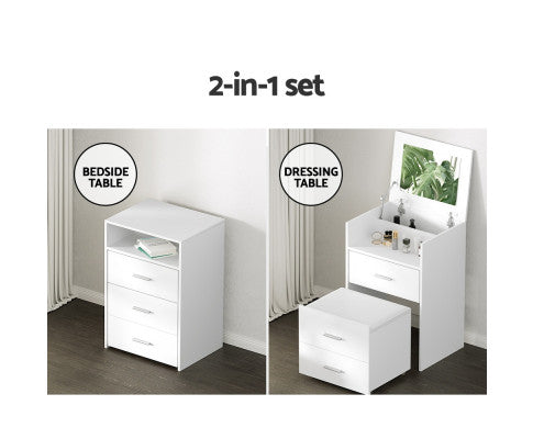 With a combination of unique structural design, chic aesthetic, and maximum style, the Artiss 2-in-1 bedside dressing table is sure to make a statement with a clean aesthetic and contemporary style that will blend with your existing decor. It comes with a hidden mirror and a soft padded stool with rotatable wheels, flaunting a clever and timeless design that caters to the bedroom of all sizes. This minimalist style furniture boasts a practical design that allows ease of use and convenience. The smooth-sliding three spacious drawers and a divided storage compartment enable you to store your belongings neatly and elegantly. It makes a perfect storage solution, where you can also put your most-loved collection of jewellery for display. A high-gloss finish on the front offers an attractive sheen for a fresh, clean look. And with particle board construction, your bedside dressing table will withstand the test of time. Not least, its sleek handles exude a contemporary vibe that stands out from the mundane. Purchase this ultimate bedroom essential today.