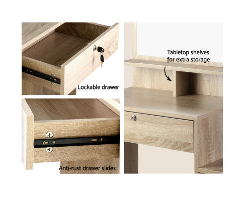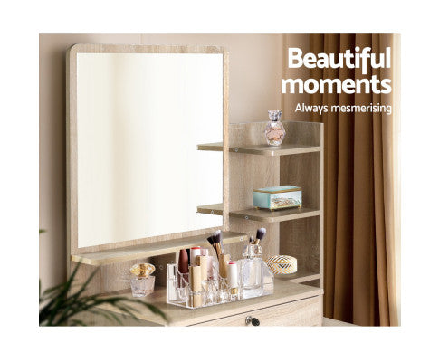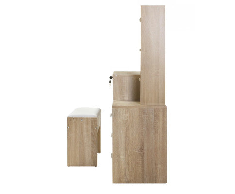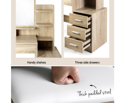 Featuring an aesthetically pleasing design and impressive functionality, the dressing table set makes a perfect upgrade to your bedroom. It comes with a big mirror, a spacious tabletop with ample storage space, and an elegant thick-padded dressing stool. For sure, nothing's better than having the luxury to sit down at a dressing table and get ready with all your makeup essentials at hand. The dressing table has four spacious drawers, three open shelves and extra display tabletop shelves. Show off your luxurious collection with the display shelves, place your eye-catching makeup boxes on the handy open shelves, keep safe your precious jewellery in a lockable drawer, and store the rest of your beauty collection in the drawers. Perfect for keeping everything organized and mess-free. Furthermore, it also has ample legroom so that you can sit comfortably and create those head-turning looks.