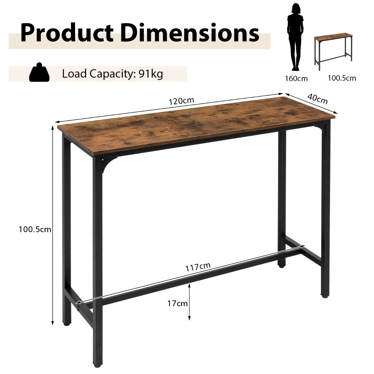 This 120 cm long bar table is space-saving due to its narrow and compact size, making it perfect for small areas in your home! The bottom bar design provides a place to rest your feet, allowing you to enjoy a relaxing leisure time. Its simple and classic design of industrial wood grain tabletop and black metal frame makes this bar table a great choice for the home, restaurant, pub, Bistro, coffee shop, cafe, etc.