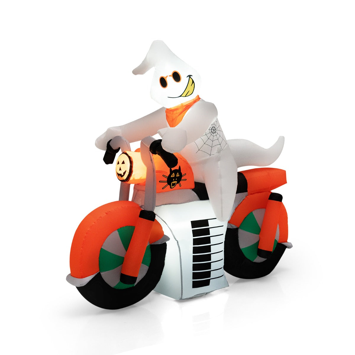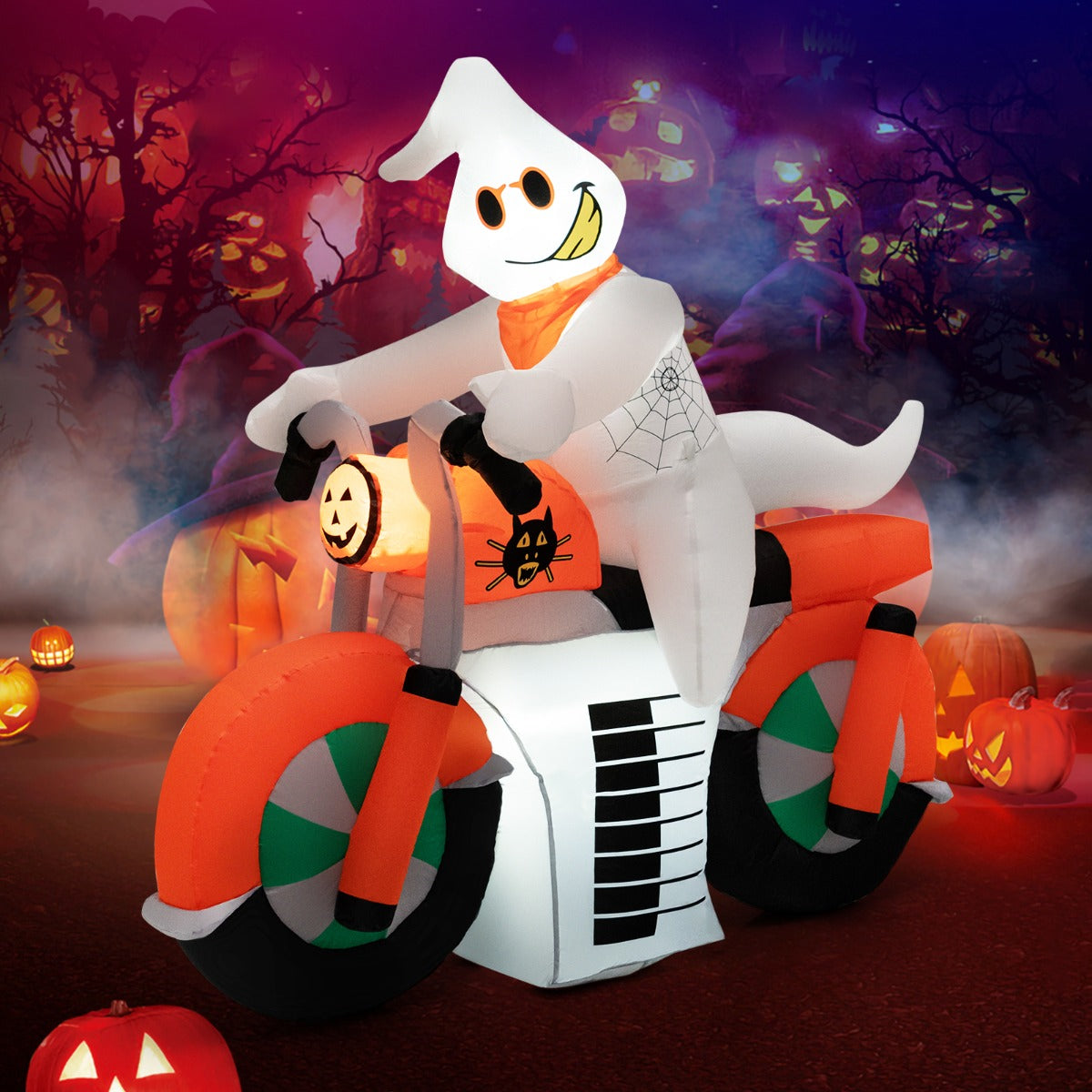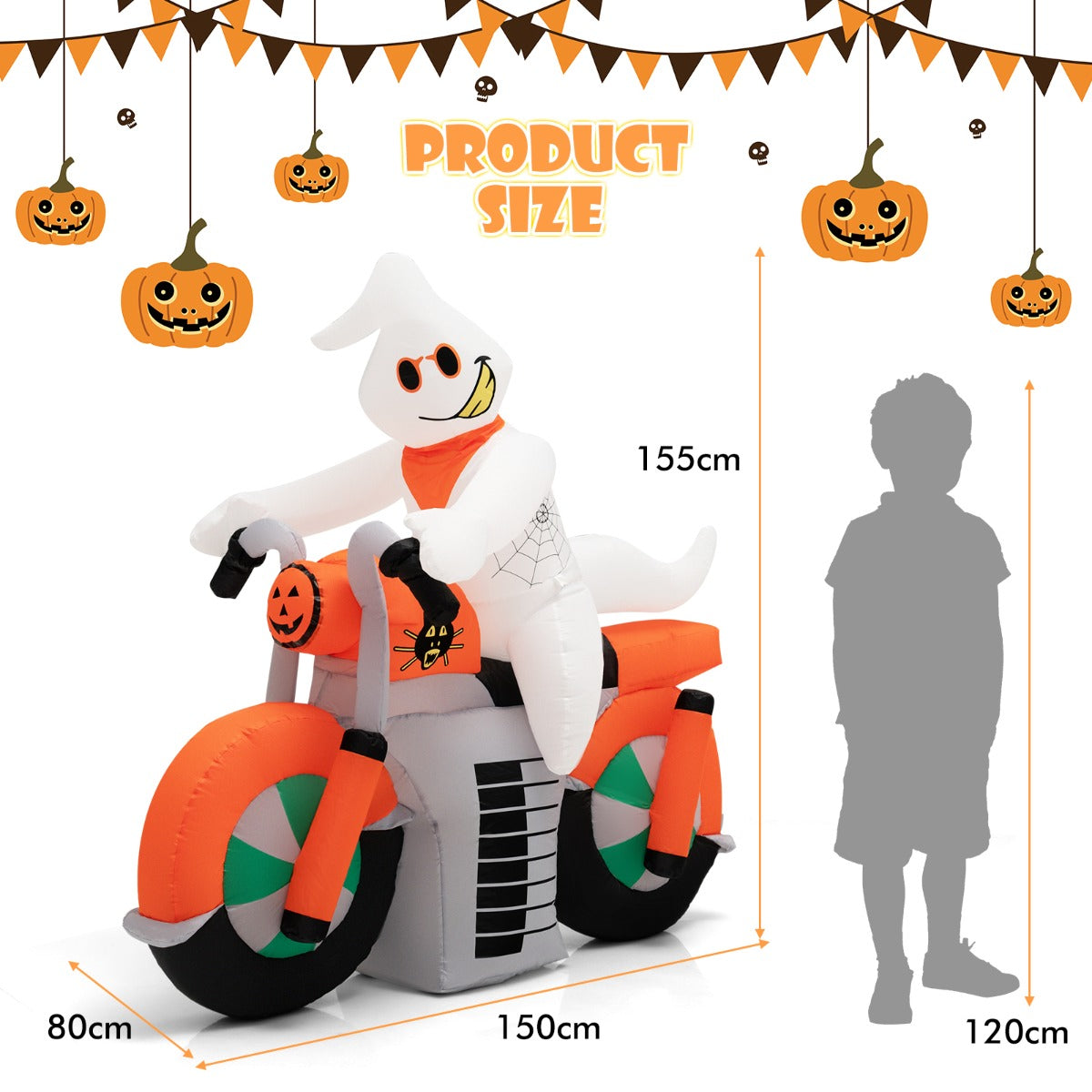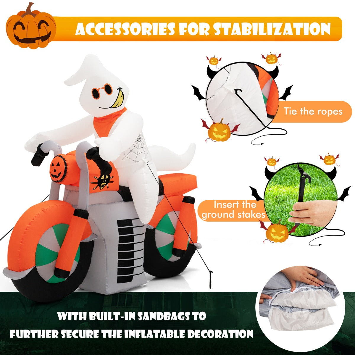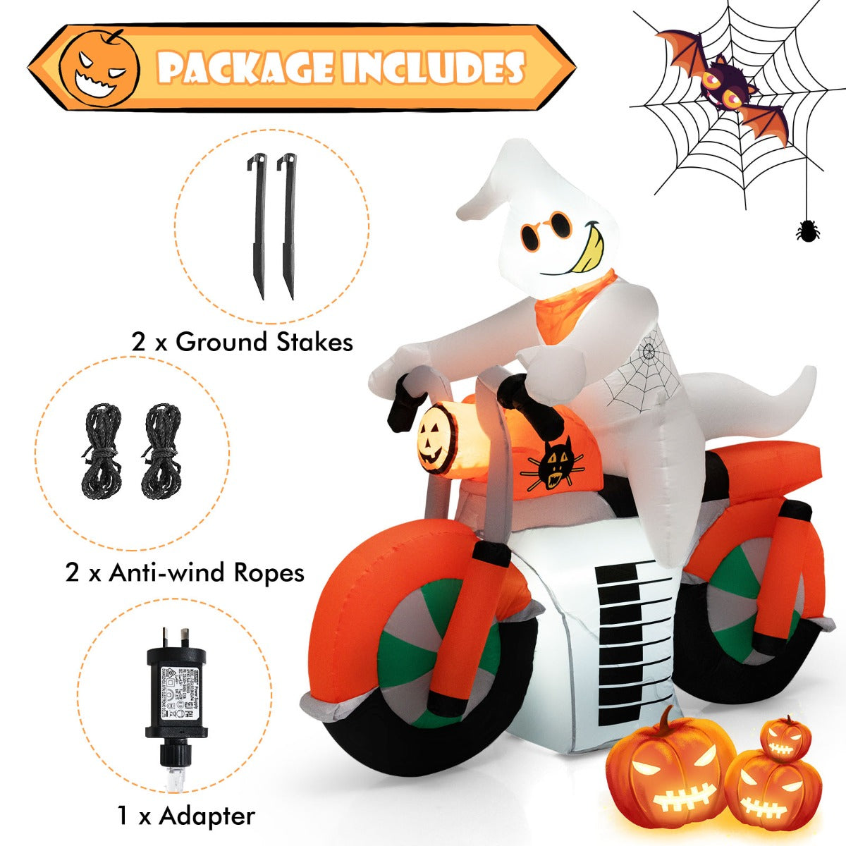 Bright LED Lights: To make the inflatable decoration an attractive addition at the Halloween night party, the ghost and motorbike are fitted with internal LED lights to attract guests and trick-or-treat kids. One of the LEDs is right at the headlight of the motorbike to enlighten the evil face.