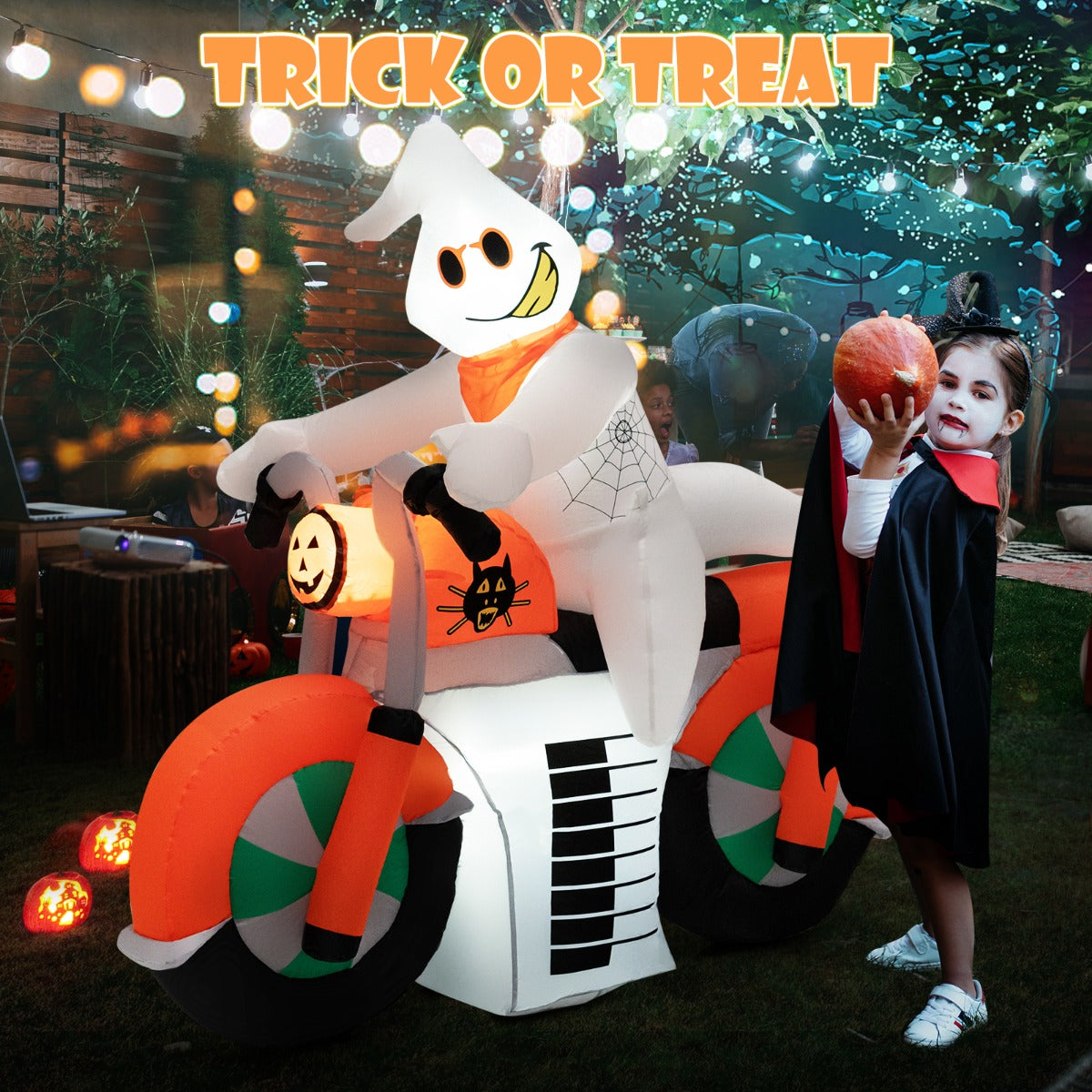 Caution! An evil ghost riding on a motorbike is rushing into your yard and going to give all those presents a shock! -This is what people would have in mind at the very first sight of the inflatable decoration. Day or night, this pre-lit decoration will always attract your eyes. And thus, it will become a hit among kids and turn your yard into the focus of the neighbourhood. You can easily set up this blow-up decoration because the built-in powerful blower will quickly inflate the ghost and motorbike. All you need to do is to zip up and plug in. What's more, the included sandbags, anti-wind ropes and ground stakes make the decorative piece endure the challenge of the outdoor environment and keep good stability all the time.