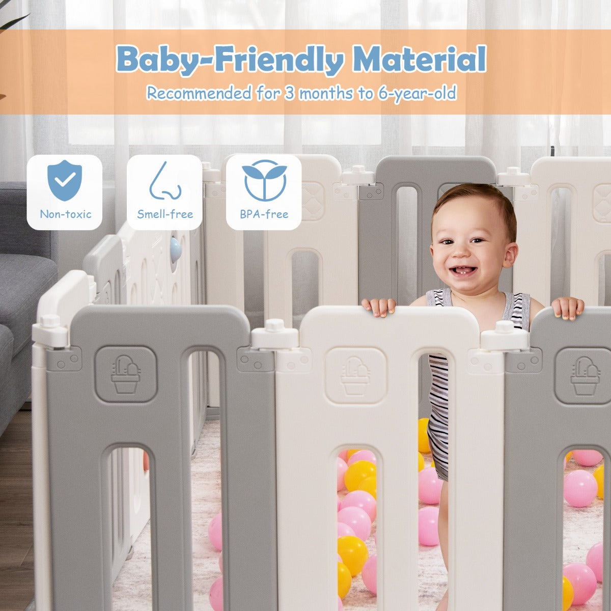 Made of premium HDPE material, our baby playpen is non-toxic and odourless. And anti-slip bases are added at the bottom of panels to greatly increase friction and allow the whole fence to stand firmly on the floor. In addition, it can be freely combined into various shapes according to your different requirements, such as squares, circles and more. Plus, the external lock ensures the safety of babies and the 64cm scientific height of the playpen is also suitable for baby to learn to stand and walk. We also specially designed a multifunctional game panel for babies. While giving kids space to explore independently, parents also have time to do their things. If you're looking for a baby playpen like this, please don't miss it!