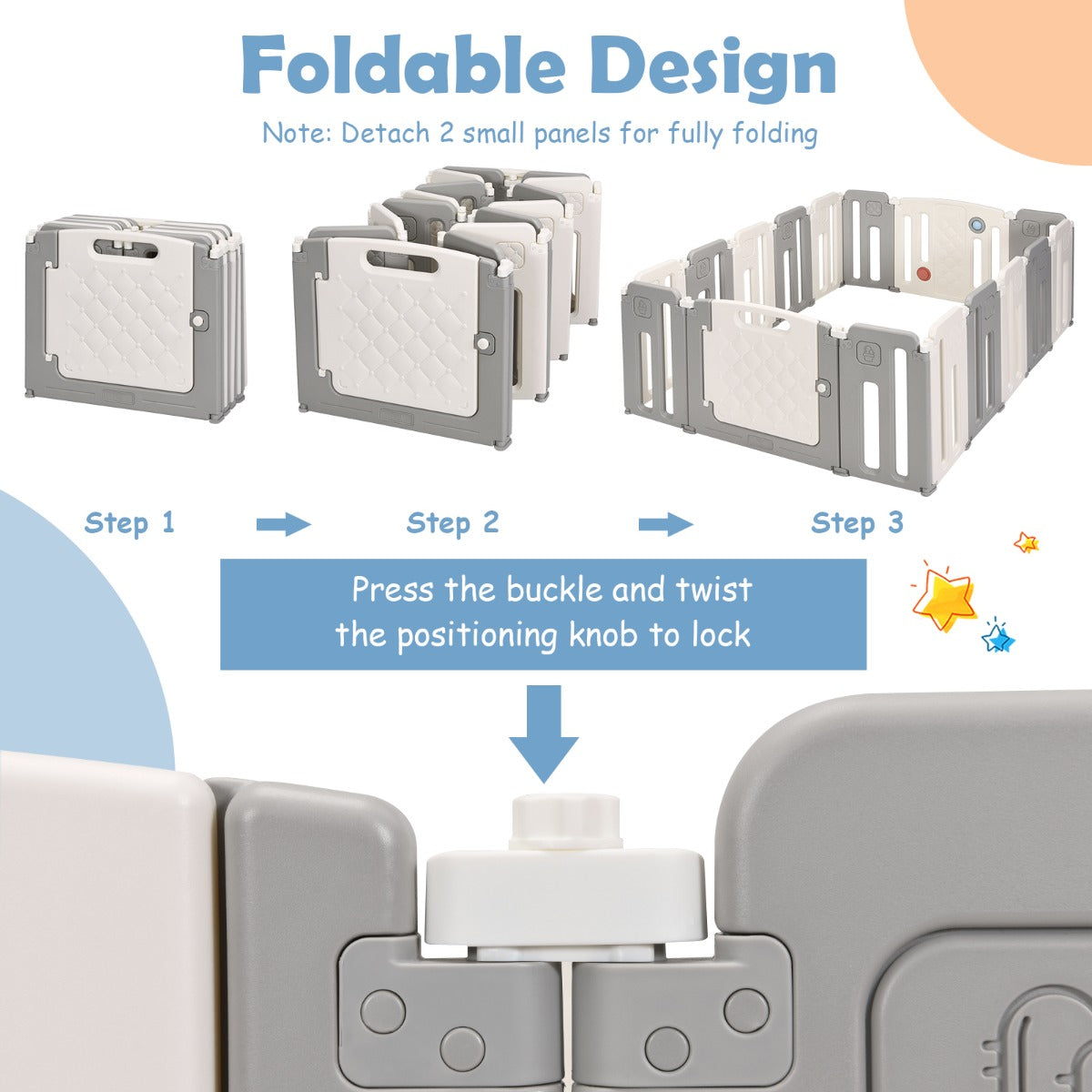 Foldable Design & Convertible Shape: Our toddler's fence can be folded for convenient storage when not in use. It has a total of 16 pieces to meet your versatile needs. By increasing or decreasing the number of panels, you can combine them into squares, circles and more shapes to create different sizes of game space for your kids.