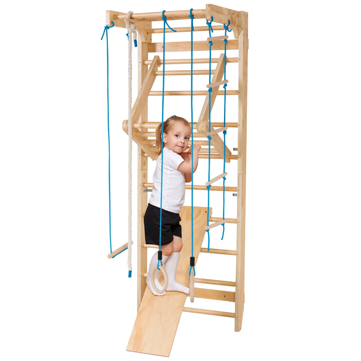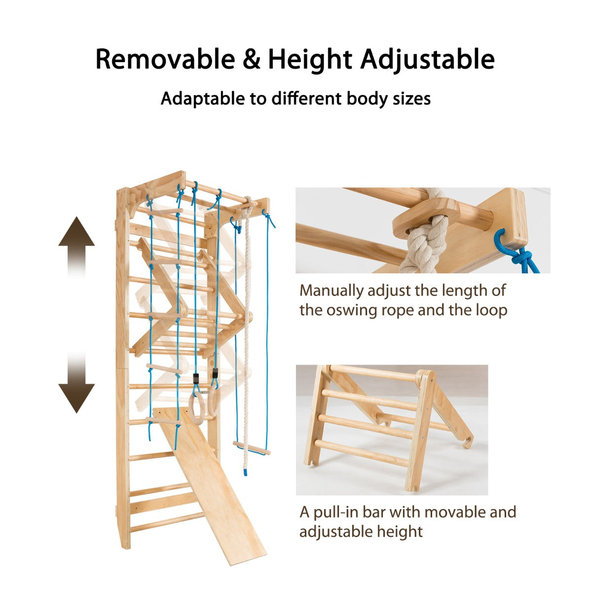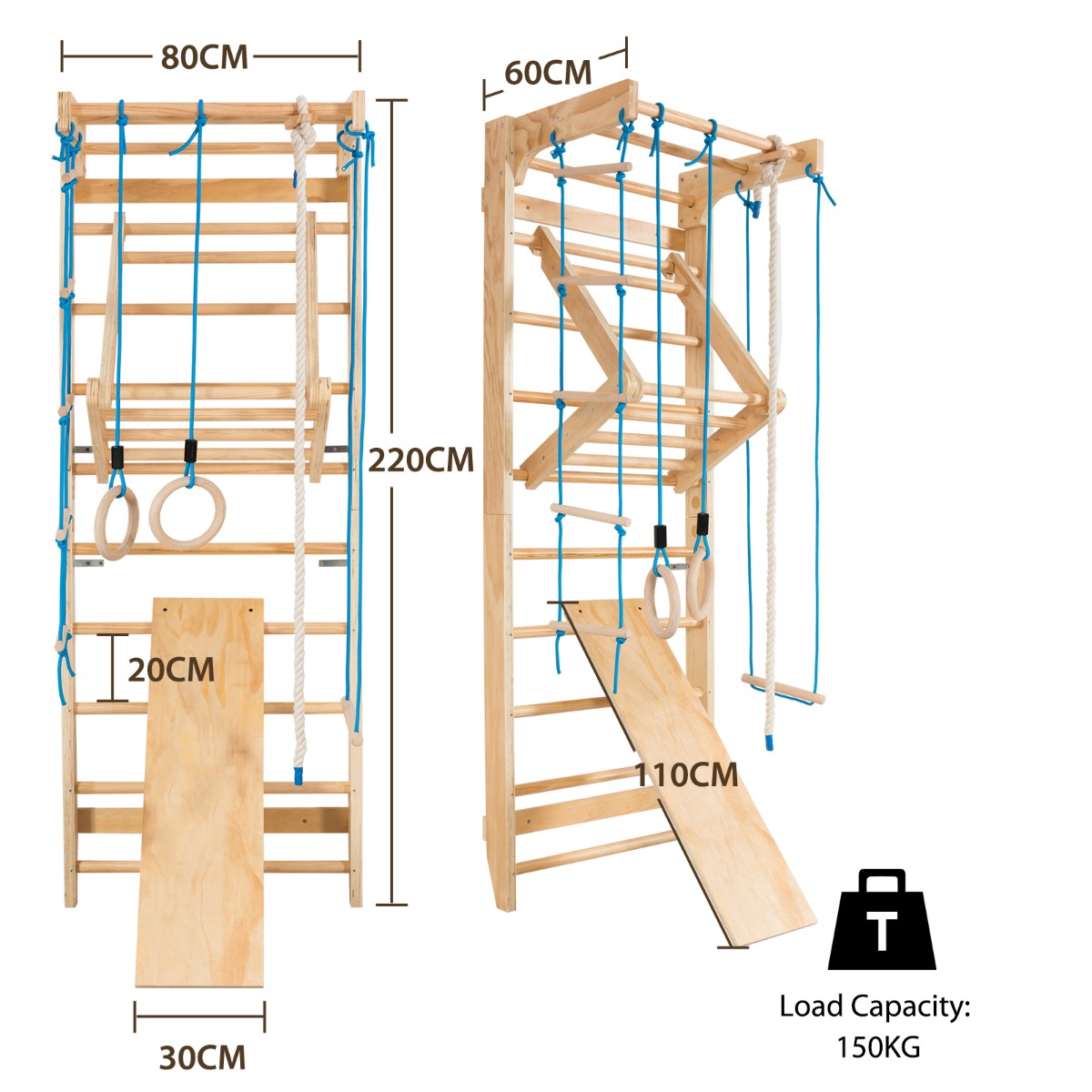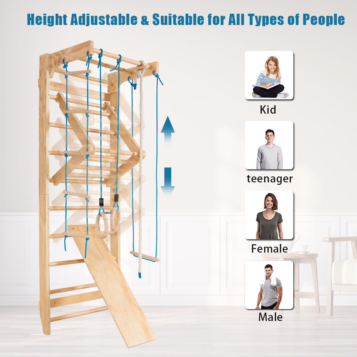 Are you looking for a multifunctional wall bars? Take a look at our products! Our wall bars include rings, swings, slides, climbing frames, climbing ropes and ladders and offer you a variety of training equipment. The wall bars have a height of 220 cm and a load capacity of 100 kg(330lbs), so it is very suitable for adults. The removable slide and chin-up bar can be easily adjusted to different positions and are suitable for children of different sizes. Whether you are a man or a woman, young or old, our wall bars can meet your needs.