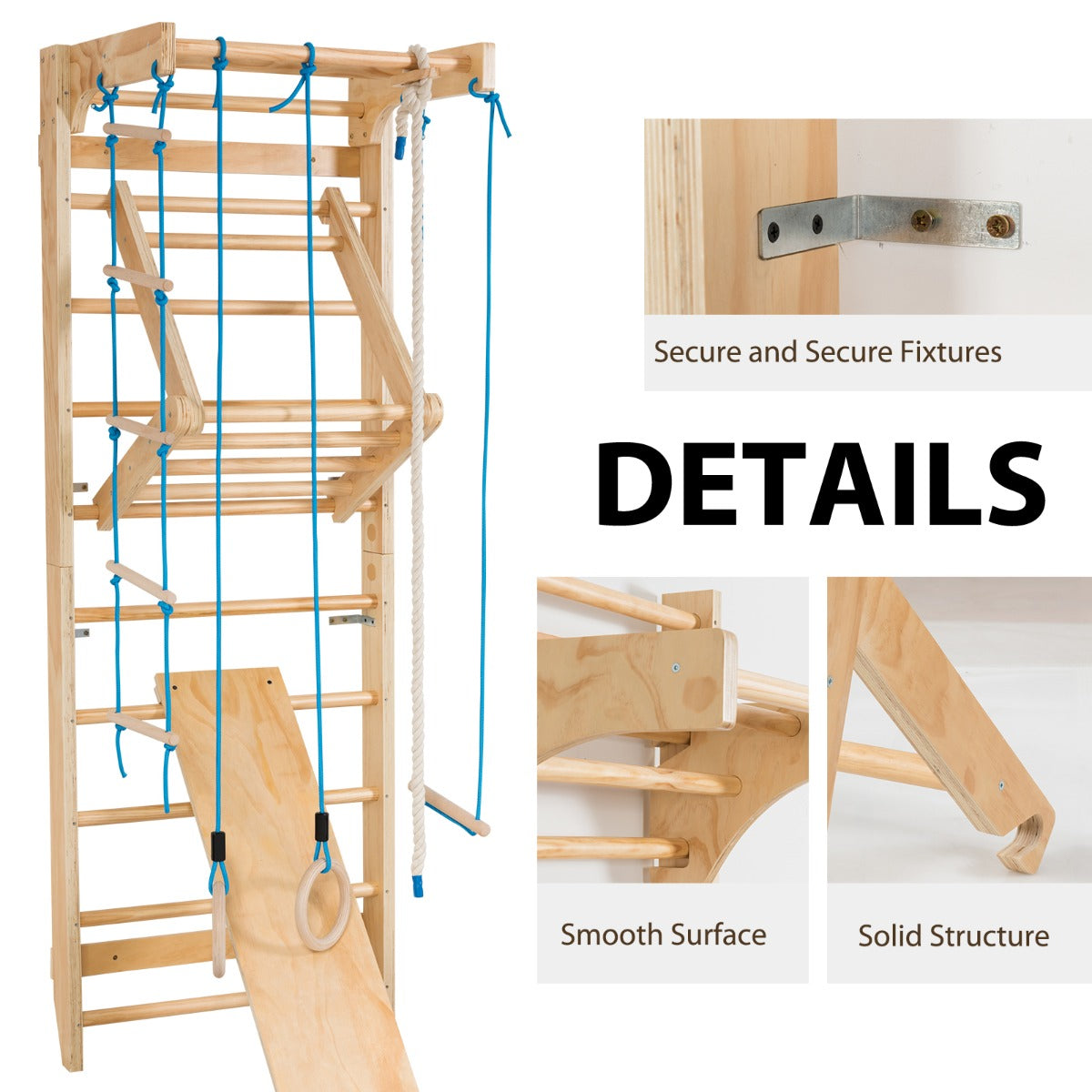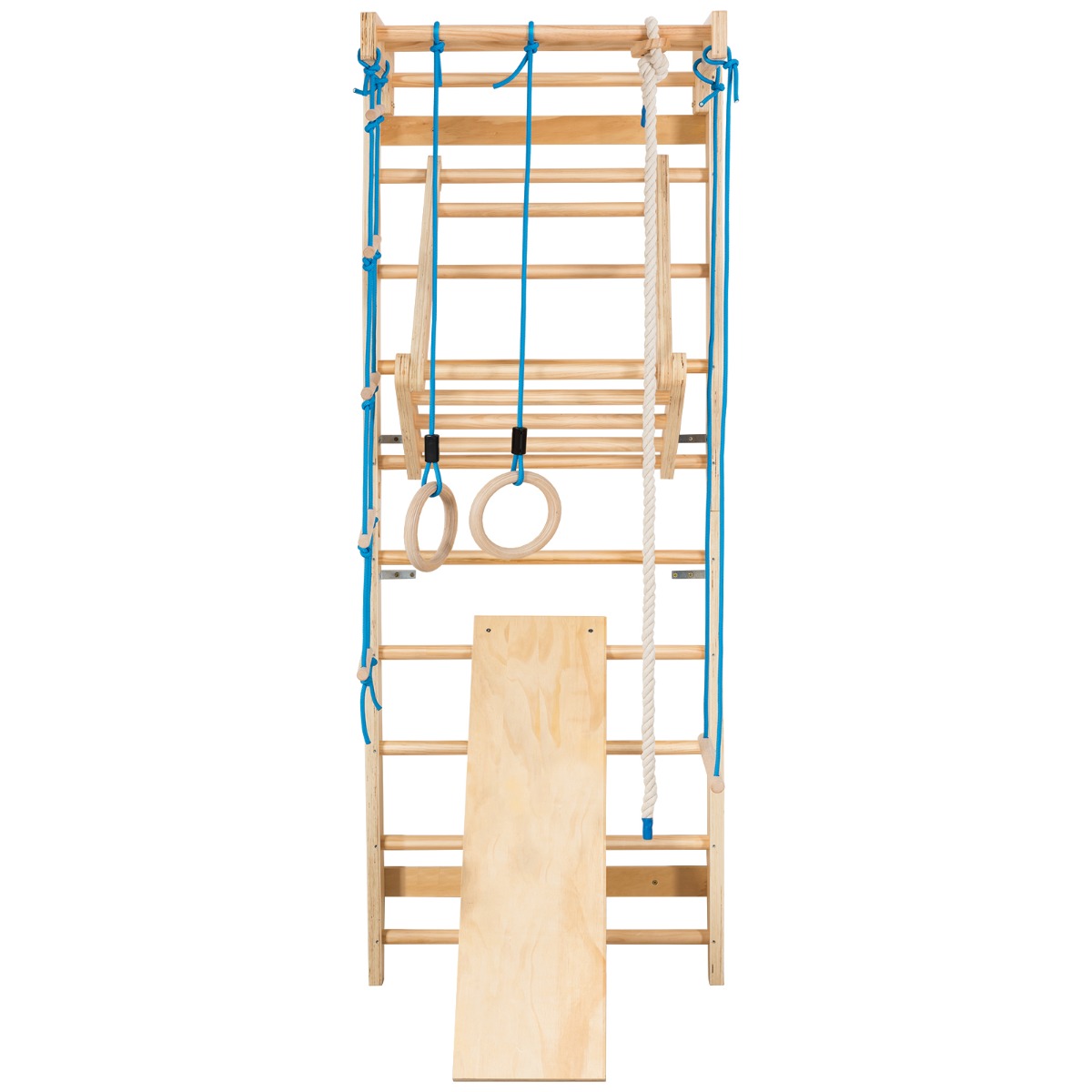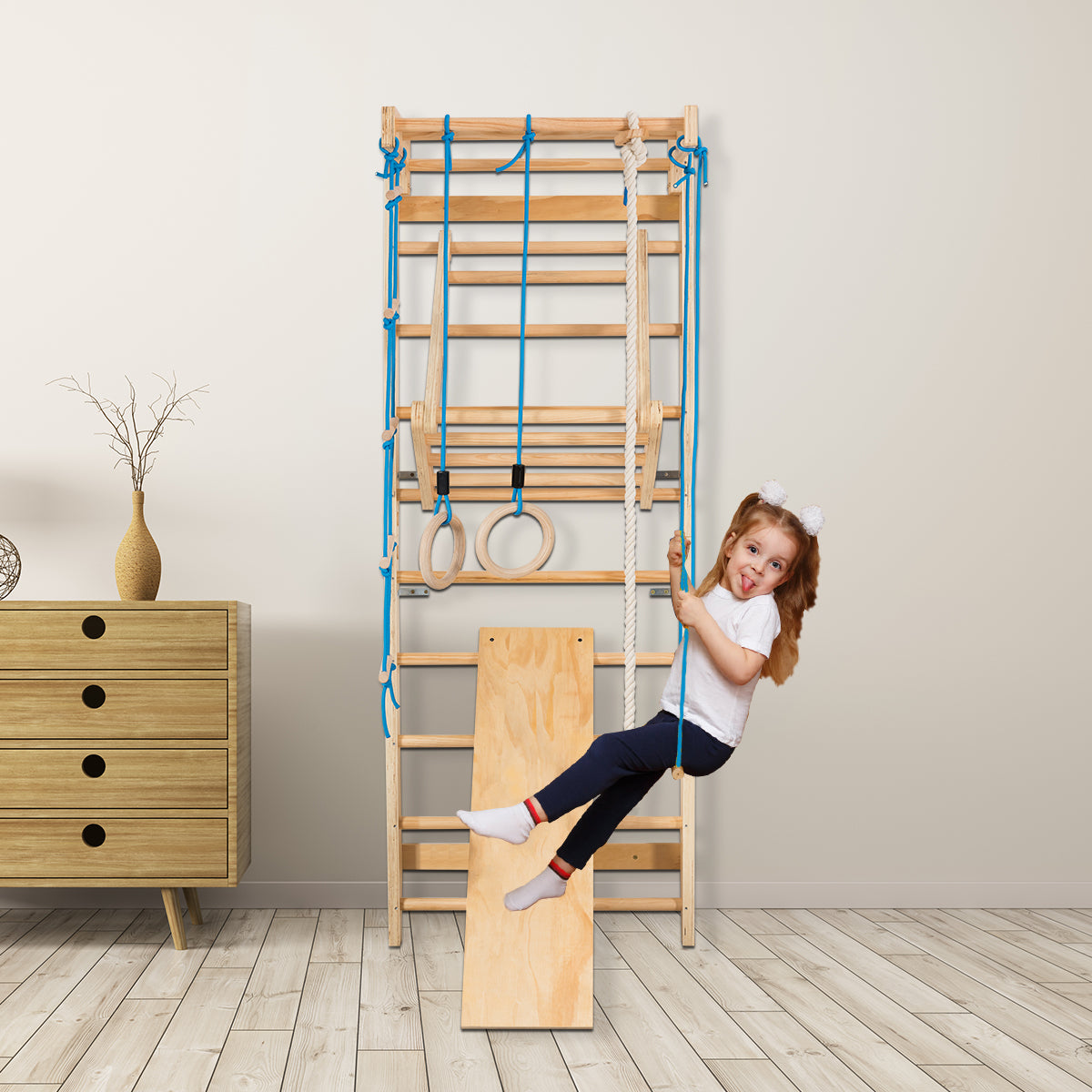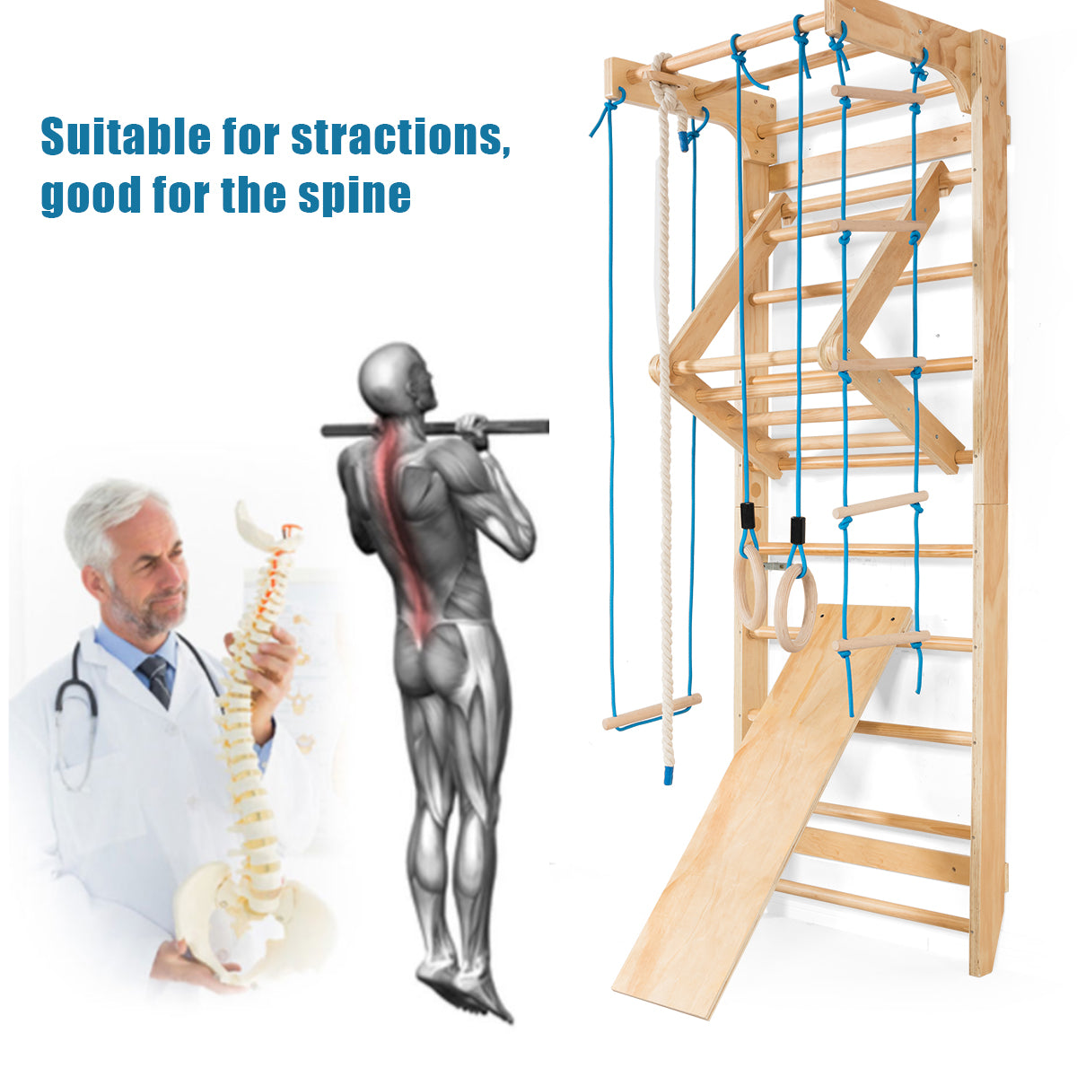 The wall bars offer a variety of functions: swing, rings, slide, climbing frames, climbing ladder, pull-up bar, etc. Many different training devices are integrated on the wall bars, which are very practical and convenient. Therefore, the wall bars can meet many of your exercise needs.
