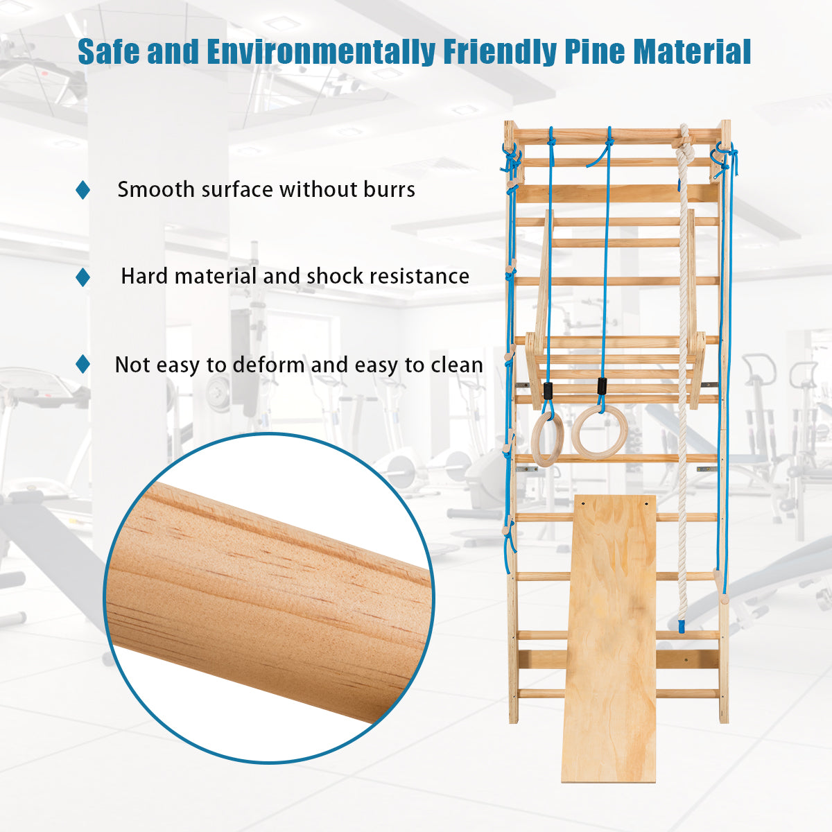 The wall bars are mainly made of solid wood and plywood, which has good durability. The painted surface has good corrosion resistance and is easy to care for. In addition, the surface is smooth and burr-free so that the skin is not scratched.
