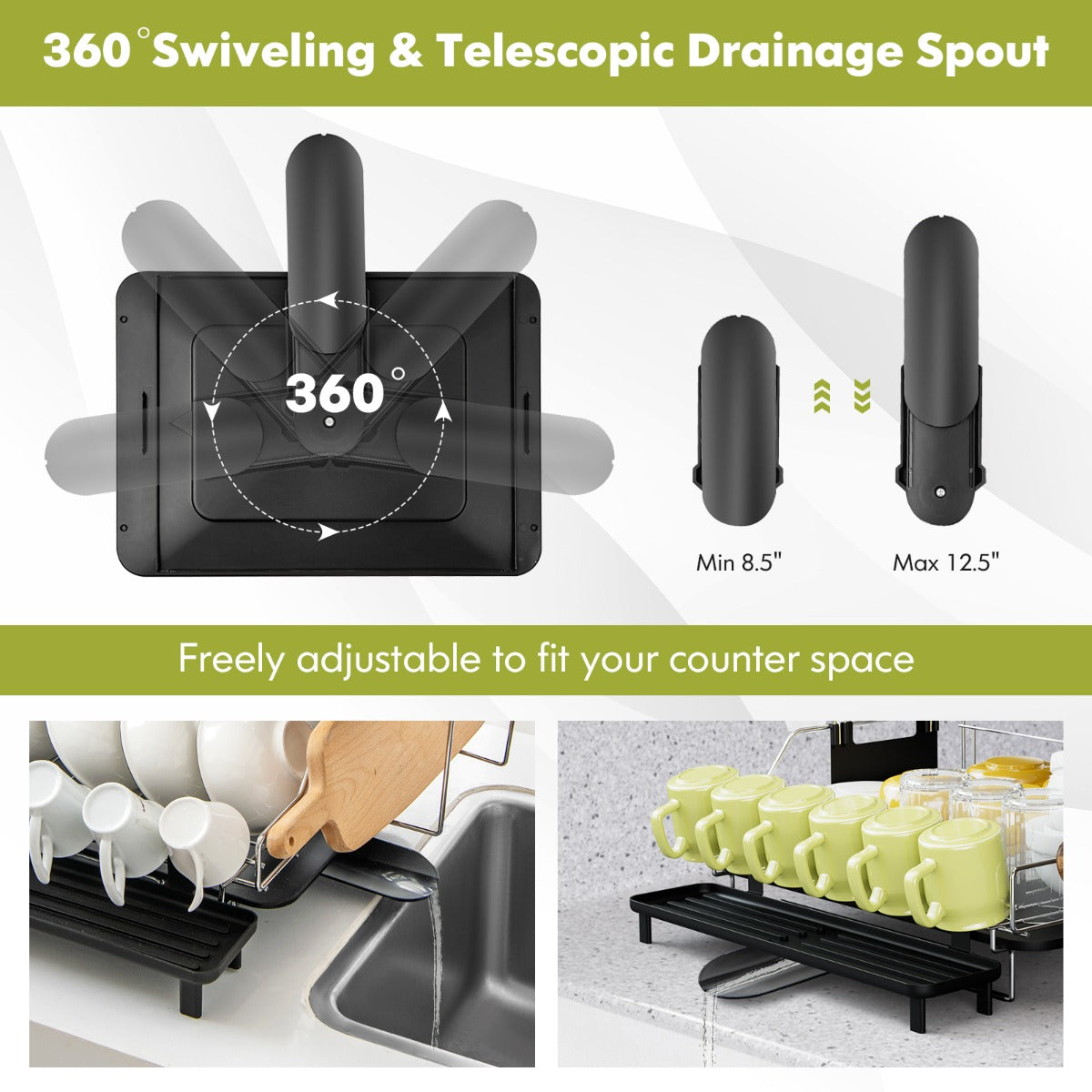 Drip Tray with Swiveling Spout: Our dish drying rack is designed with a removable drip tray with a drainage hole for convenient drainage. The drip tray features a 360° swivelling spout with an extendable design(from xx" to xx") to lead the water flow in all directions.