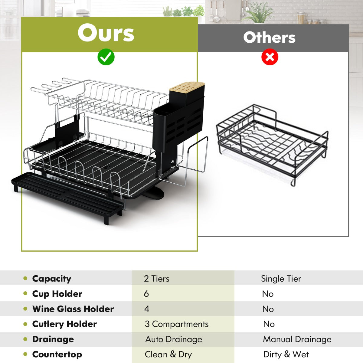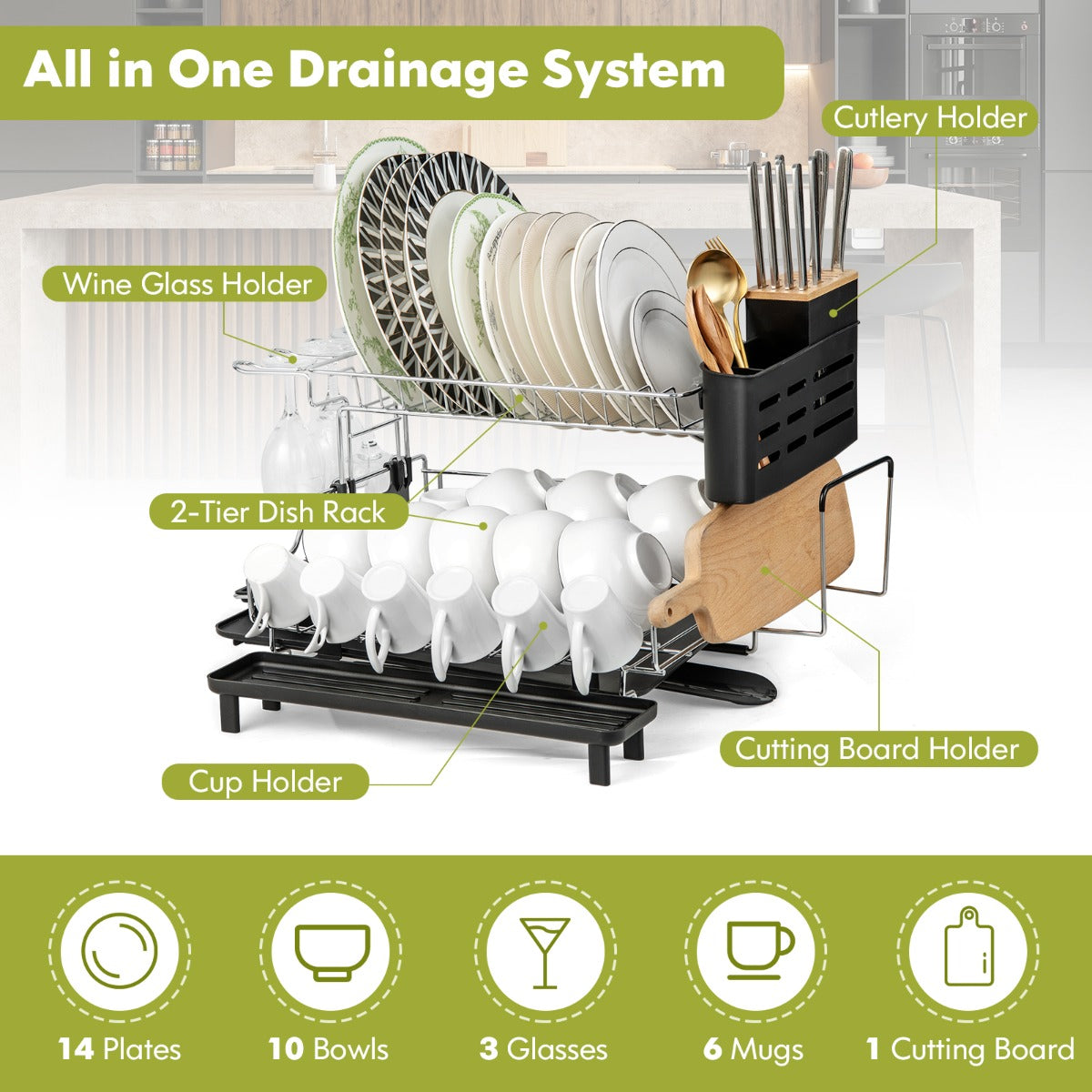 2-Tier Dish Drying Rack: Our 2-tier dish drying rack can store about 14 saucers, 10 bowls, 6 mugs, 3 glasses and 1 cutting board, fulfilling your daily needs. This dish drainer rack not only helps you to keep your tableware well organized but also ensures quick access to what you need.