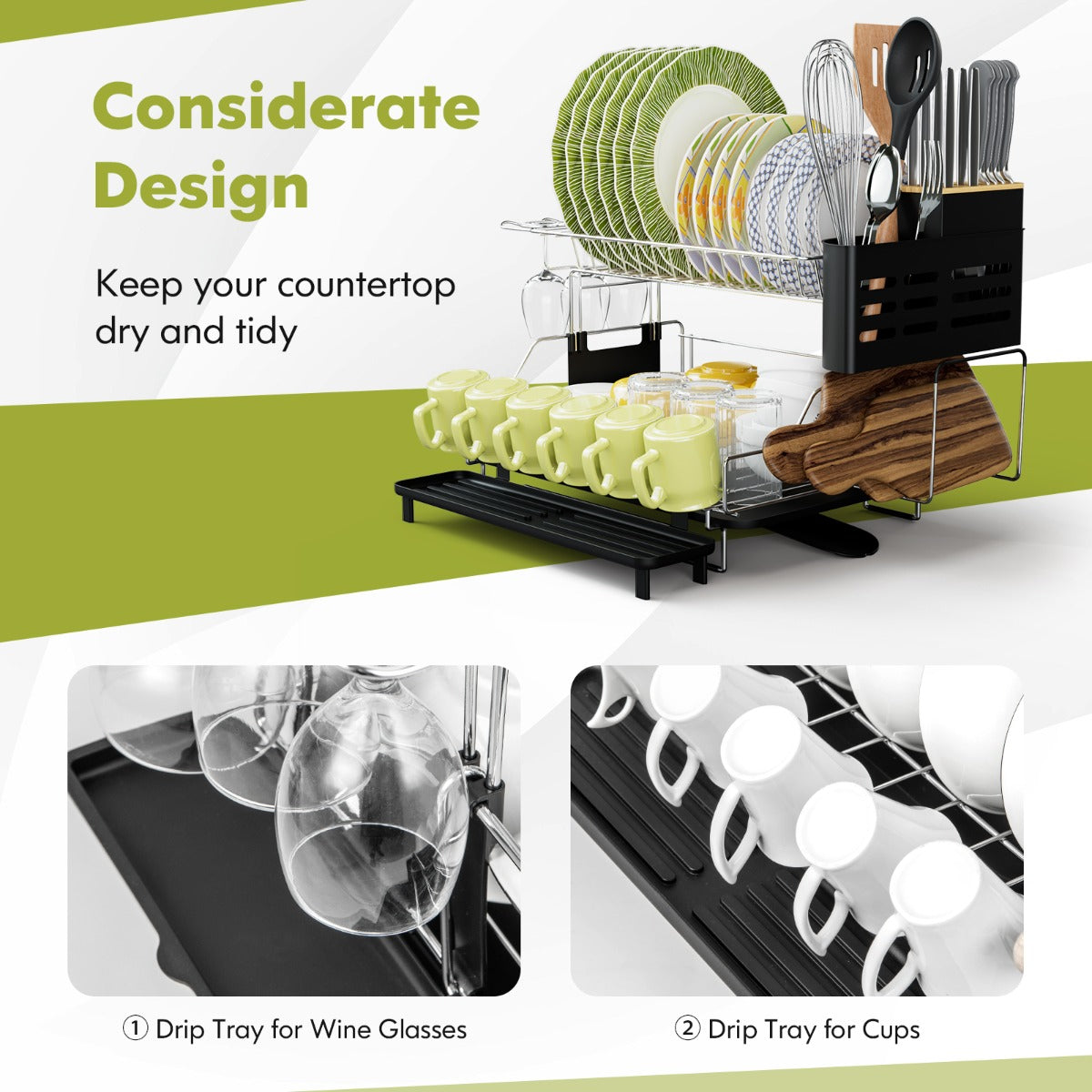 Our 2-tier dish drying rack can hold about 14 saucers, 10 bowls, 6 mugs, 3 glasses and 1 cutting board at the same time, which is suitable for family use. The detachable top layer allows you to freely choose to use 1-tier or 2-ter placing space. Besides, all water will drop into the sink through the 360° swivelling spout of the drip tray. Heavy-duty metal frame with anti-slip feet keeps it durable and stable. Additionally, it's easy to assemble and clean.