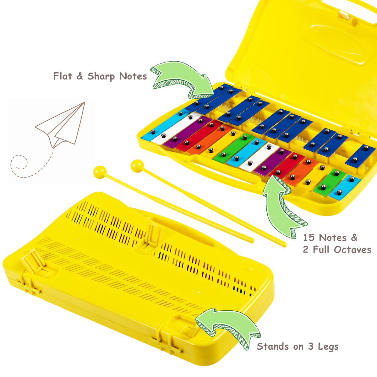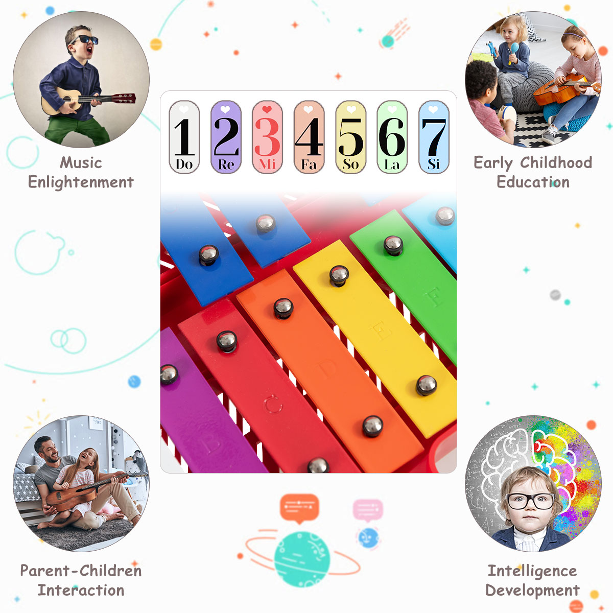 Children-friendly Design: This glockenspiel is specially design for children. The vivid color of notes can stimulate children' s vision while the easy-hold mallets allow kids use the glockenspiel simply and improve their hand control ability.