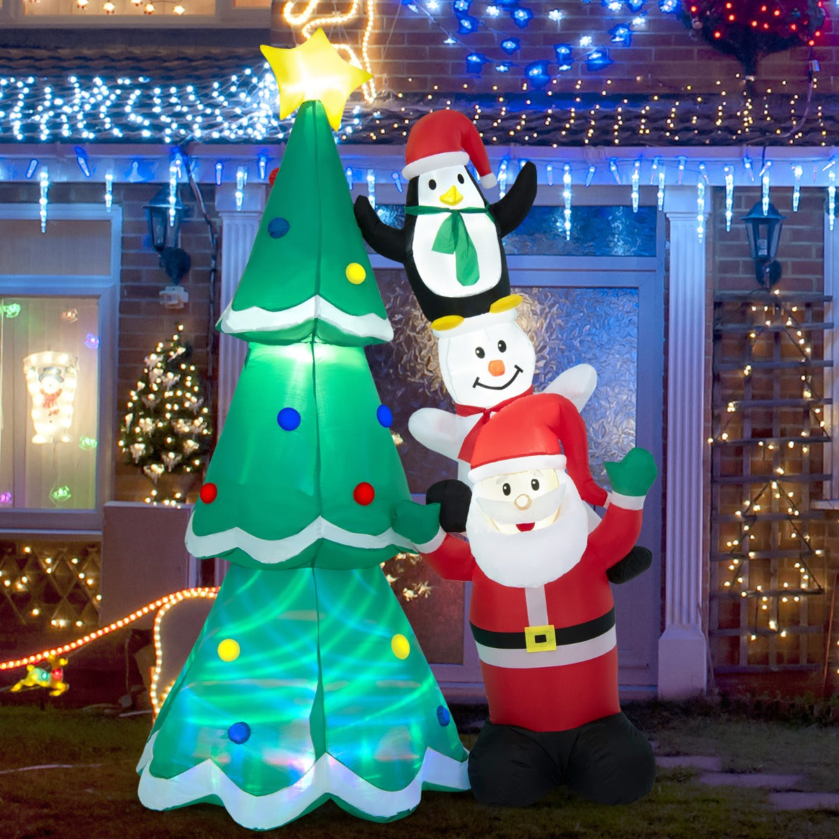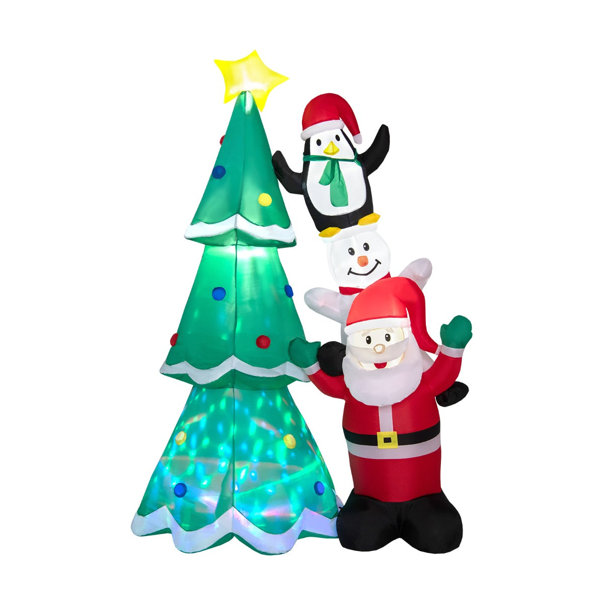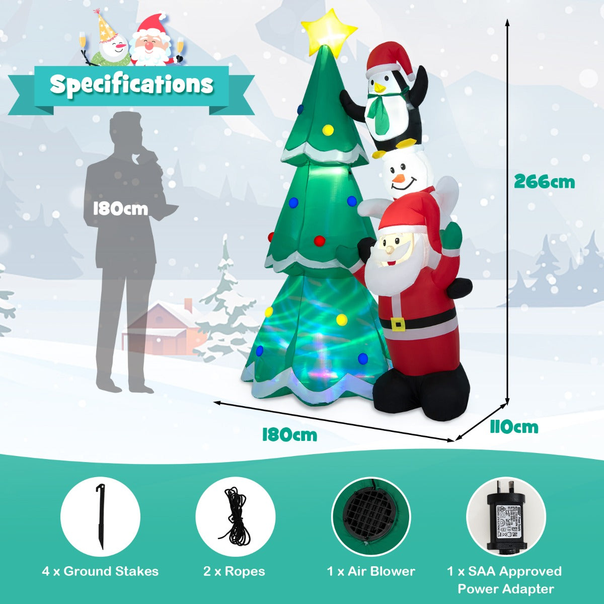 Perfect for Christmas: The 266cm tall inflatable Christmas tree, with Santa Claus, a snowman and a cute penguin stacking up aside, gives the most instant association to a merry holiday. You can set this large decoration in the yard, garden or patio, to give a warm greeting to neighbours, party guests and family members.