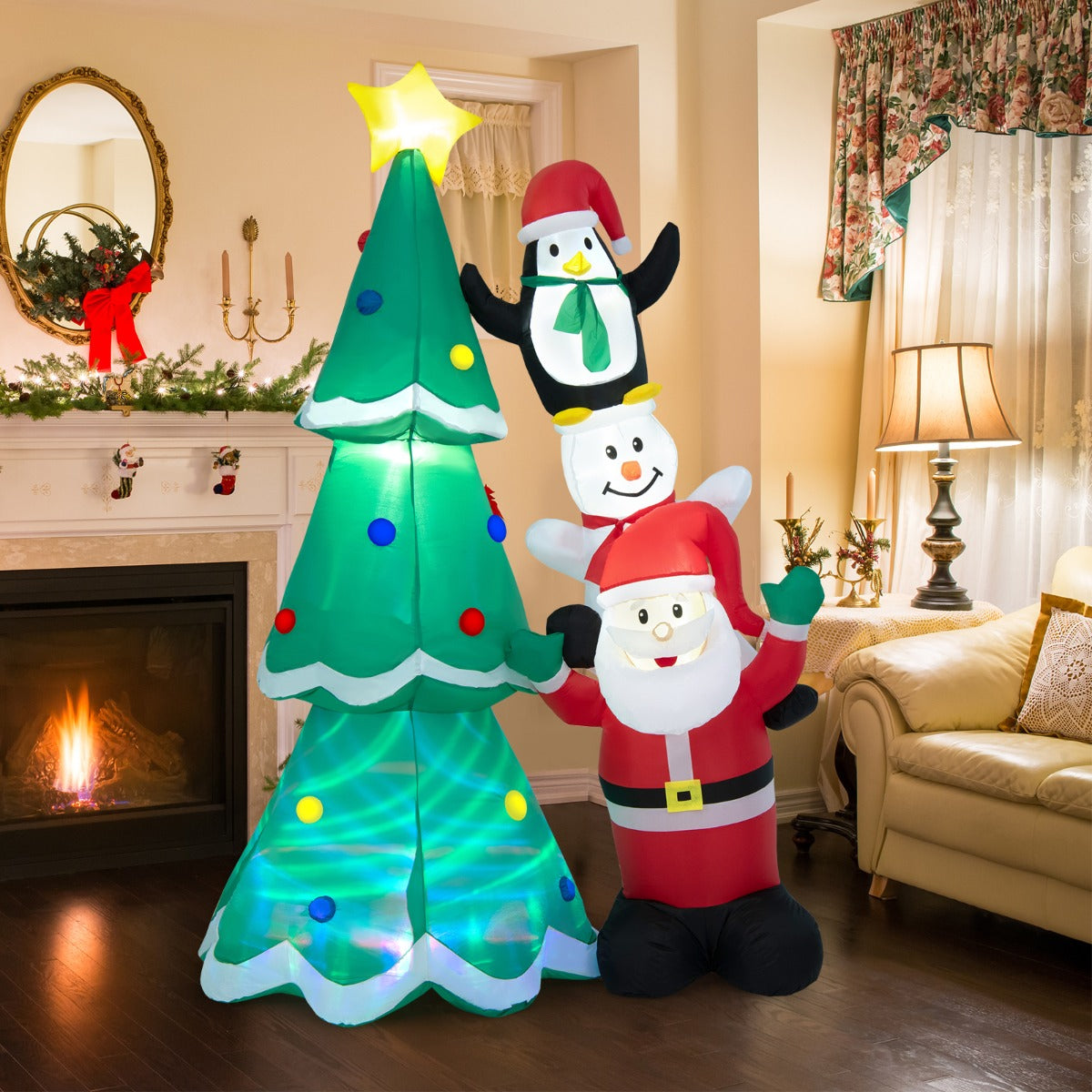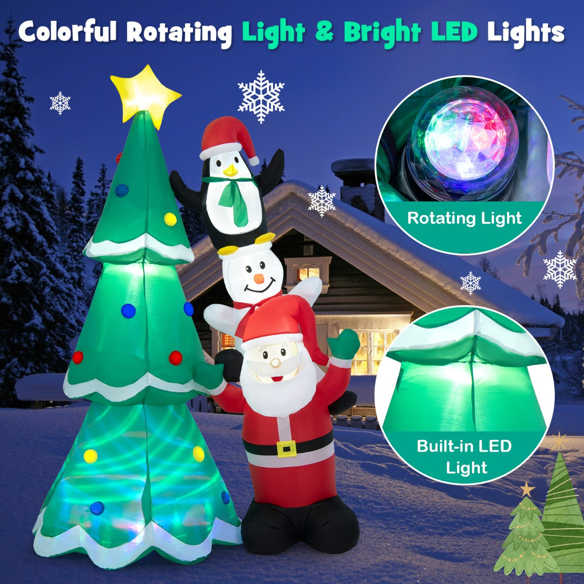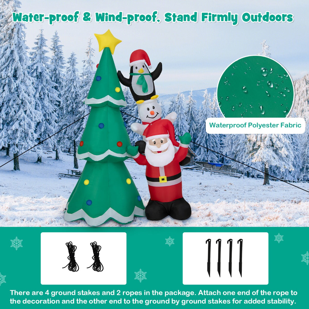 Perfect for Christmas: The 266cm tall inflatable Christmas tree, with Santa Claus, a snowman and a cute penguin stacking up aside, gives the most instant association to a merry holiday. You can set this large decoration in the yard, garden or patio, to give a warm greeting to neighbours, party guests and family members.