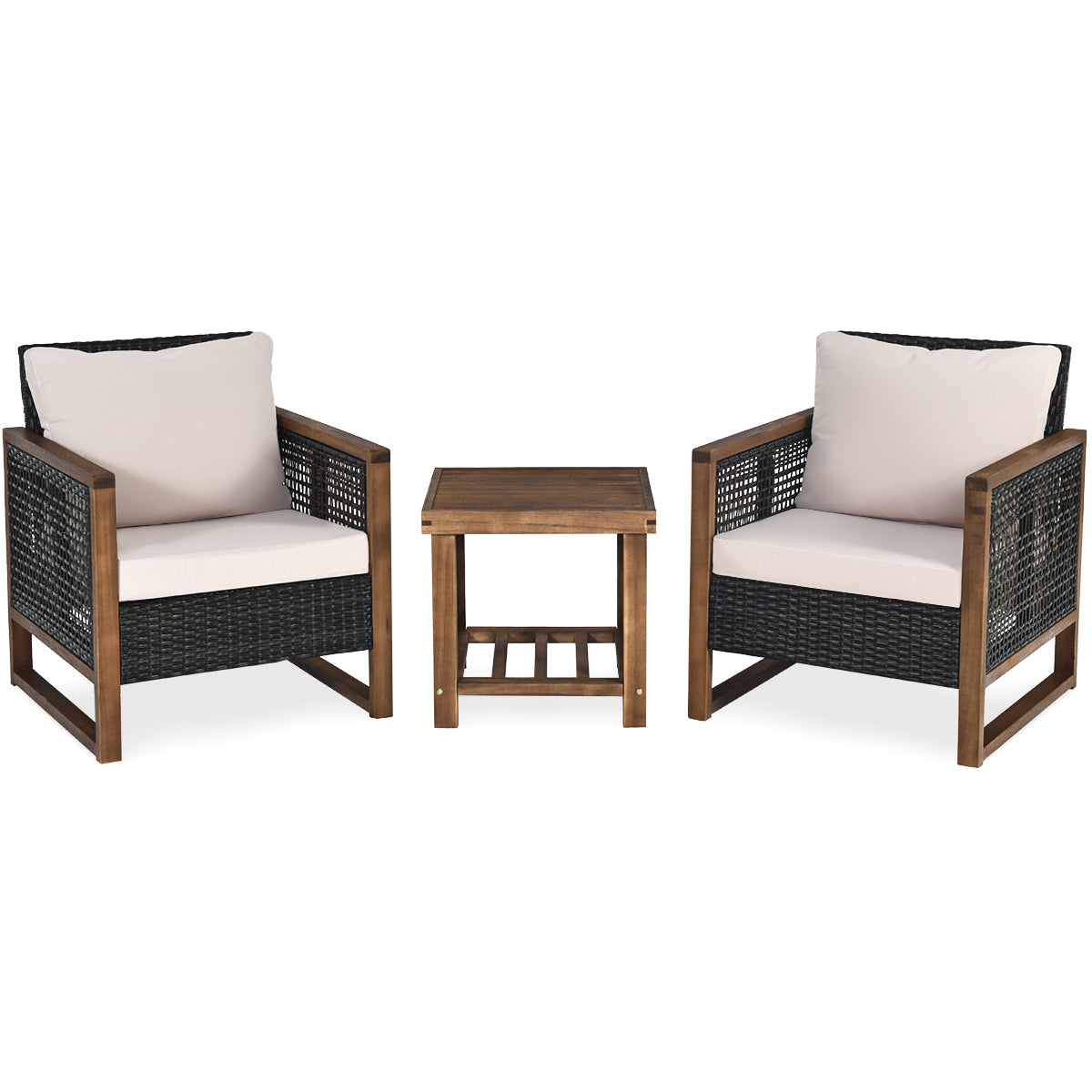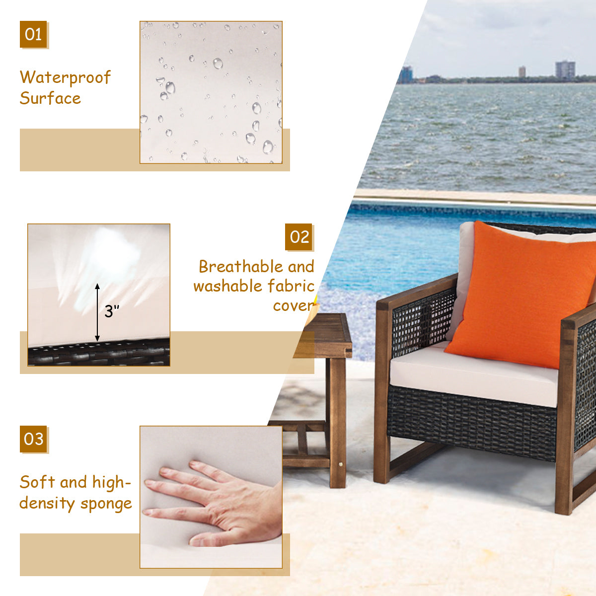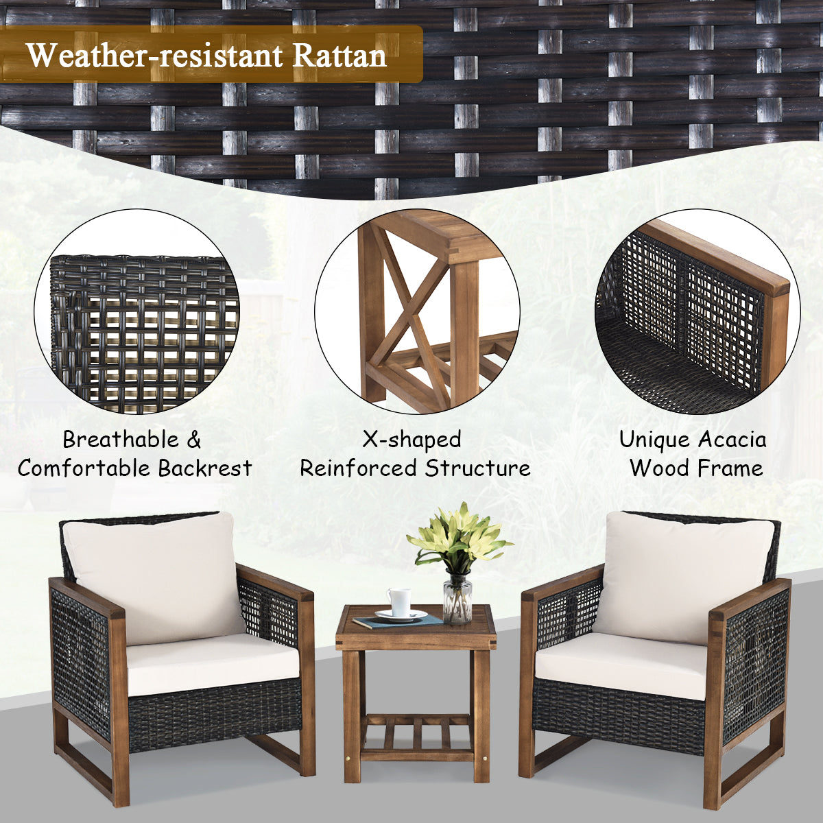 This 3 pcs patio rattan furniture set is perfect for having a nice outdoor time with family or good friends. Combined with superior rattan and acacia wood, this outdoor furniture set has excellent weather resistance and an extremely long service life. A stable structure and thoughtful ergonomic design bring you a nice seating experience. Meanwhile, the soft and thick cushions filled with high-density sponges won't collapse after long-term use. With a zipper design, you can clean the cover conveniently. Besides the patio, it is also suitable for your backyard, balcony, garden and even living room.