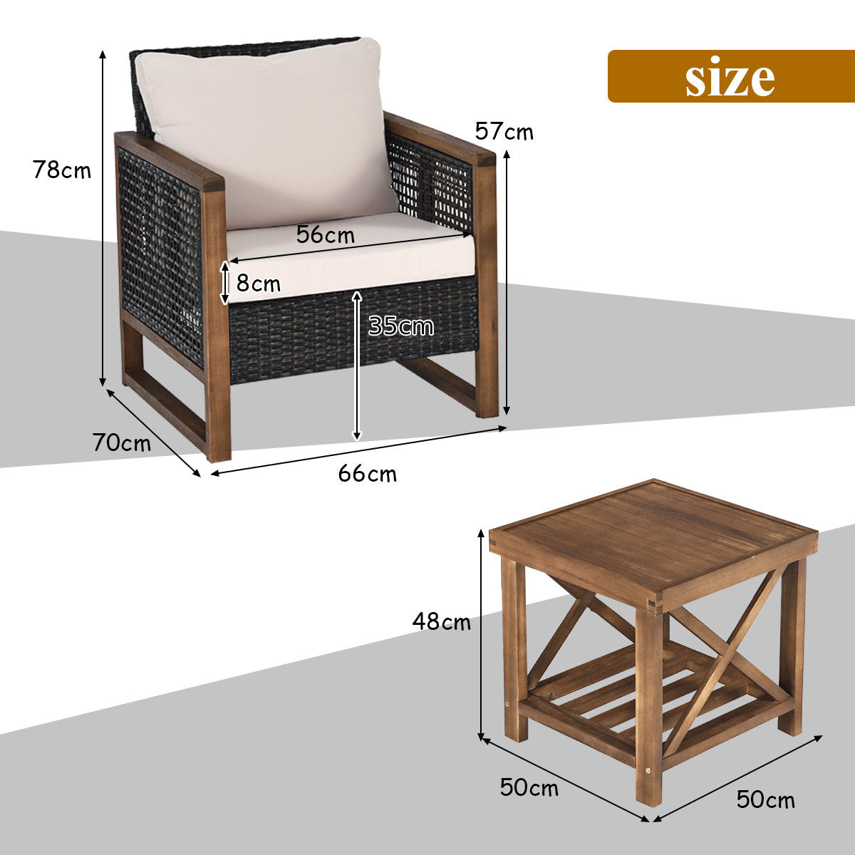 Functional Coffee Table: This bistro set includes a 2-tier coffee table that is made of acacia wood. The spacious acacia wood tabletop and the lower rattan shelf offer ample space for your drinks, snacks, magazines or other decorations. And the cube appearance makes the whole set look elegant and mature.
