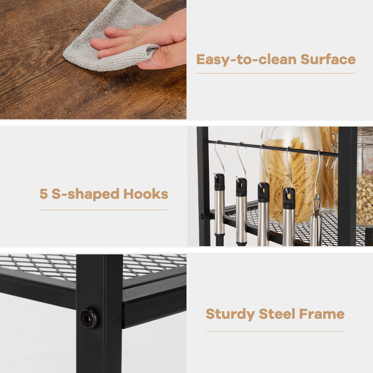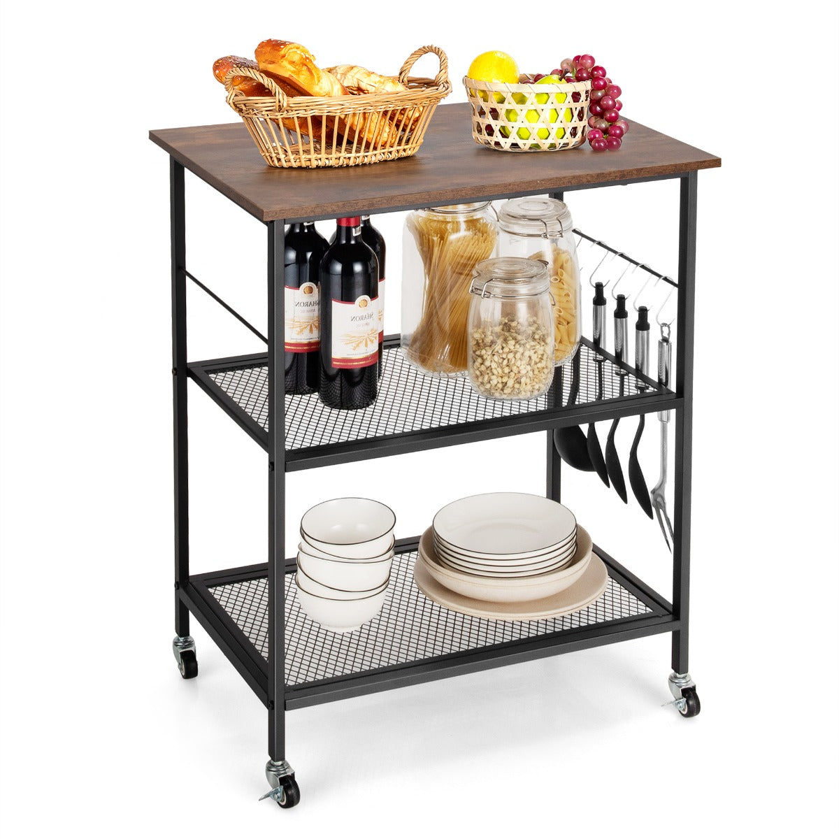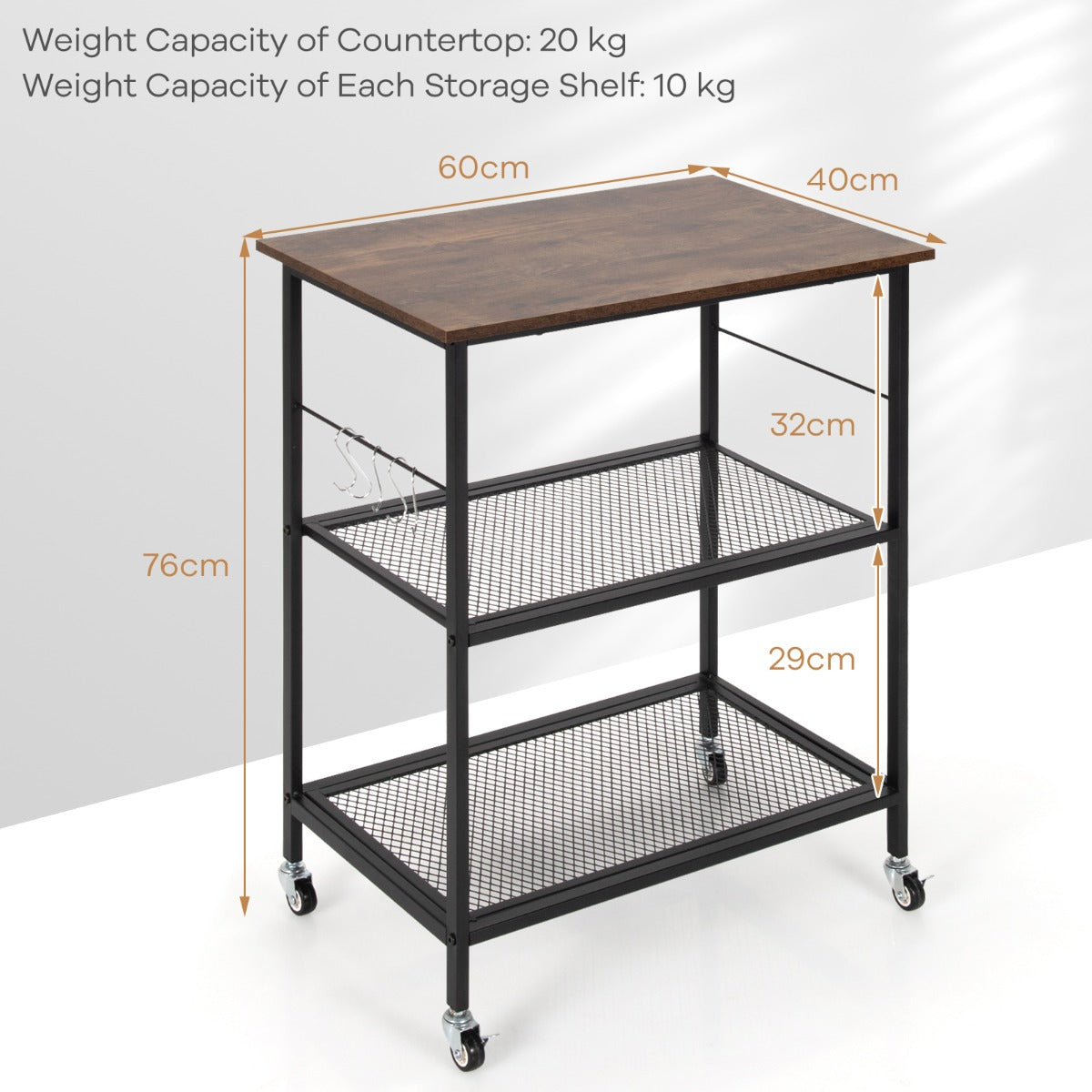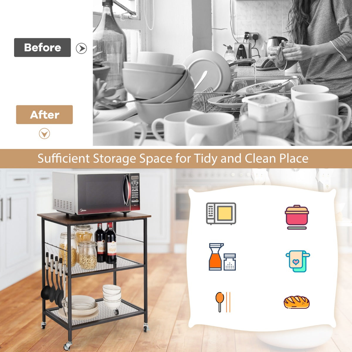 Spacious 3-tier Open Shelf: Designed with 3 large open shelves, our serving cart provides ample storage space for your kitchen and dining room necessities, thus keeping the kitchen tidier and well-organized. Also, the sidebars and 5 hooks allow you to hang spoons, cups and other tools for easy access. More, this space-saving cart helps you save space and fit in a small place.