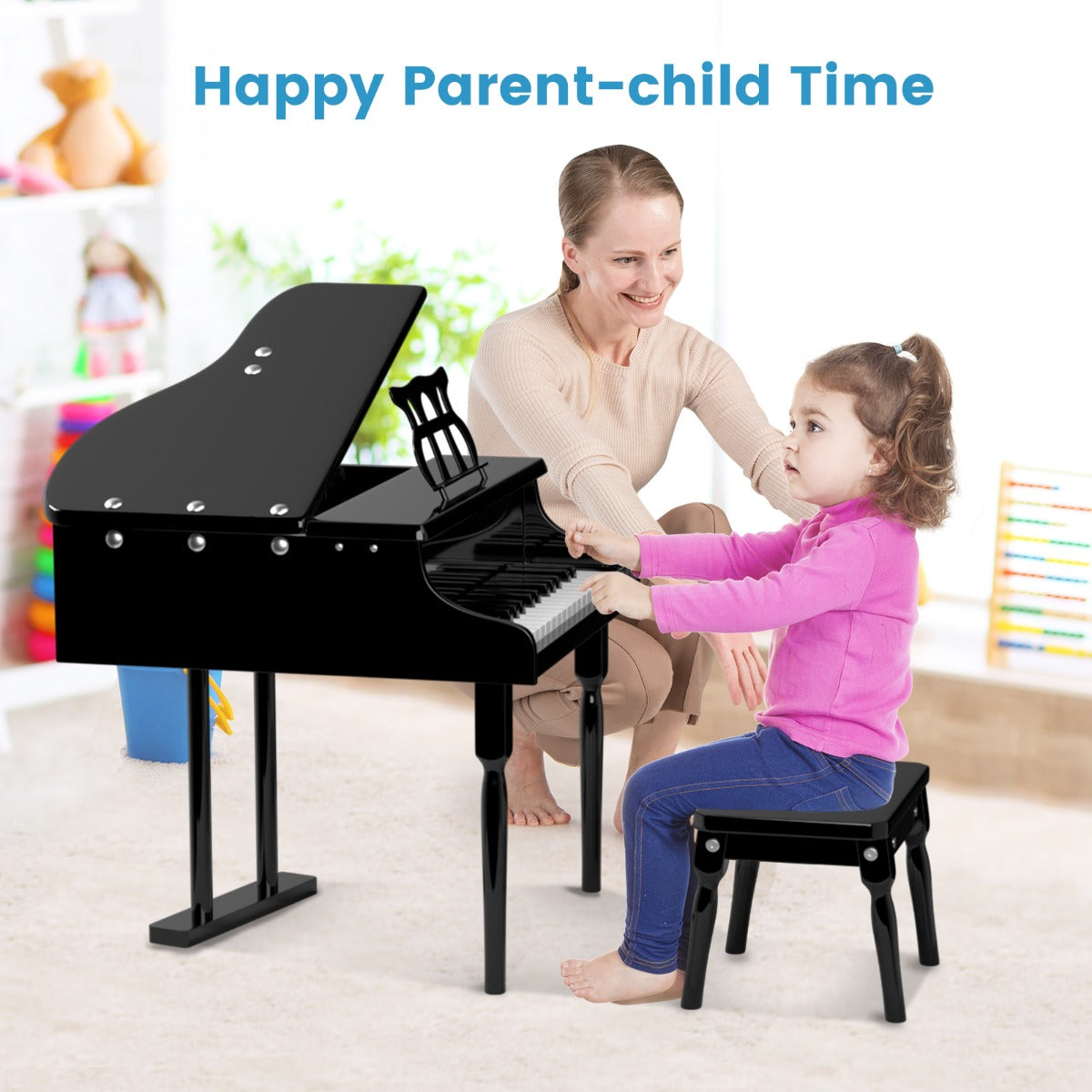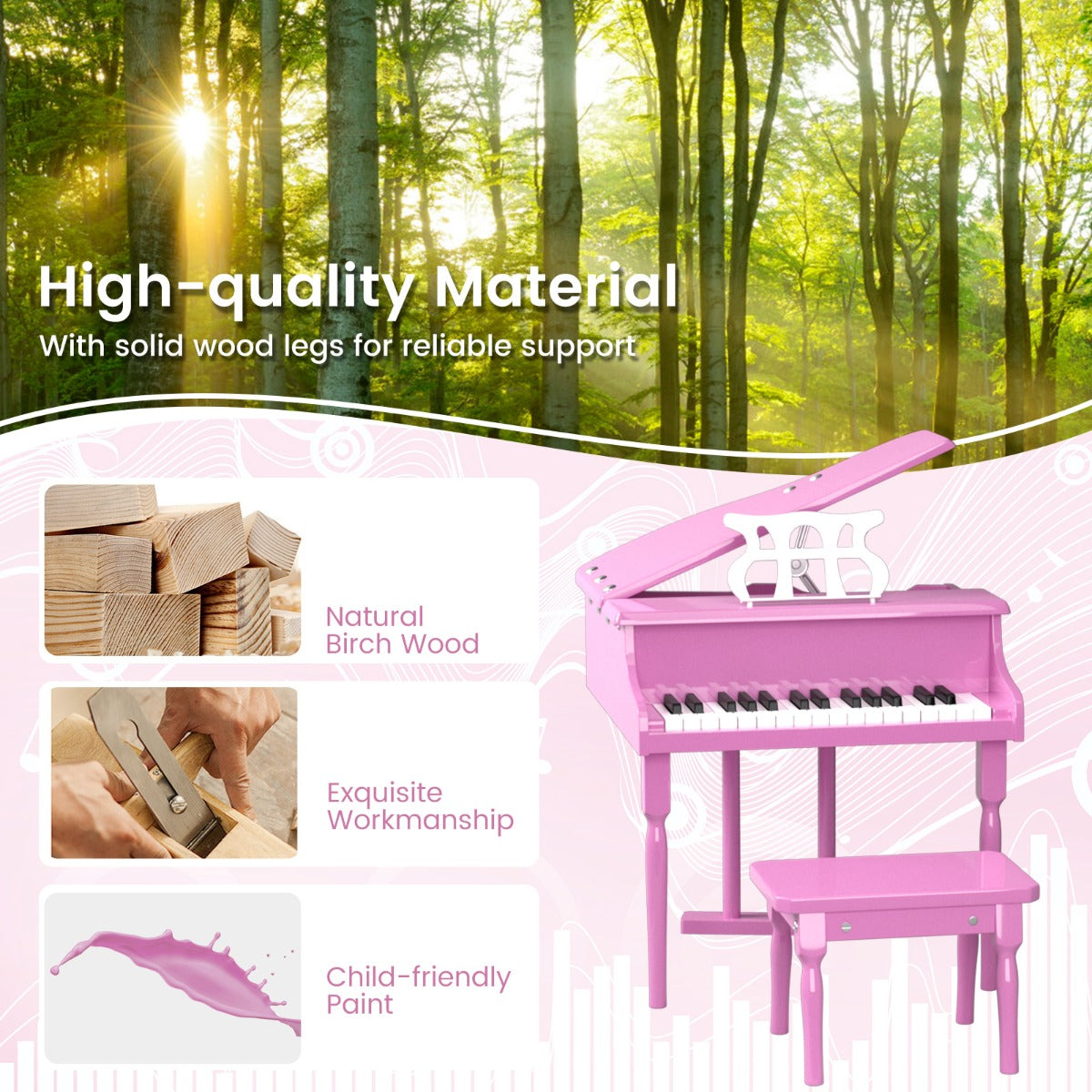 If you are looking for an instrument to inspire your child's interest in music, don't miss out this mini grand piano toy! This kids' classical piano features 30 ABS keys, which produce wonderful and beautiful tones. Plus, the appropriate key size makes it easier for your child's little hands to play. High-hardness birch wood legs ensure many years of use. Moreover, the flip-over lid is effortless to open and close without the risk of pinching. This musical toy is good for promoting brain development, improving imagination, strengthening hand-eye coordination, building confidence and more. The dream of becoming a pianist starts with our toy grand piano!