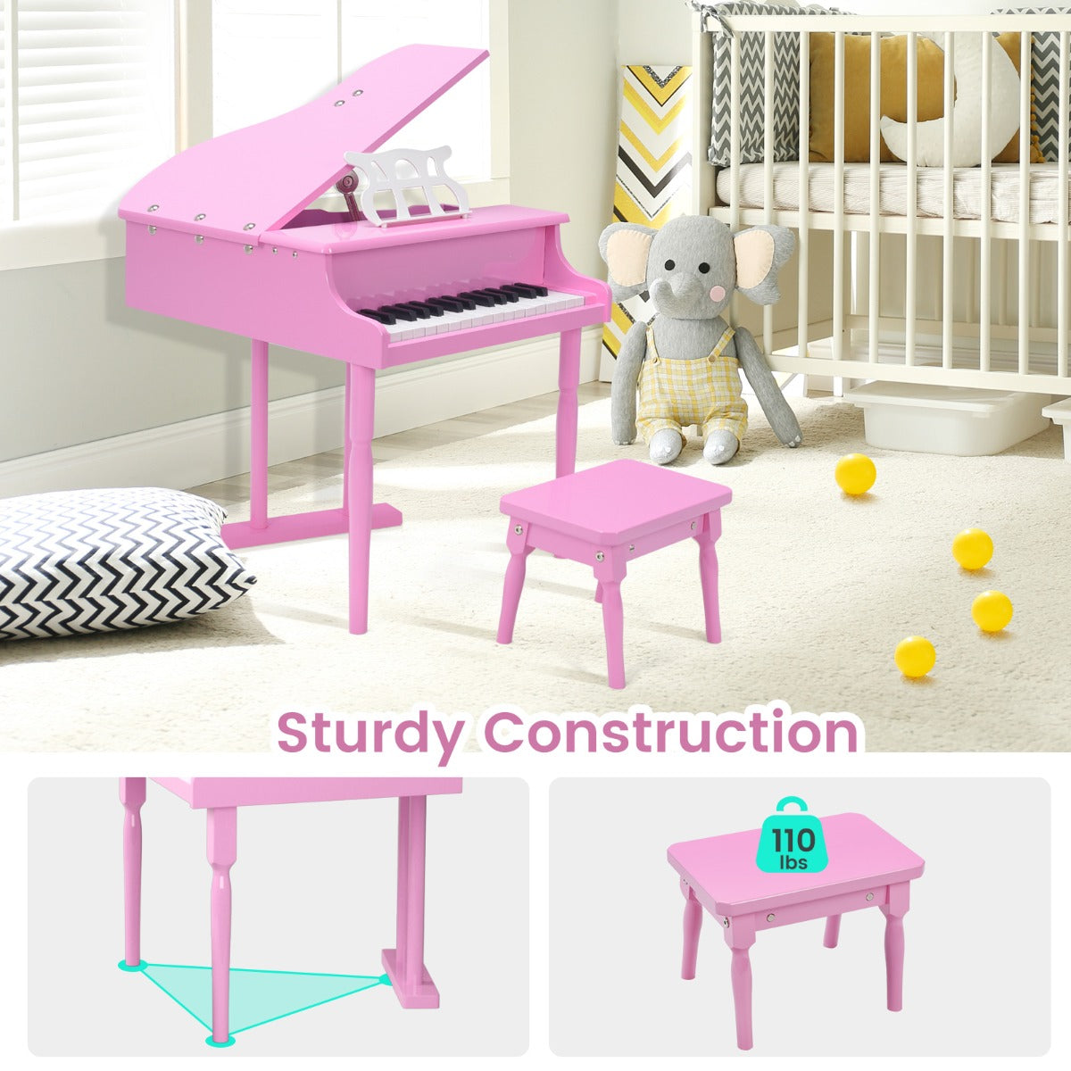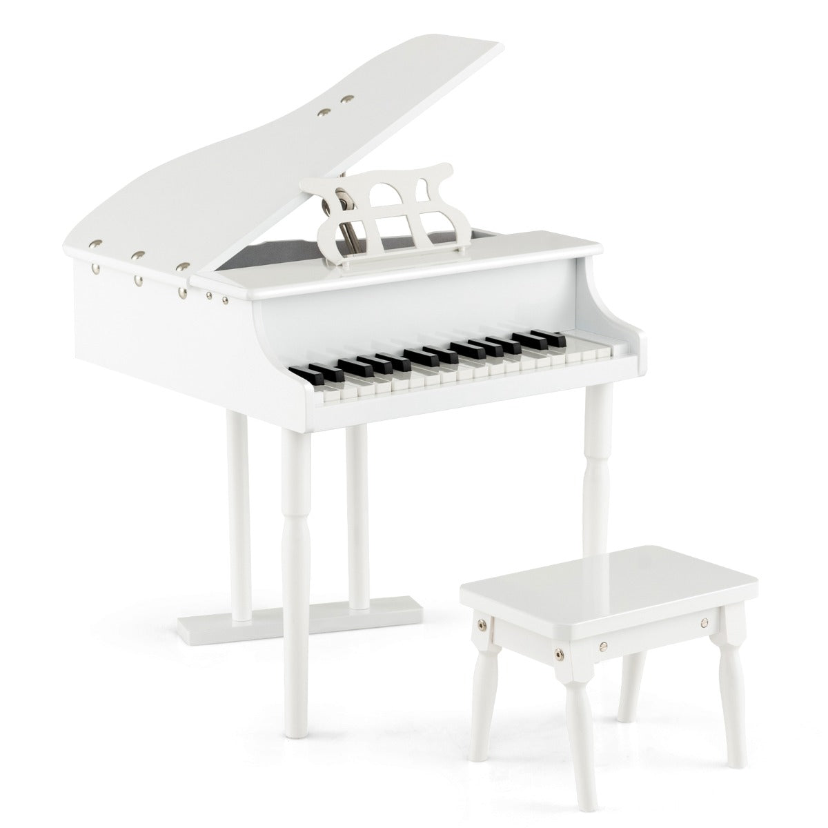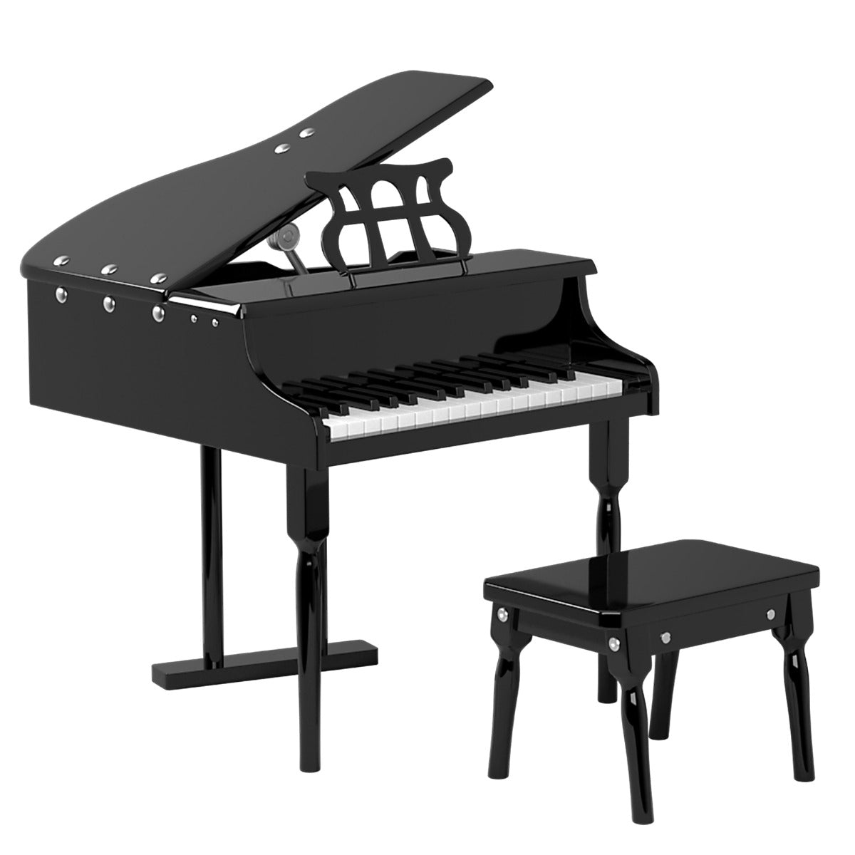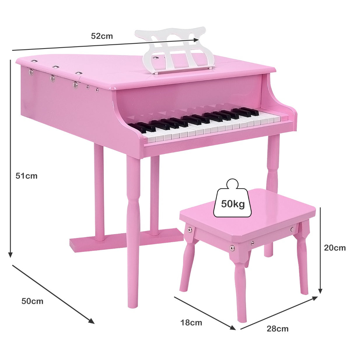Easy Assembly & Elegant Look: Thanks to the simple construction and detailed instructions, this kids grand piano with stool can be put together easily. The stylish rivet design and clean lines deliver a sense of elegance and fashion. This musical toy is great for self-learning, party show, school performance, etc.