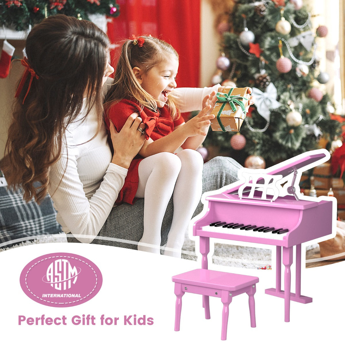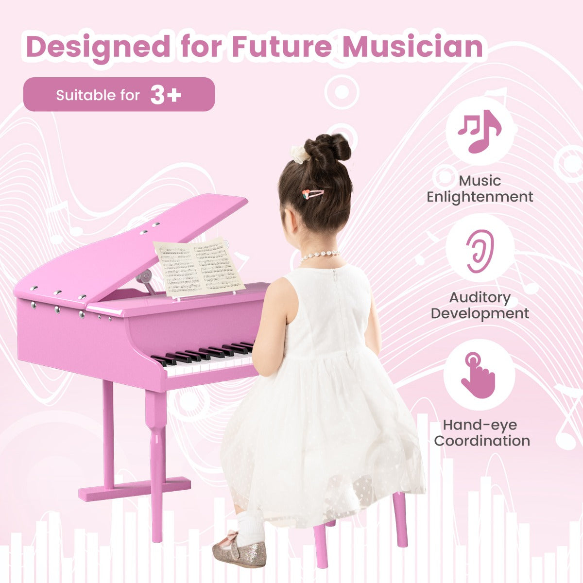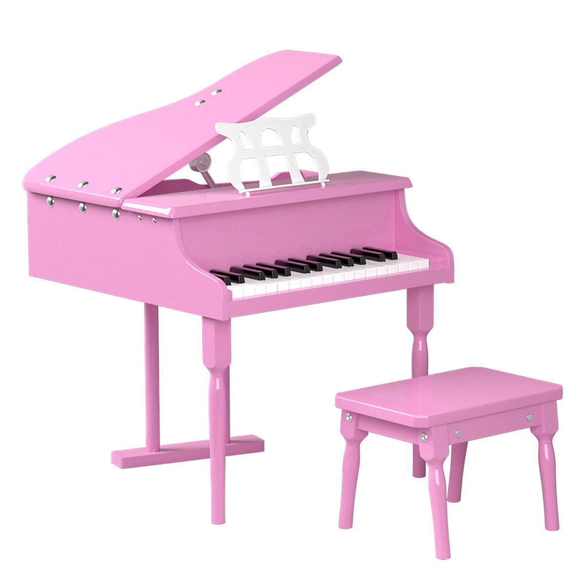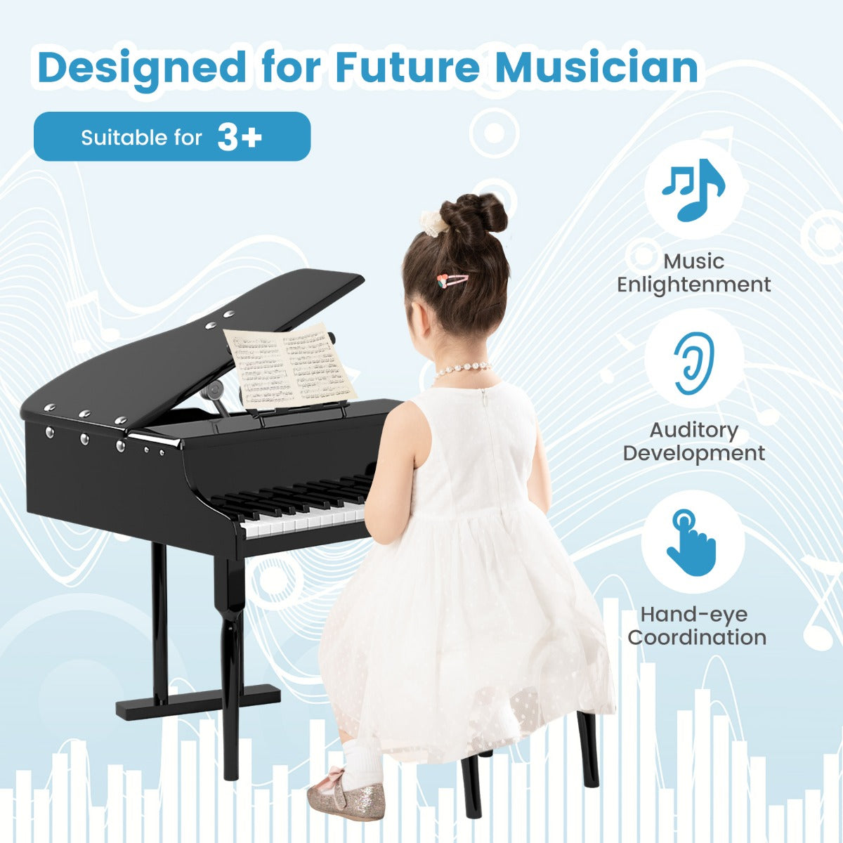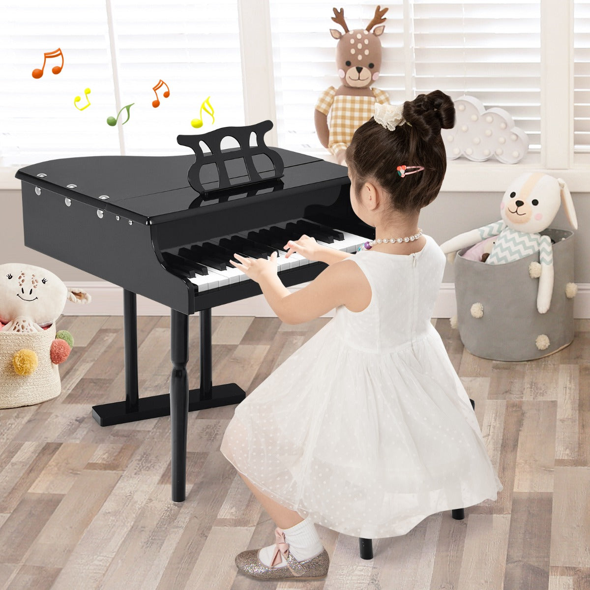 Easy Assembly & Elegant Look: Thanks to the simple construction and detailed instructions, this kids grand piano with stool can be put together easily. The stylish rivet design and clean lines deliver a sense of elegance and fashion. This musical toy is great for self-learning, party show, school performance, etc.