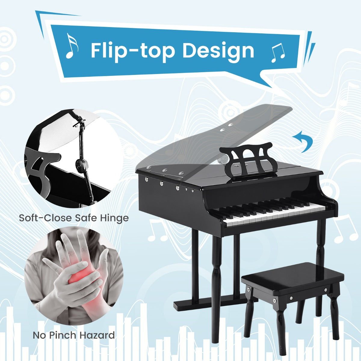 Safe & Thoughtful Details: Featuring a safe flip-over cover and durable metal hinge, this standing piano won't pinch your kid's fingers. Smooth rounded edges also protect your kid's hands from scratches. Plus, the thoughtful music stand makes it easy for kids to practice sheet music and immerse themselves in the world of music.