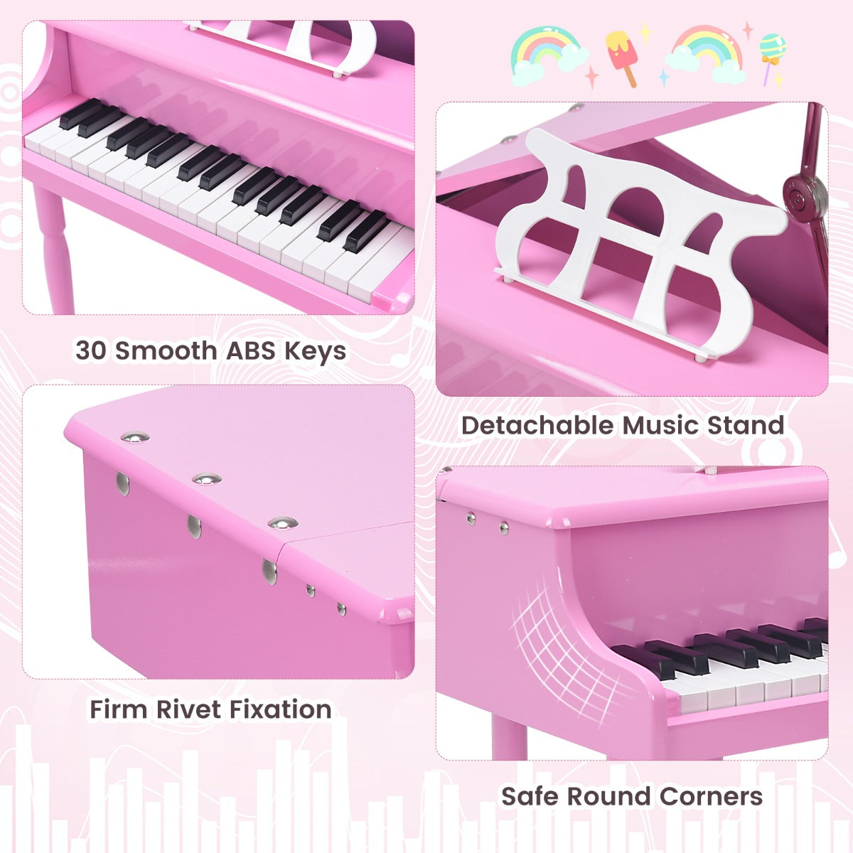 30 Keys Kids Classical Piano: Equipped with 30 black and white keys, this kids piano toy provides an ideal introduction to music for beginners. The professional design makes it perfect for your kids' finger size. This mini piano brings tons of musical fun to children and enables them to enjoy superior sound.