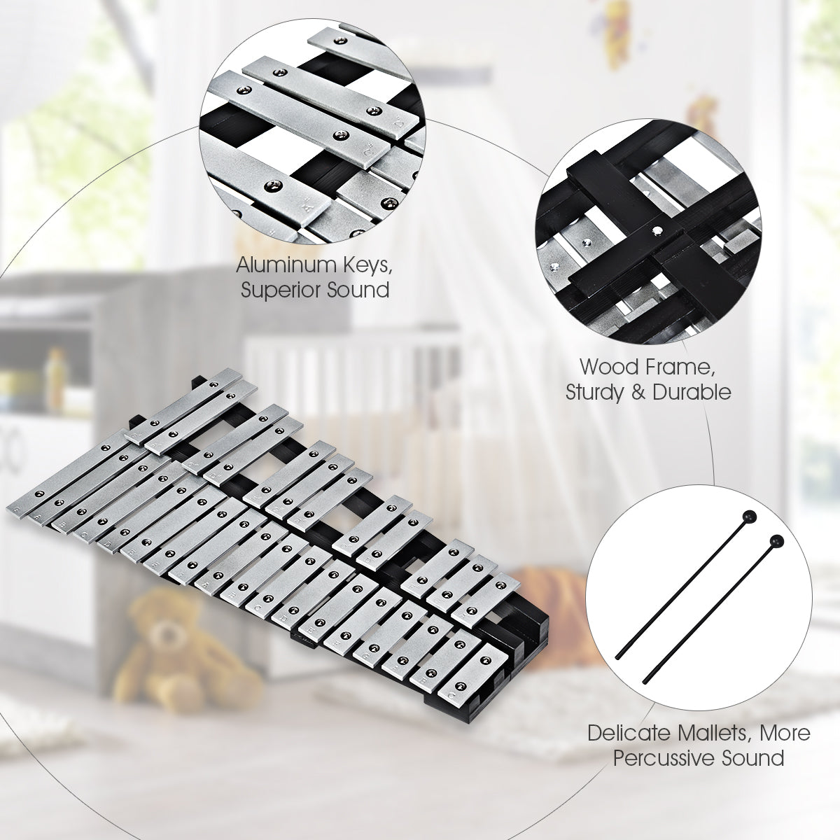 Material & Delicate Craftsmanship: Selection of aluminum plates to make 30 notes of the percussion glockenspiel, which is durable. The wooden base is natural and sturdy. Besides, after delicate treatment, the edge is smooth, which prevents people from being scratched.