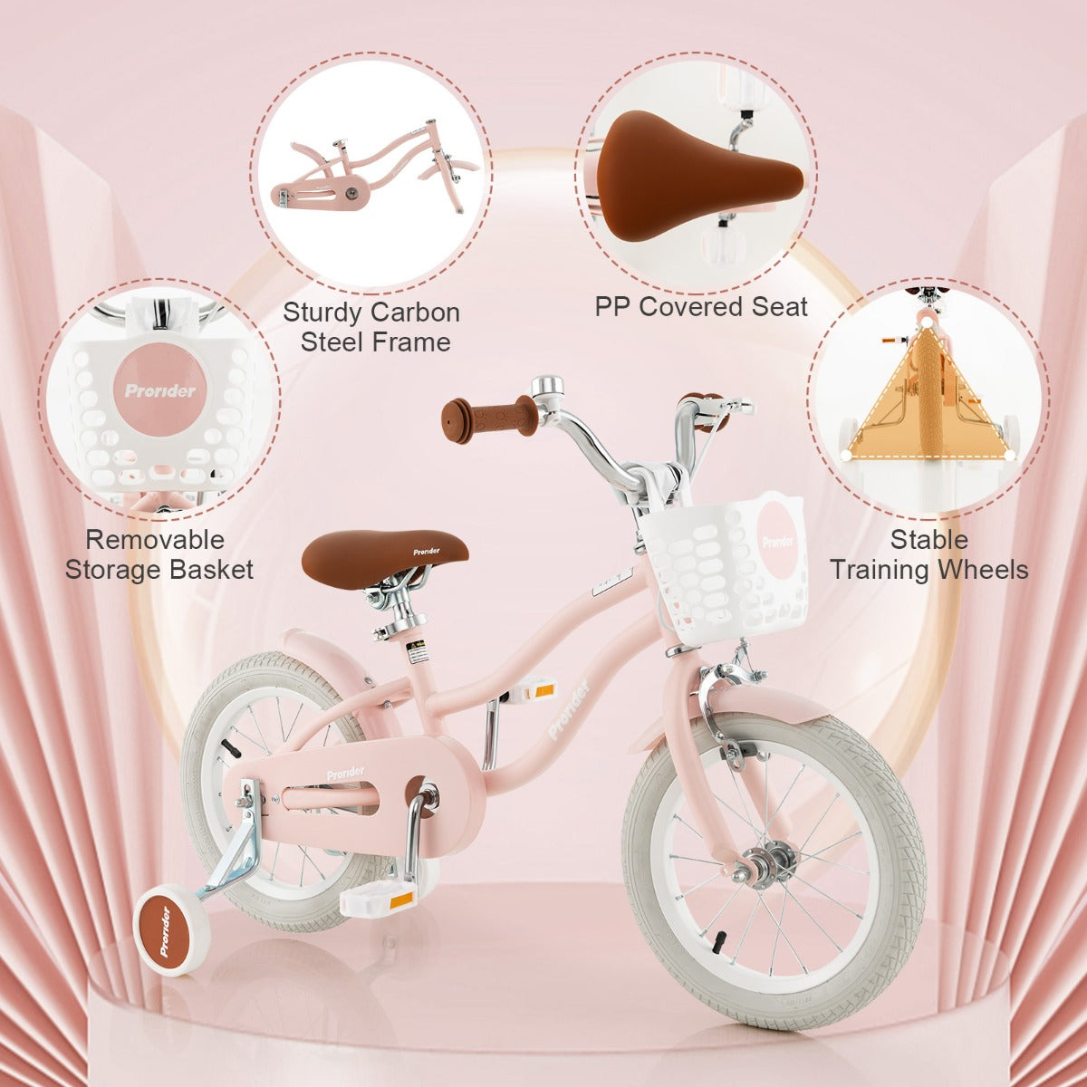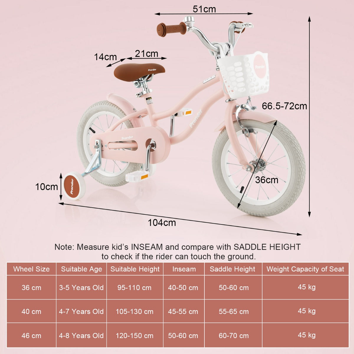 Our cute 36/40/46 cm children's bike will let your little one enjoy riding. Designed with an adjustable handlebar and seat height, it's suitable for 4-8 years old kids or toddlers with 95-110/105-120 cm/130-150 cm height. Note: Measure the kid's INSEAM...View More