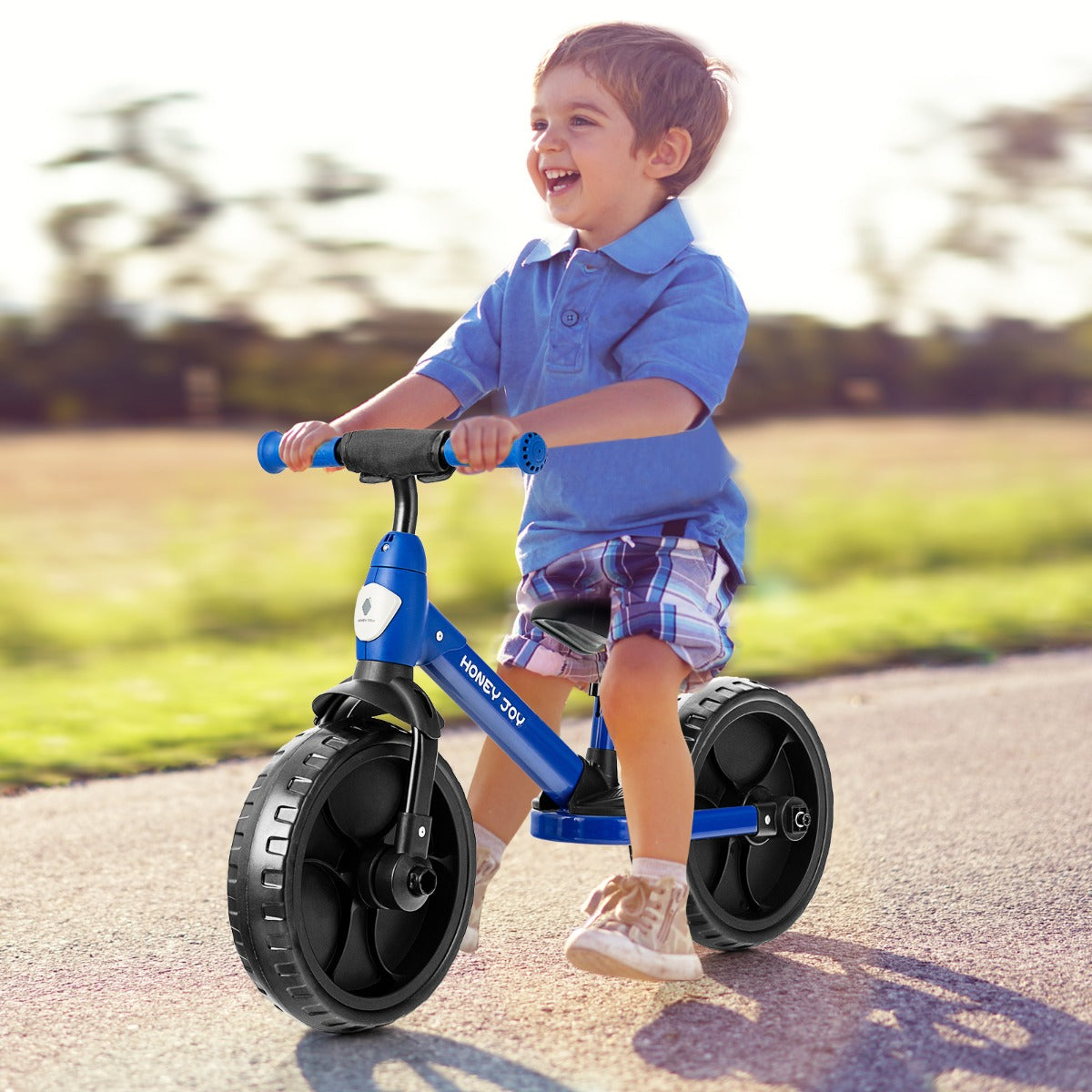 Our kids tricycle is suitable for 2-6 years old kids. It has 4 different modes for kids to use: 2-wheel balance bike, tricycle, bicycle and auxiliary balance bike. Kids can promote their physical fitness, self-confidence, balance ability and hand-eye coordination during riding. Besides, our balance bike is also designed with height-adjustable handlebar(55 cm/59 cm) and seat(36.5-44.5 cm), which is ideal for kids of 85-110 cm. What's more, the handlebar has a limited steering of 120 degrees to prevent rollover. To offer kids smooth riding experience, the kids balance bike is equipped with light and wear-resistant EVA wheels, which can run on cement road, wood floor, grassland and asphalt road. On the other hand, we also design it with soft PU seat, cushioned handlebar and footrest design for more comfort. And the carbon steel frame also keeps it durable and sturdy.